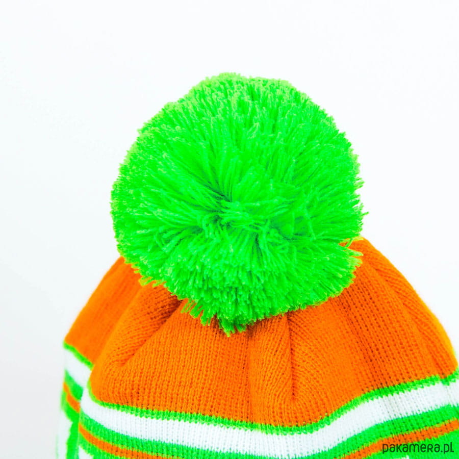 Charakteryzuje ją intensywny zielony kolor i pomarańczowe akcenty. Jest to tzw. czapka szyta na 6 (posiada 6 szwów na górze), co sprawia że idealnie przylega do głowy i nie odstają jej rogi. Wykonana została z elastycznej dzianiny akrylowej, dzięki czemu jest bardzo miękka i przyjemna w dotyku. Czapka z pomponem posiada rozmiar uniwersalny. Dobrze będą w niej wyglądać zarówno Panie, jak i Panowie.