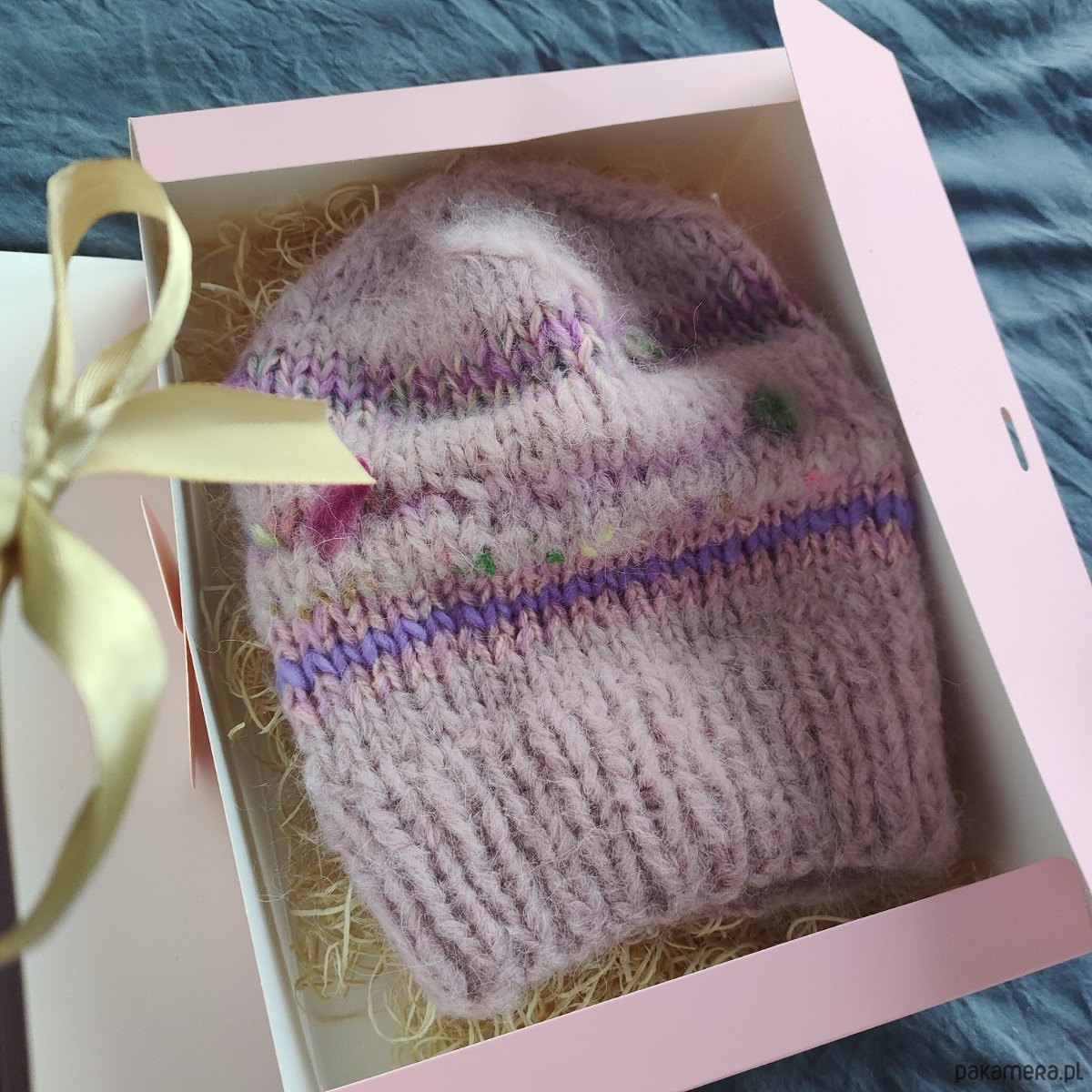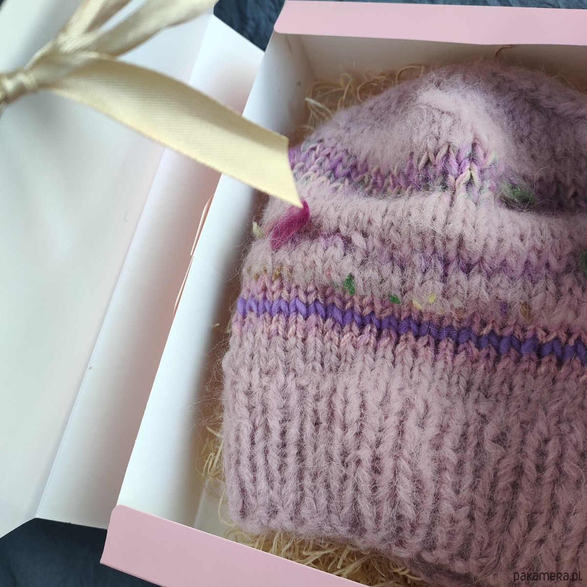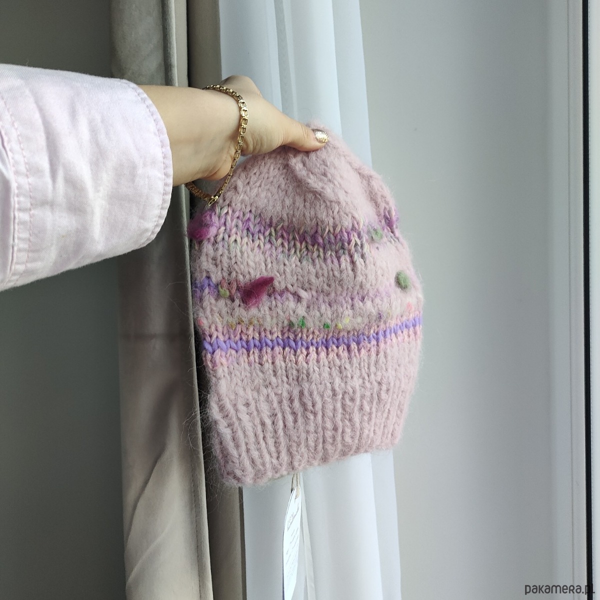 Fantazyjna czapka z naturalnych włóczek o pięknym delikatnym designie. Jedyny unikatowy egzemplarz.
