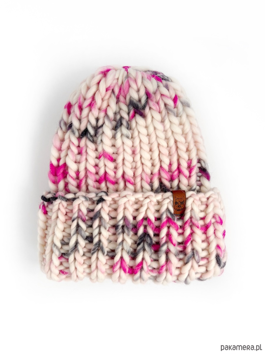 Czapka zimowa oversize z grubej wełny różowo szaro biała