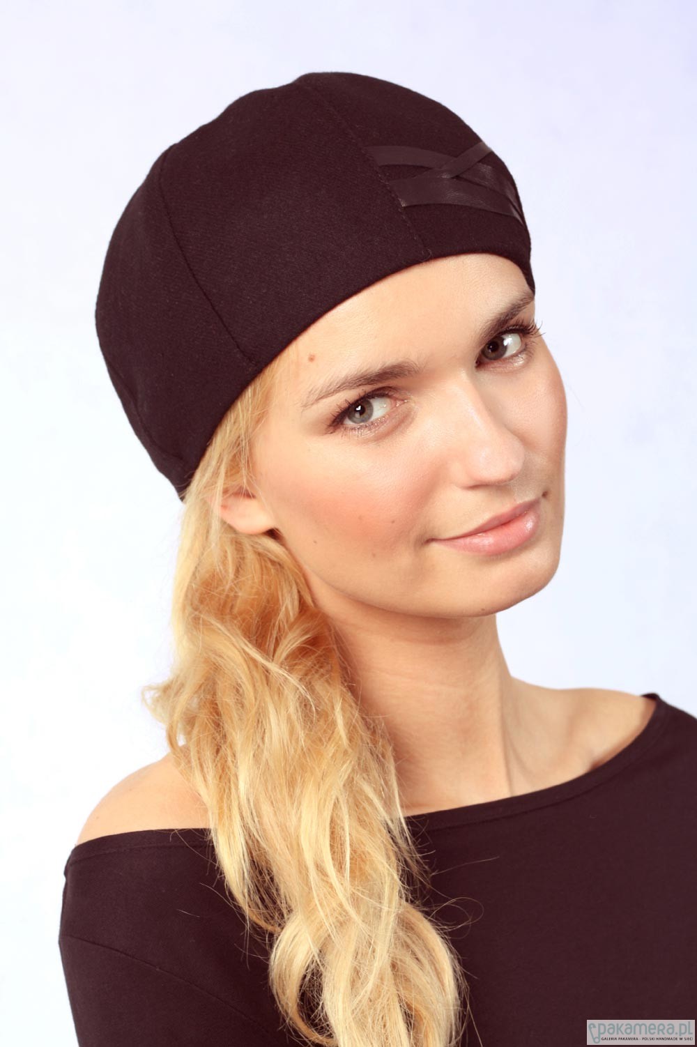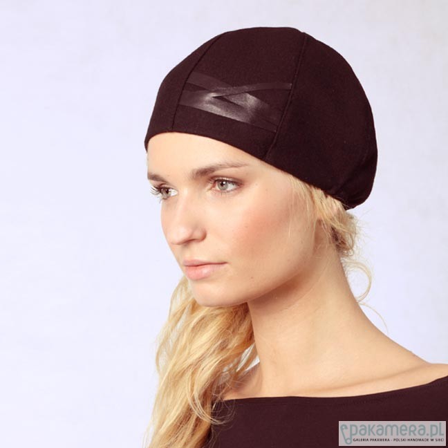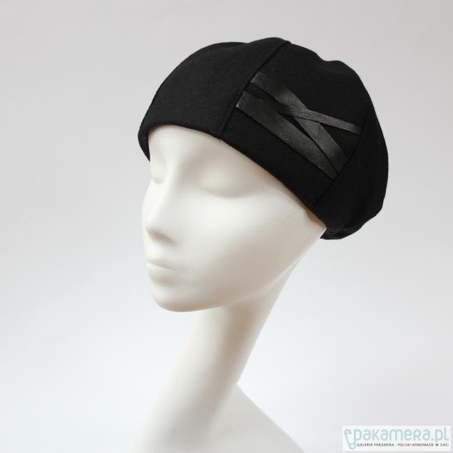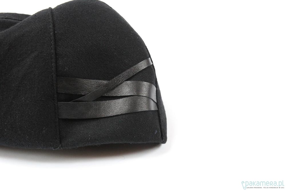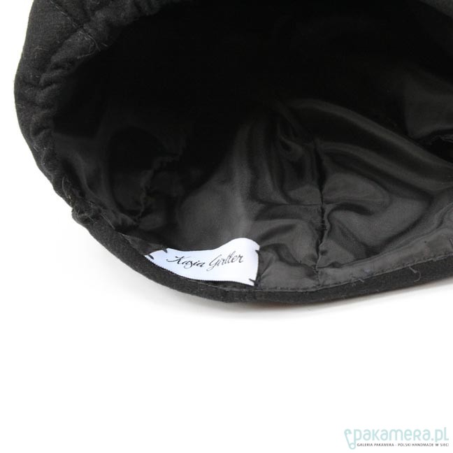 Czapka/beret uszyty z tkaniny wełnianej i ozdobiony elementem skórzanym. Jest wykończony podszewką. Rozmiar: obwód głowy 56-57cm. Chetnie wykonam w innym rozmiarze.