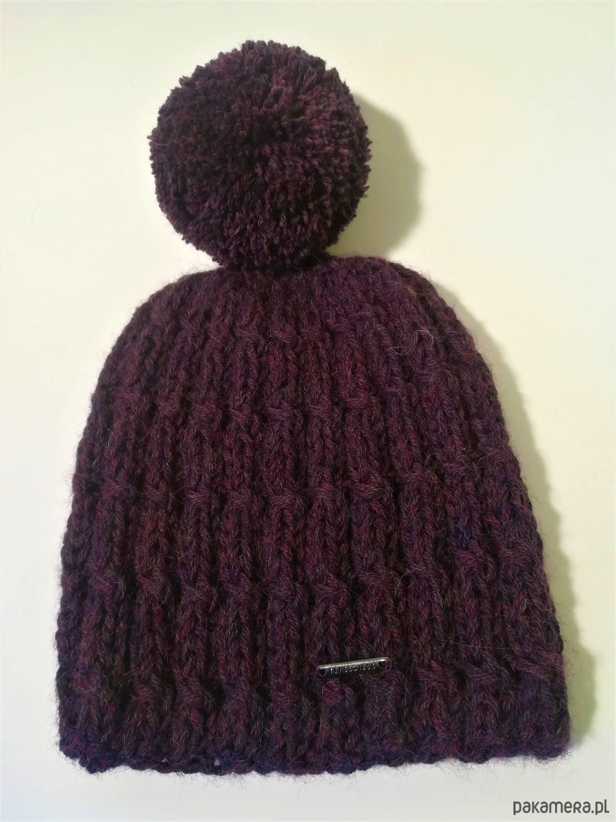 Ręcznie zrobiona na drutach czapka z bardzo miękkiej i miłe , naturalnej włóczki , alpaki peruwiańskiej w kolorze oberżyny ( melanż).Zrobiona ściegiem ściągaczowym z elementami drobnych warkoczy. Ozdobiona pomponem.