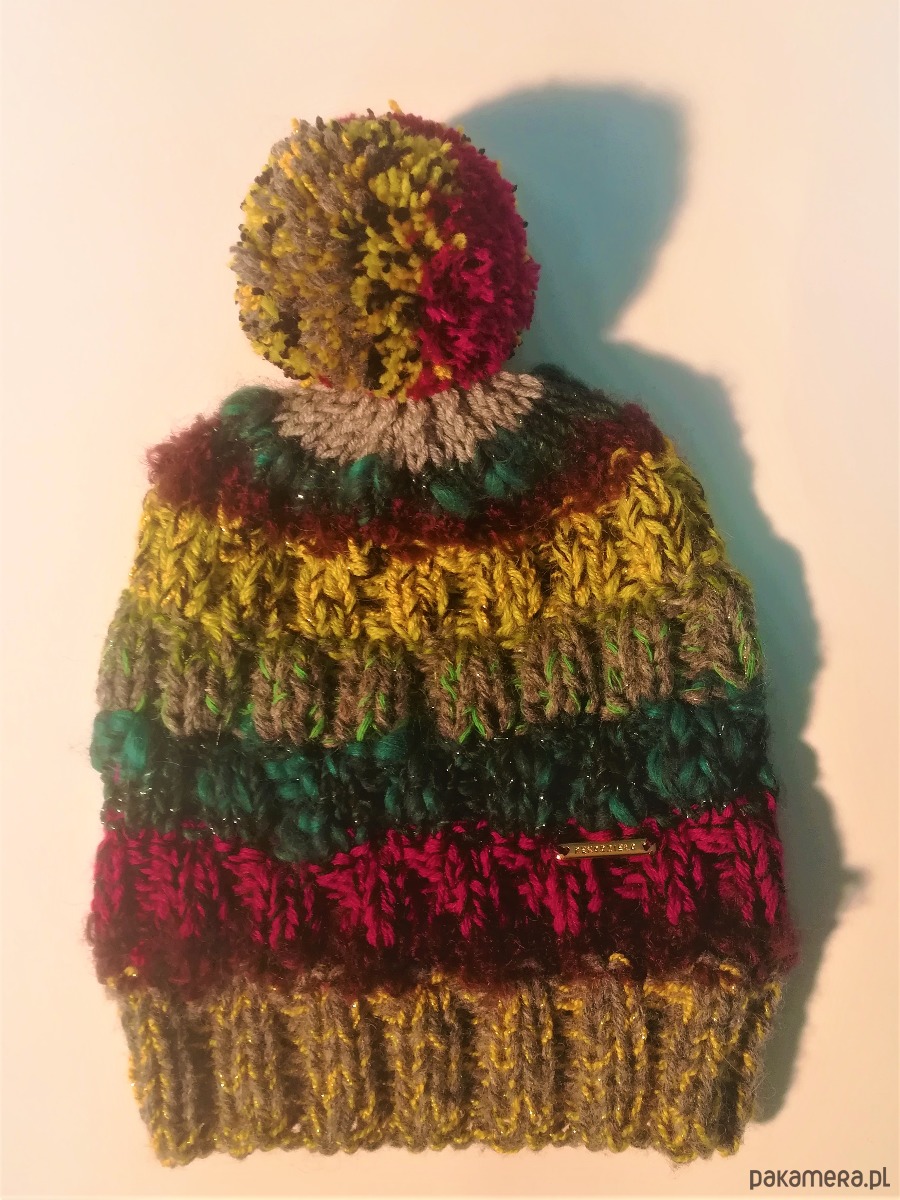 Ręcznie zrobiona na drutach czapka w paski w żywych ,wesołych kolorach. Zrobiona reliefowym ściegiem ściągaczowym, ozdobiona pomponem. Możliwe jest wywinięcie mankietu. Niektóre włóczki z dodatkiem błyszczącej nitki.