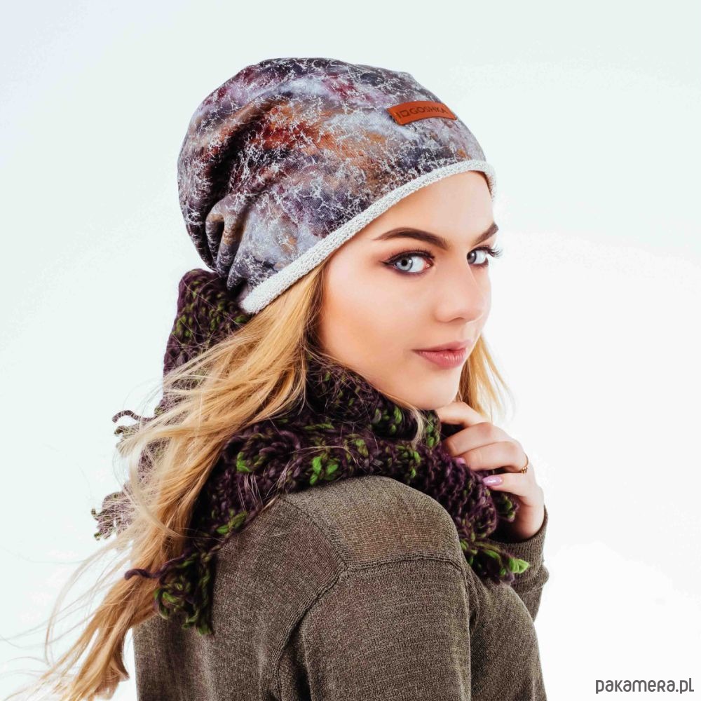 Czapka wykonana z dzianiny dresowej. Strona zewnętrzna pokryta nadrukiem imitującym "marmur”, wewnątrz splot pętelkowy. Naszywka wykonana z ekoskóry. Model idealnie sprawdzi się w duecie z praktyczną parką czy klasyczną kurtką jeansową.