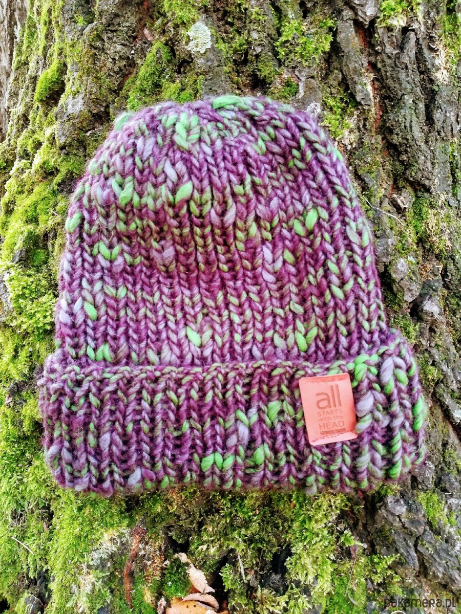 Czapka wykonana z grubej, kolorowej przędzy. Czapka idealnie pasuje do puchowej kurtki lub płaszcza typu blezer.