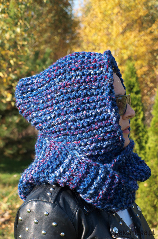 Ciepły komin z kapturem w kolorze granatowym przeplatanym białymi i bordowymi nitkami. Idealny nie tylko na chłodne dni :) Hand made. Dla niej i dla niego.
