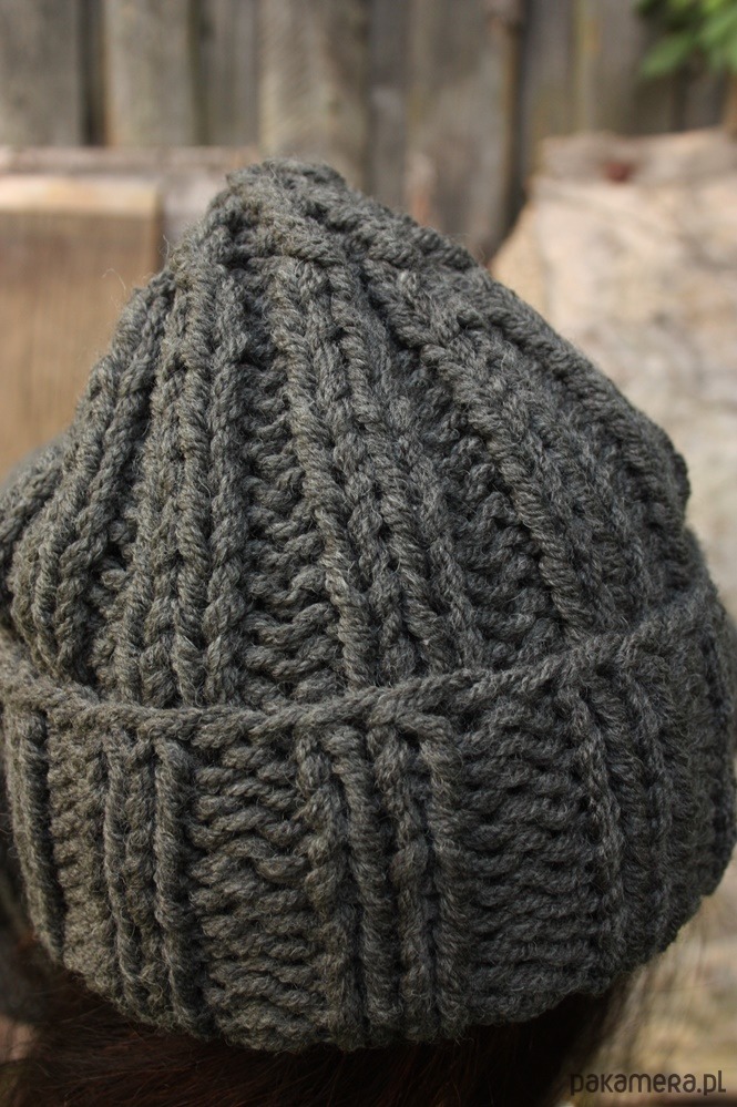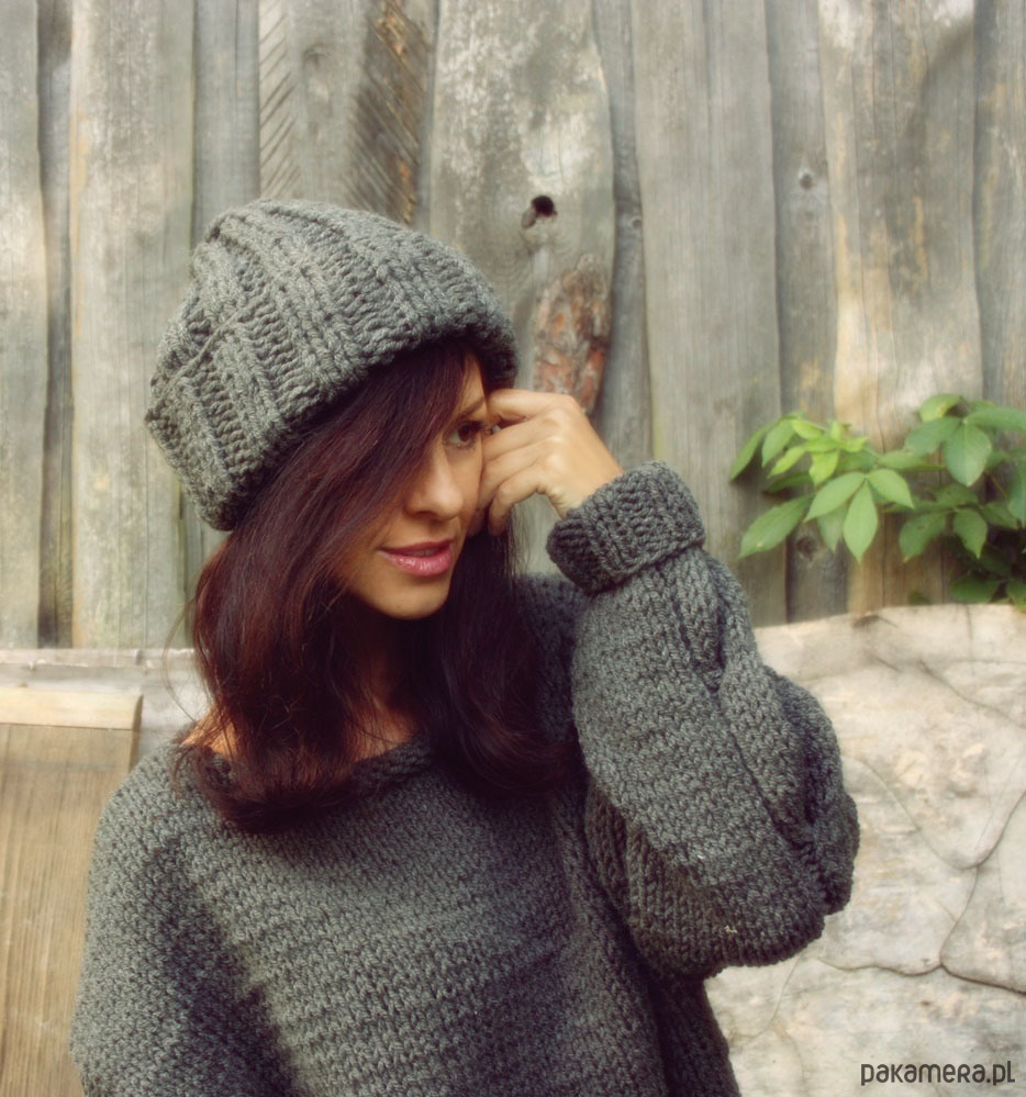 Ręcznie wykonana,gruba, mięsista czapka w kolorze szarym(jasnym).Mieszanka z wełną.
