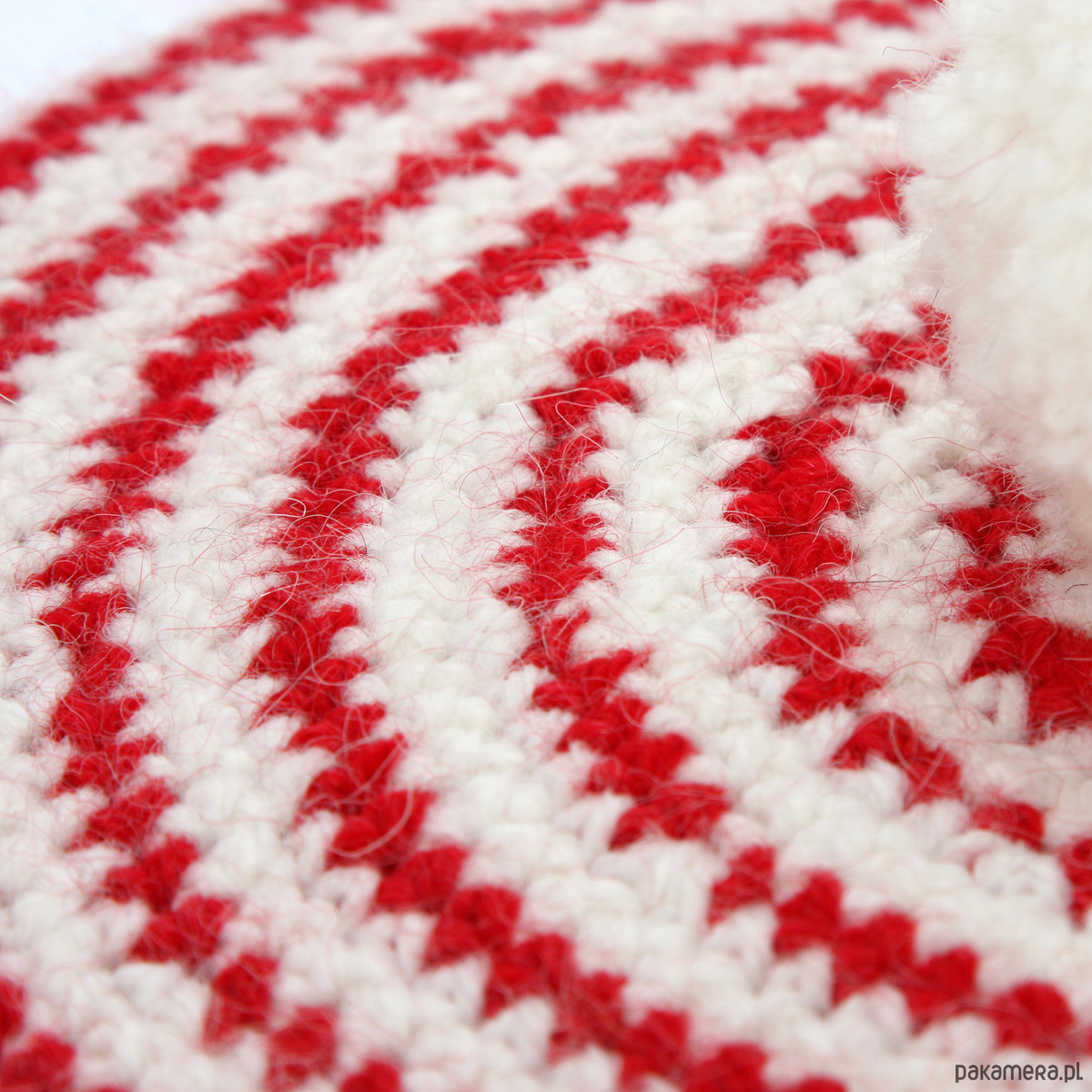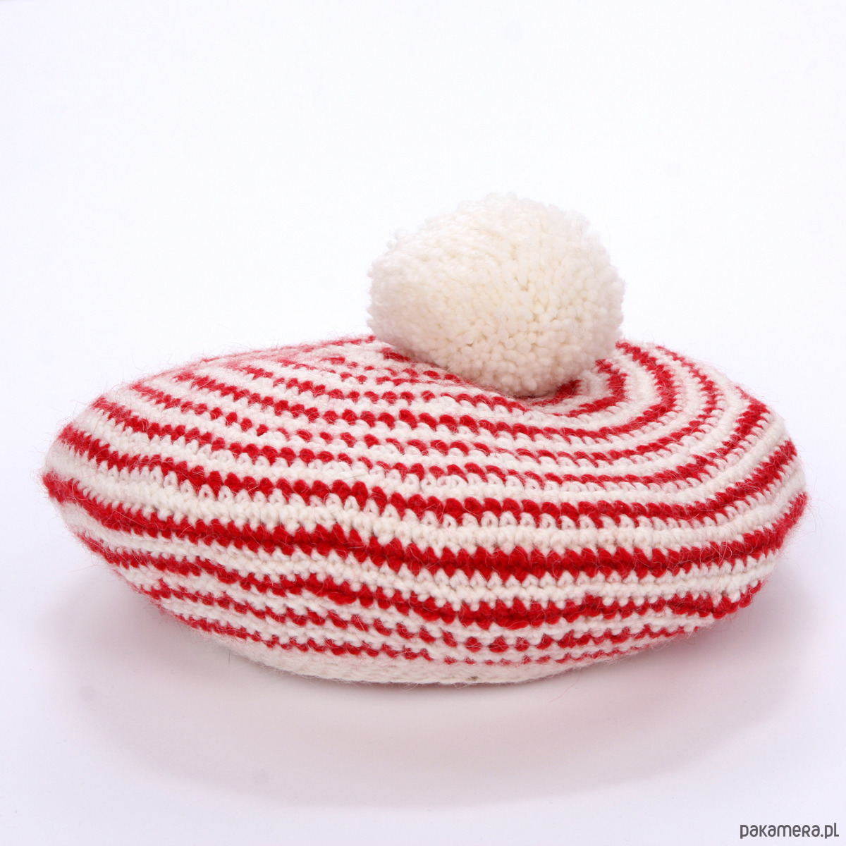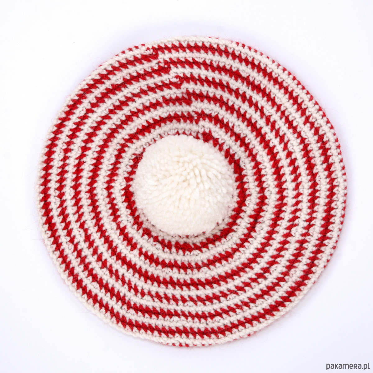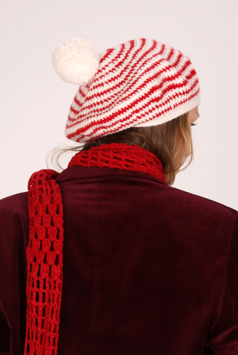Unikatowy beret zrobiony ręcznie na szydełku z dwoch kolorów włóczek:czerwonej i białej. Plastyczna forma dobrze układająca się na głowie.