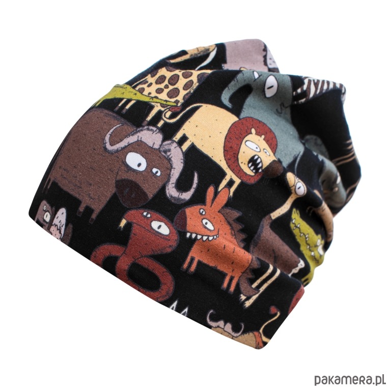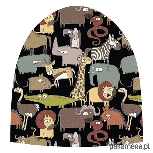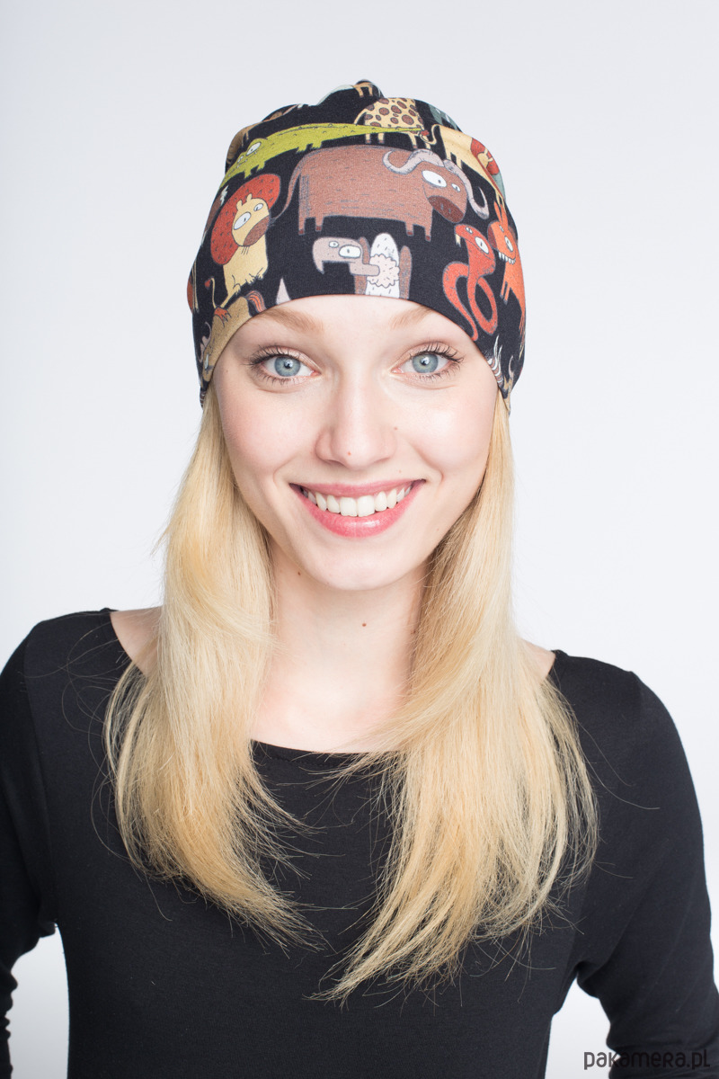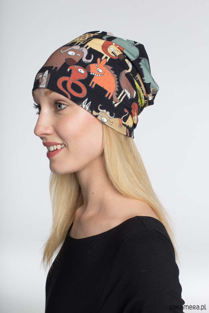 Czapka z bawełnianego, elastycznego materiału z nadrukiem full print 96% bawełna + 4% elastan, dwustronna - wewnątrz drukowane cienkie paseczki łączące się kolorystycznie z nadrukiem wierzchnim.