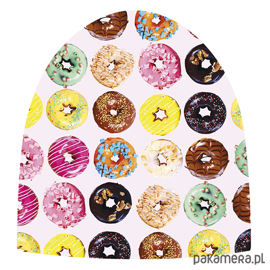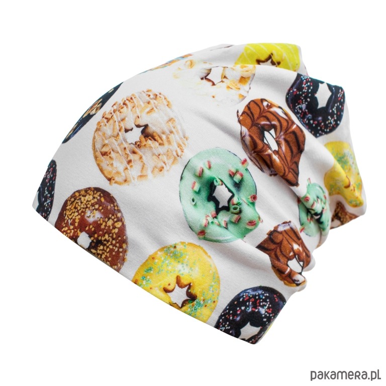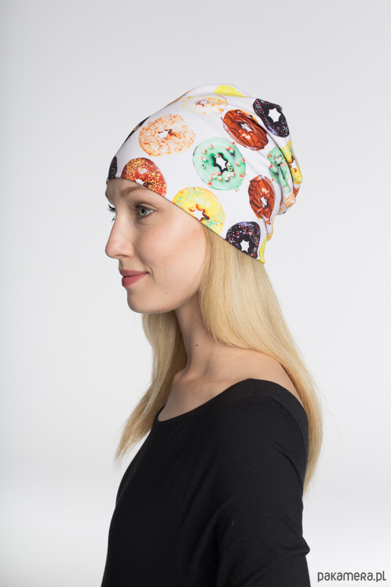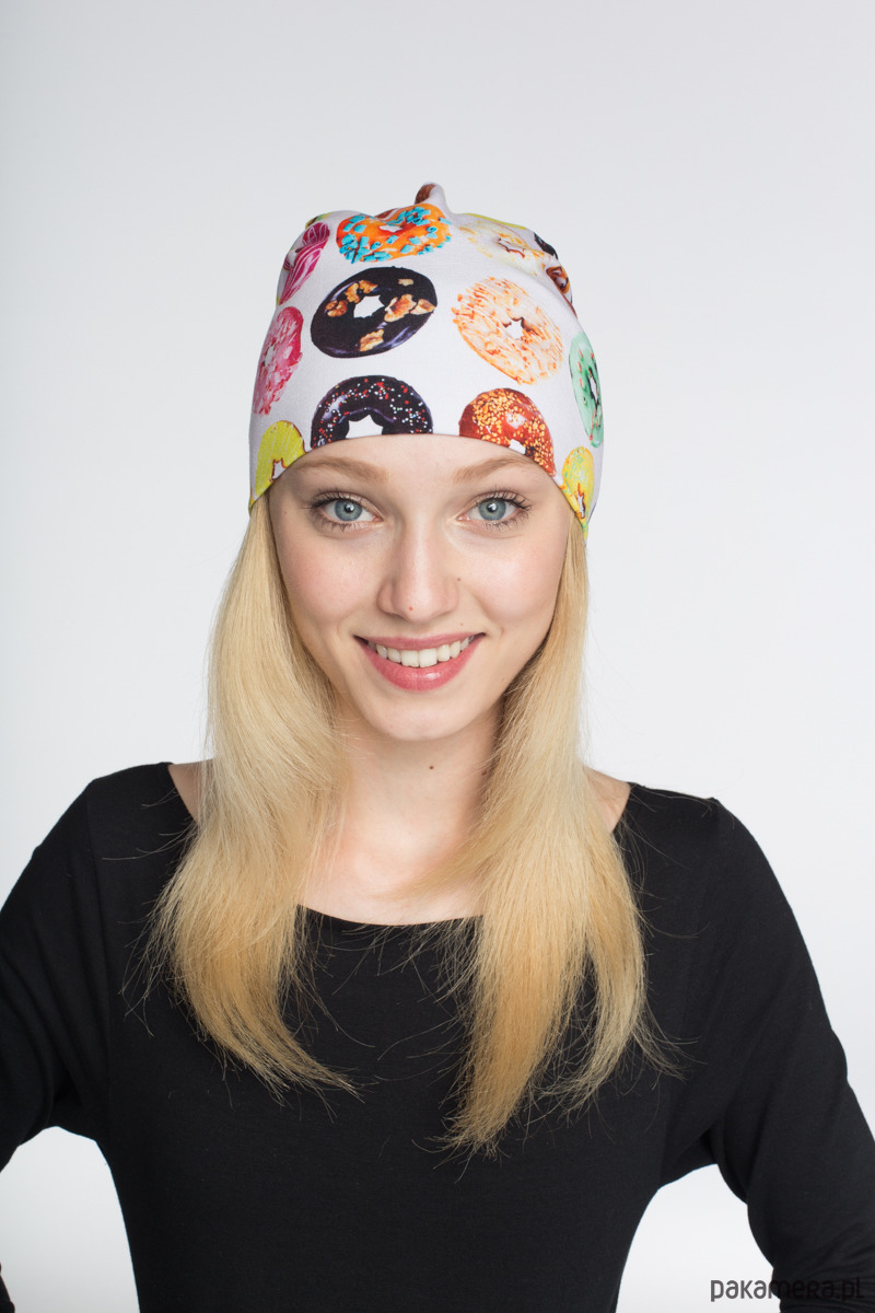 Czapka z bawełnianego, elastycznego materiału z nadrukiem full print 96% bawełna + 4% elastan, dwustronna - wewnątrz drukowane cienkie paseczki łączące się kolorystycznie z nadrukiem wierzchnim.