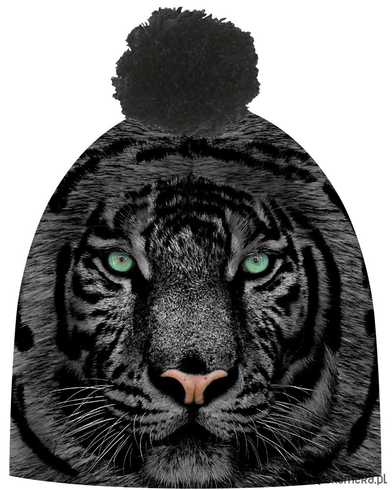 Z przodu znajduje się grafika głowy tygrysa na szarym tle, tył szary.