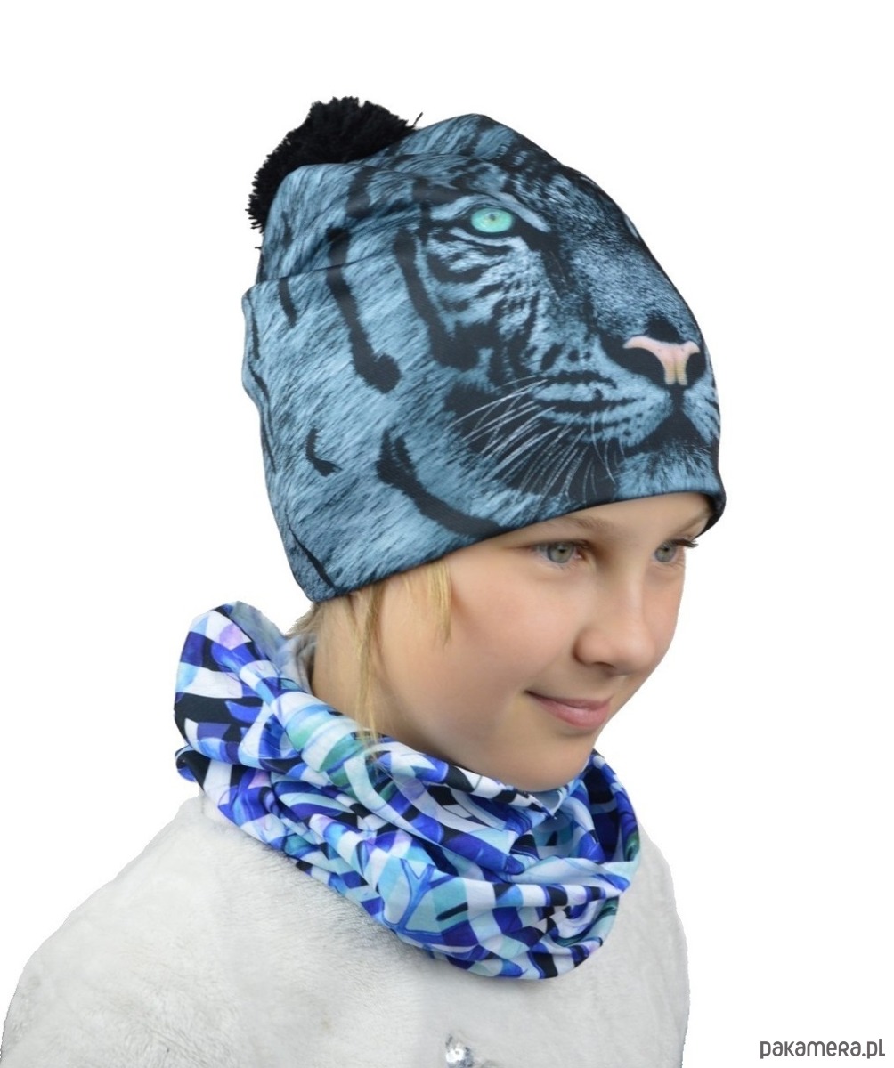 Czapka z dzianinowym pomponem z elastycznego materiału z nadrukiem 100% poliester, od środka podszyta ciepłym micropolarem.
