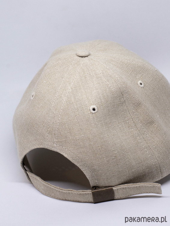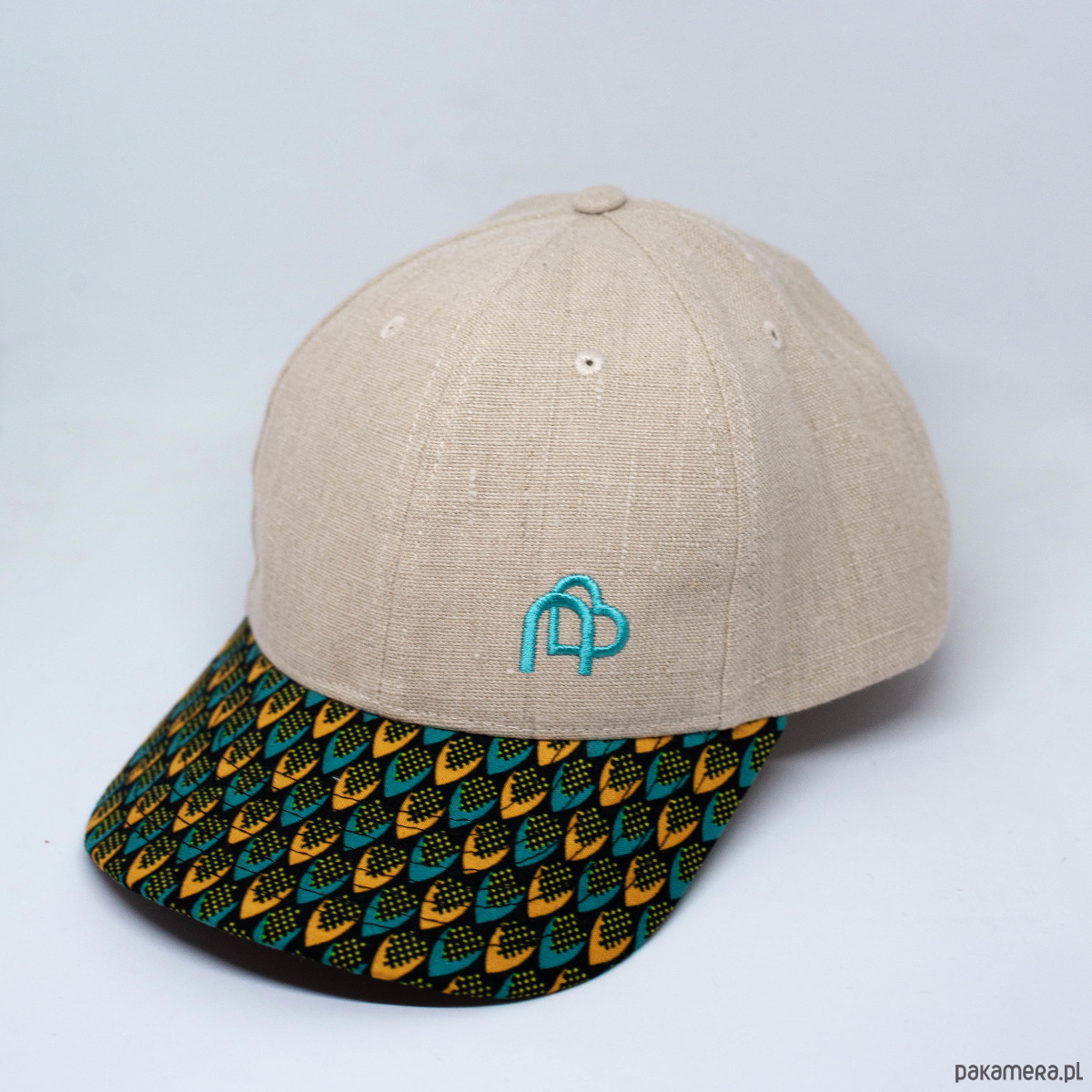 Czapka z daszkiem z konopii z afrykańskim wzorem . Główna część czapki wykonana jest z naturalnej, niebarwionej tkaniny z konopii (konopie 100%), daszek od góry jest bawełniany (bawełna 100%), od dołu konopny, ale czarny (zdjęcie spodu to zdjęcie innego modelu, ale w tym jest analogicznie). Czapka podszyta jest na przednich panelach bambusem. Posiada turkusowy haft.