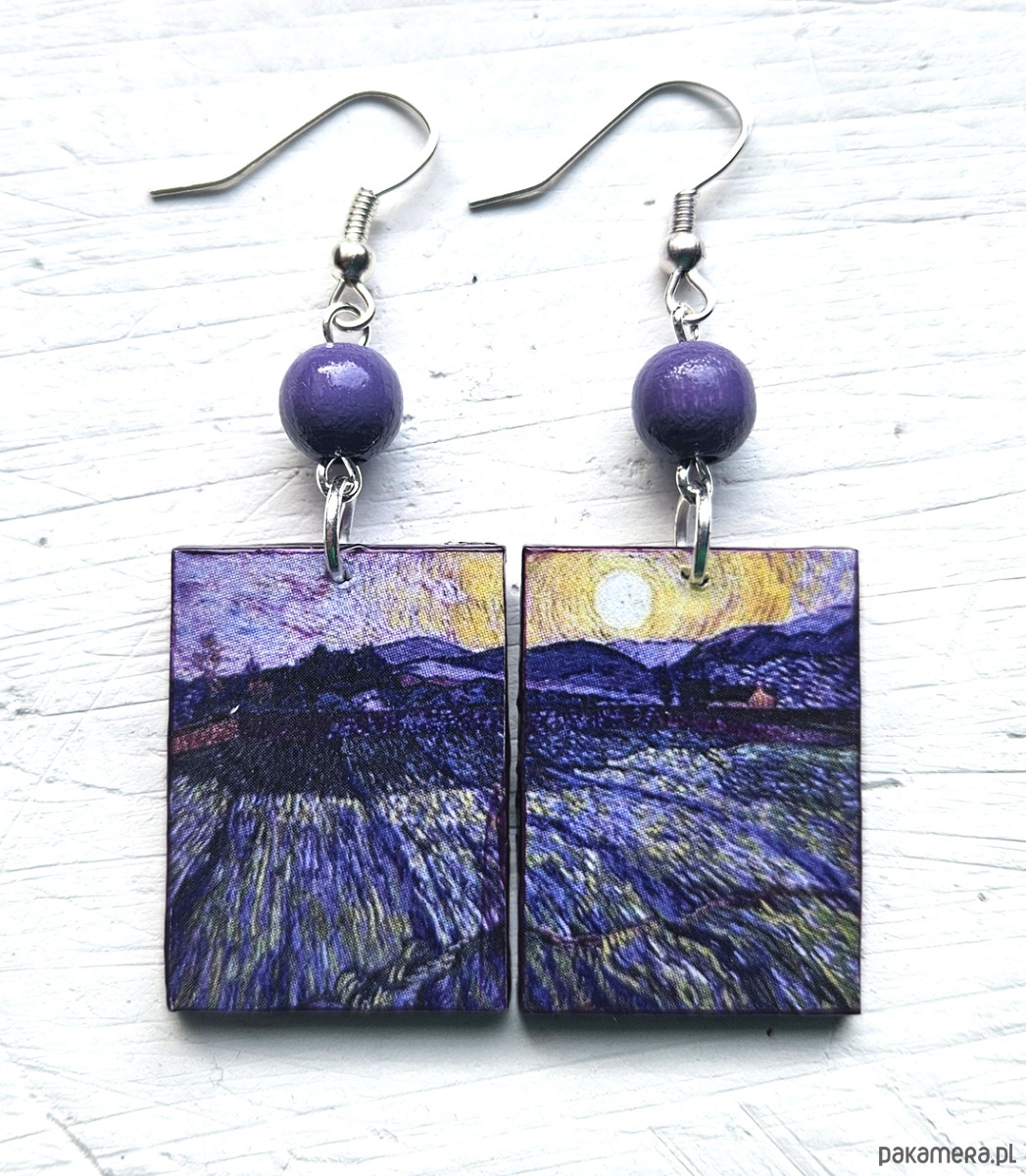kolczyki drewniane, ozdobione metodą decoupage, dwustronne, starannie wykończone farbami akrylowymi i zabezpieczone wielokrotnie lakierem, koraliki drewniane, bigle posrebrzane, długość kolczyków bez bigli: 5 cm, szerokość: 2,2 cm, bardzo lekkie