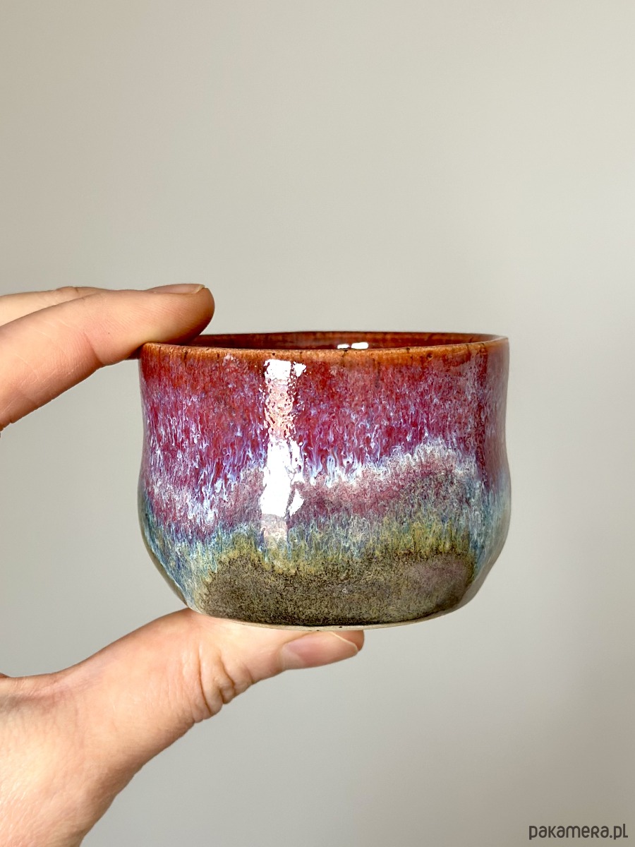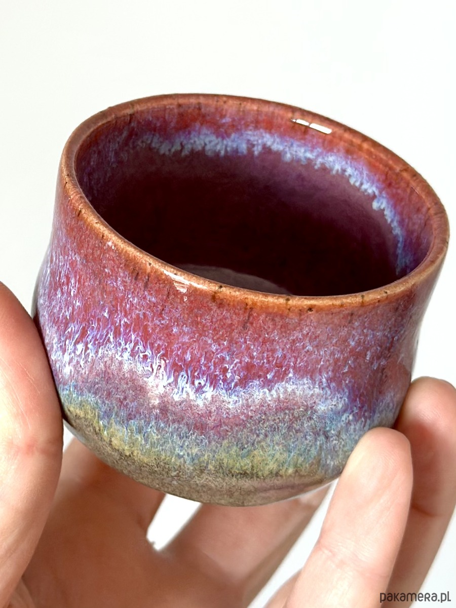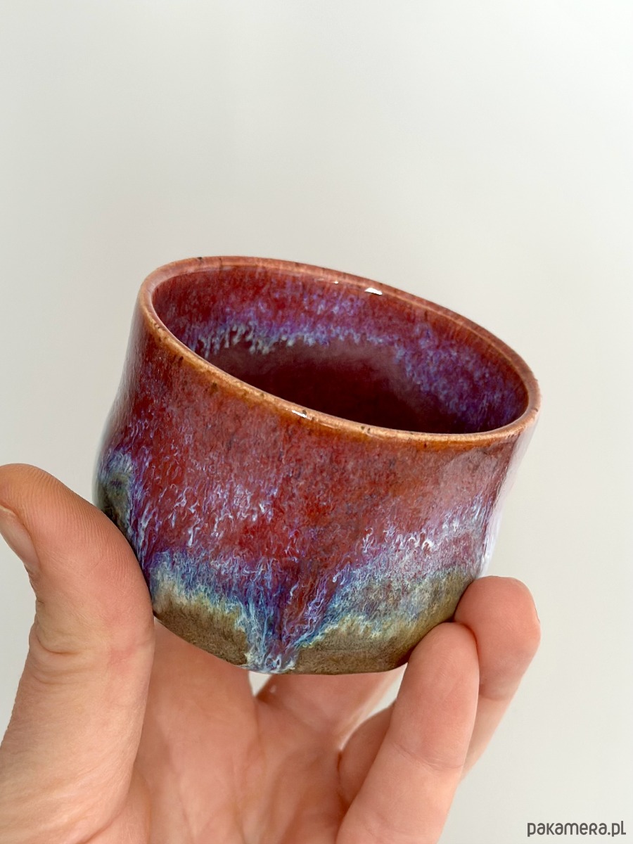 Wyjątkowa, ręcznie formowana czarka o niepowtarzalnym charakterze. Pokryta efektownym szkliwem w odcieniach głębokiej czerwieni, fioletu i subtelnych przejść w niebiesko-zielone tony przy podstawie. Każdy egzemplarz jest jedyny w swoim rodzaju – wzór i układ kolorów są absolutnie unikalne.
