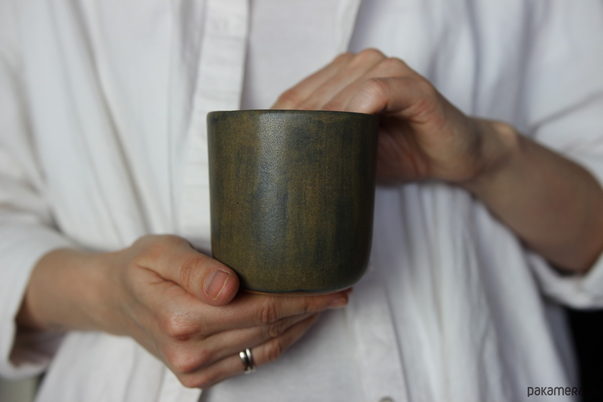 Naczynie zostało wykonane z gliny kamionkowej i pokryte matowym szkliwem w odcieniach głębokiego brązu wpadającego w czerń. Na powierzchni naczynia występują beżowe przebarwienia.