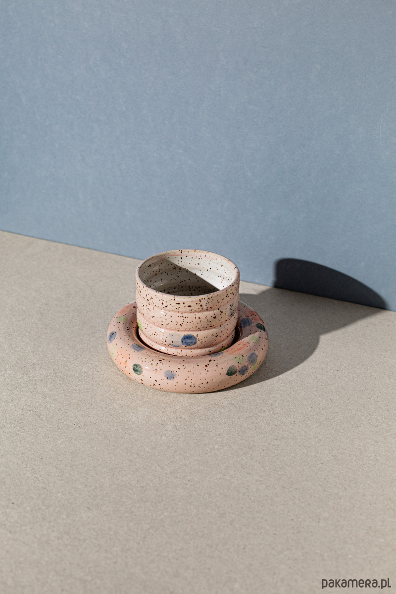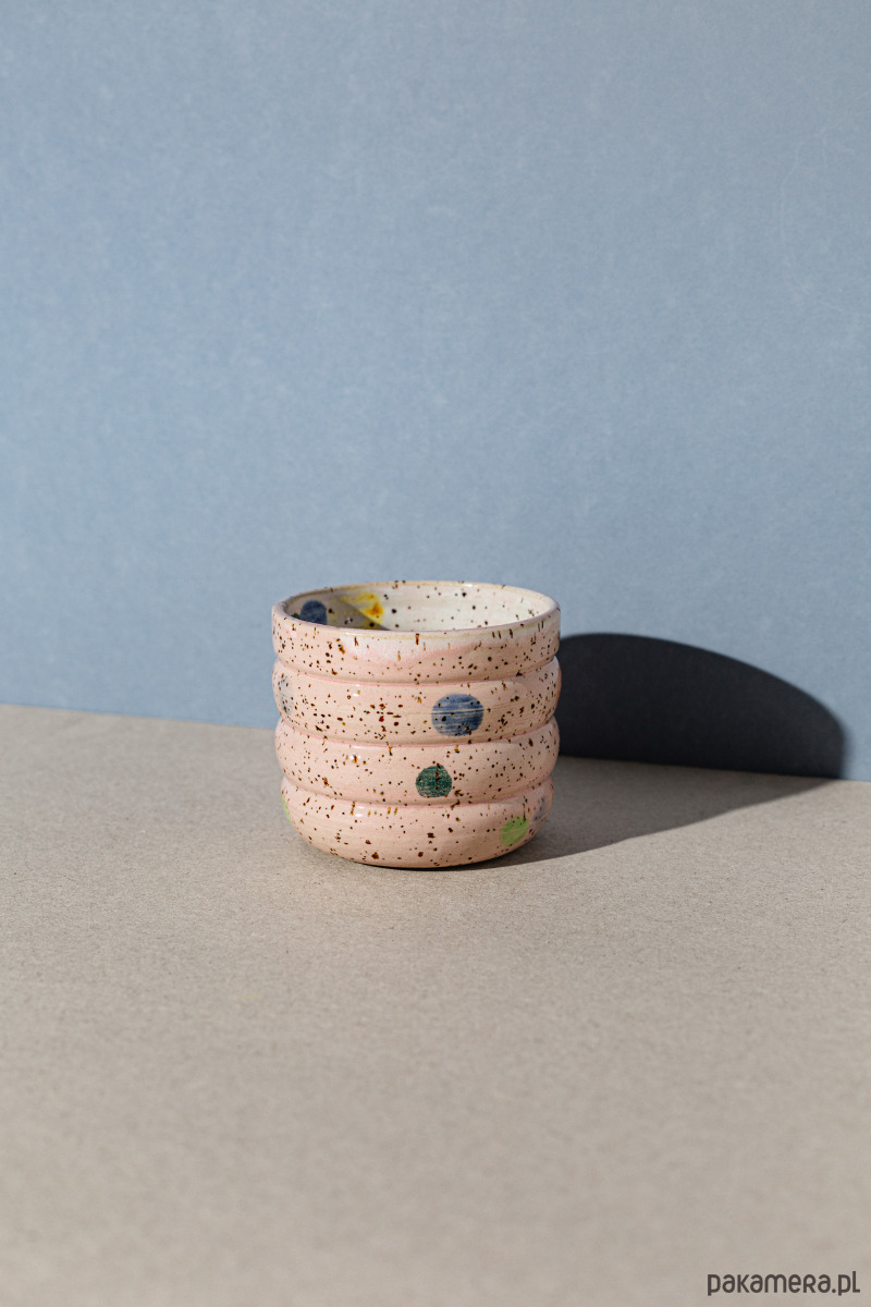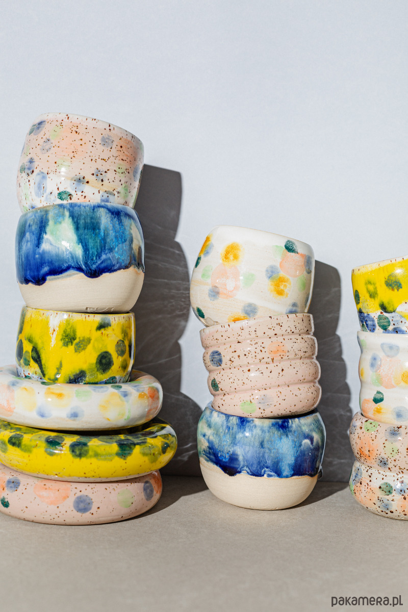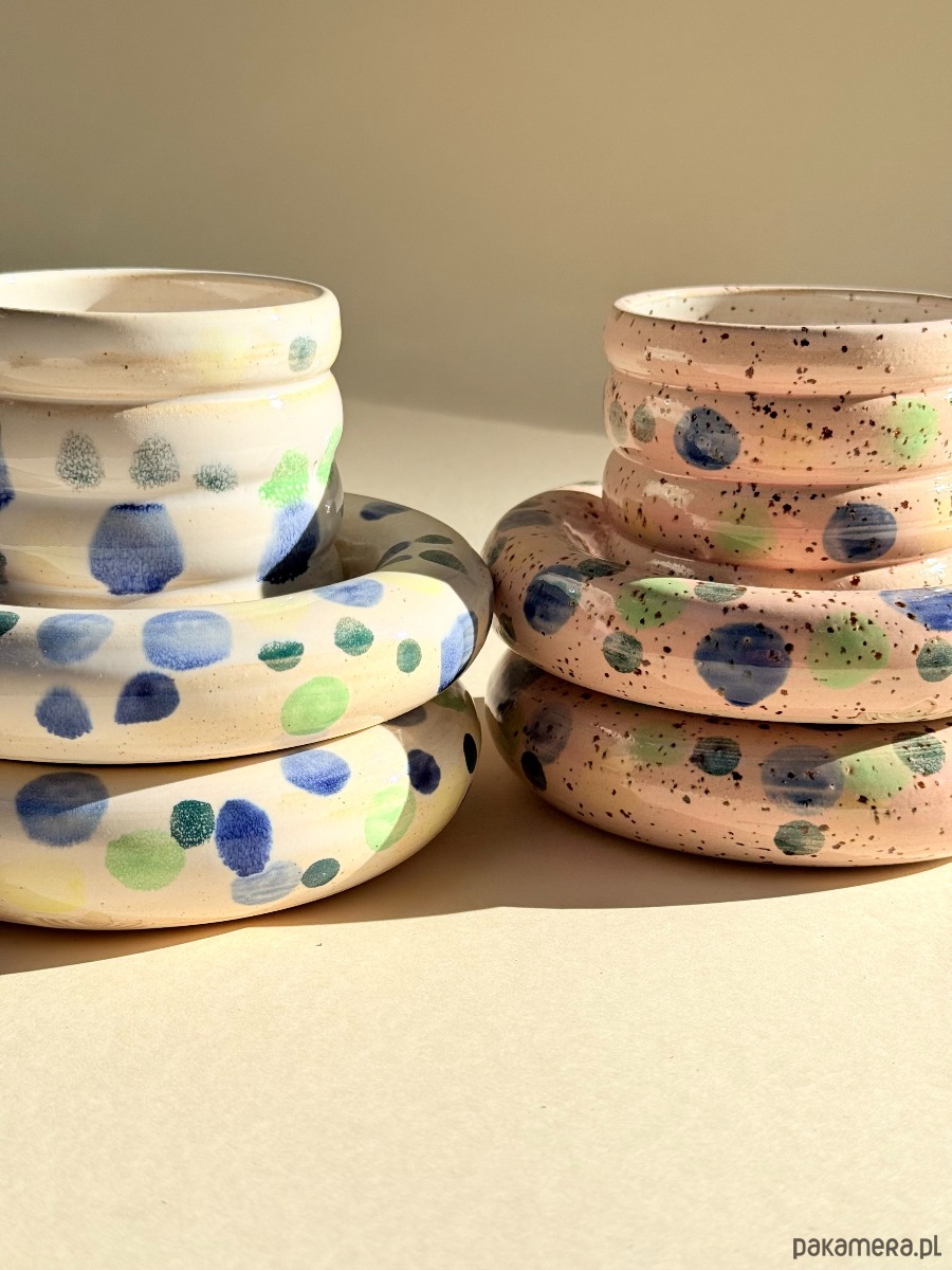 Szkliwa nakładane są ręcznie więc mogą się od siebie nieznacznie różnić. Na piegowatą glinę nałożone zostało za pomocą pędzla jasnoróżowe szkliwo, a następnie za pomocą gąbeczek kolorowe (granatowe, miętowe, ciemnoturkusowe i cytrynowe) plamki.