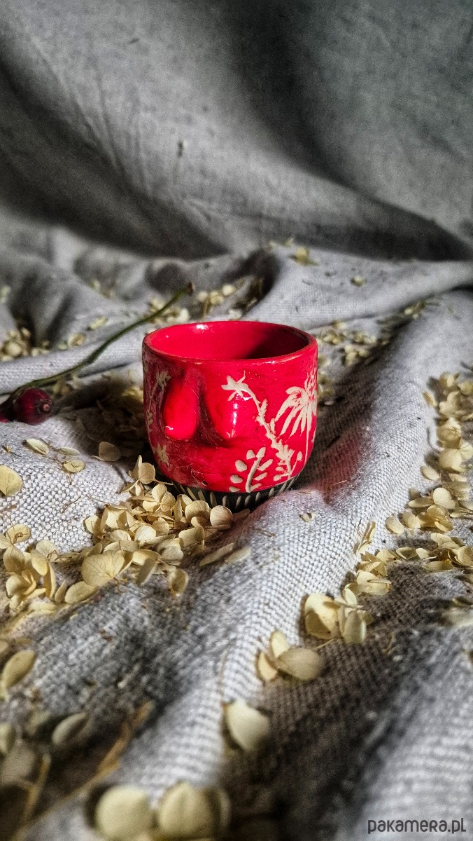Czarka mała na herbatkę lub espresso, 70ml. Czarka wykonana metodą sgraffito. Motyw dnia, kwiaty, leśne trawy oraz pszczoła. Czerwona czarka w połączeniu z czernią. Toczona na kole, ręcznie rzeźbiona i wydrapywana.