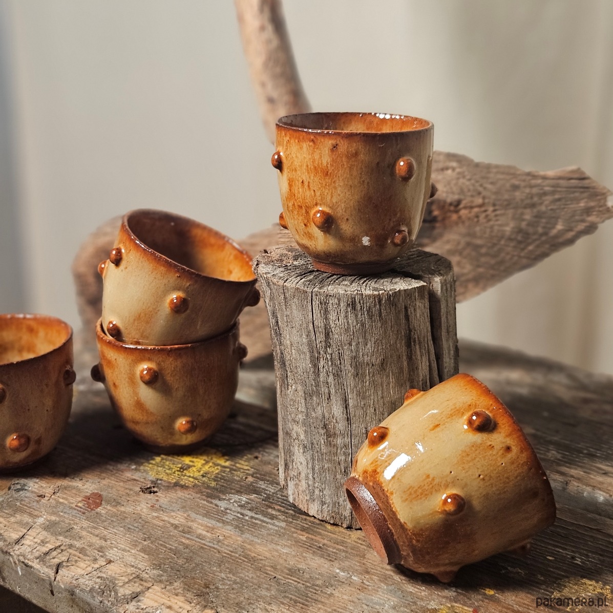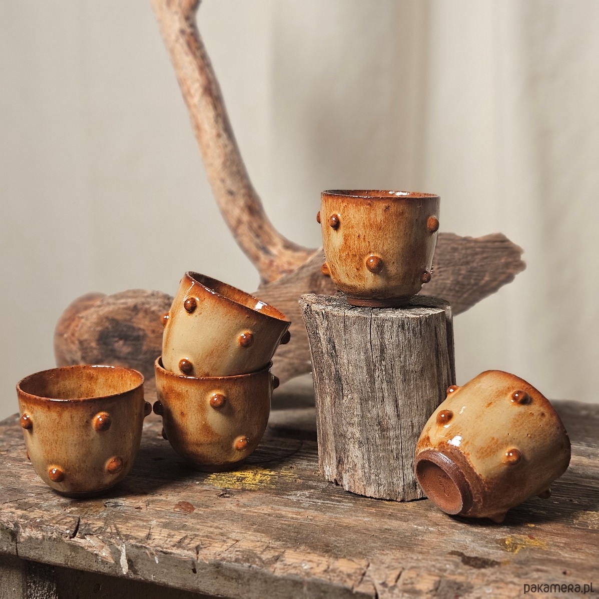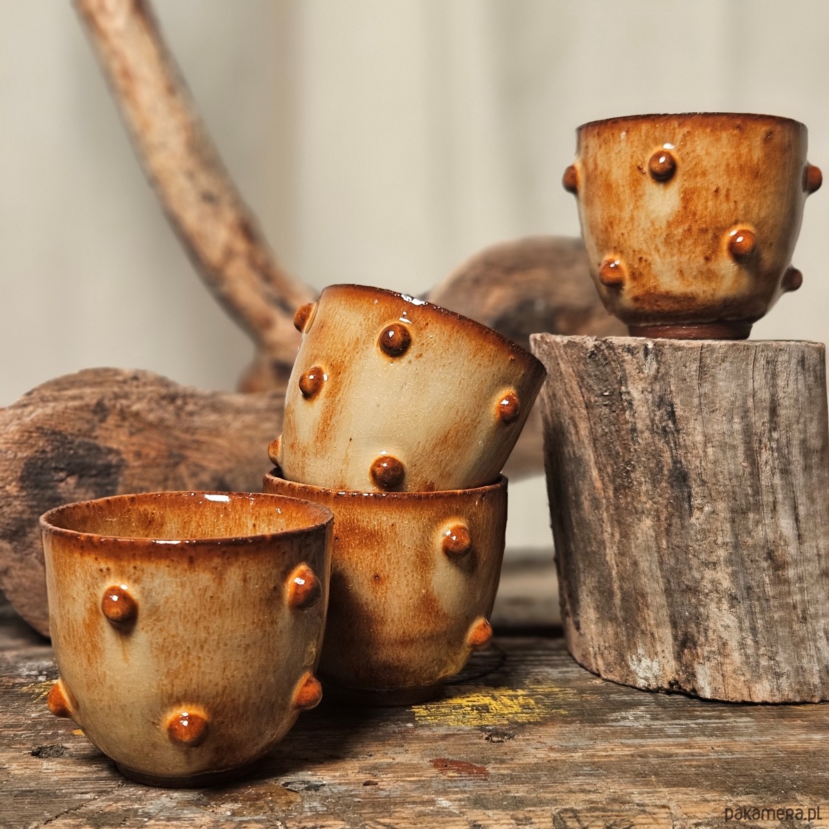 Mała czarka na stopce, ozdobiona drobnymi kuleczkami i pokryta rdzawo-pomarańczowym szkliwem. Doskonała na podwójne espresso albo łyk zielonej herbaty.