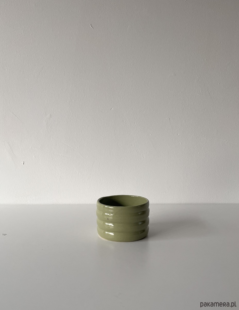 Czarka o charakterystycznym, zaokrąglonym kształcie przypominającym brzuszek. Ręcznie wykonana na kole garncarskim. Delikatny kolor zieleni przypomina wiosenną łąkę. Minimalizm, który czuć w dłoniach - idealna do spokojnych rytuałów dnia.