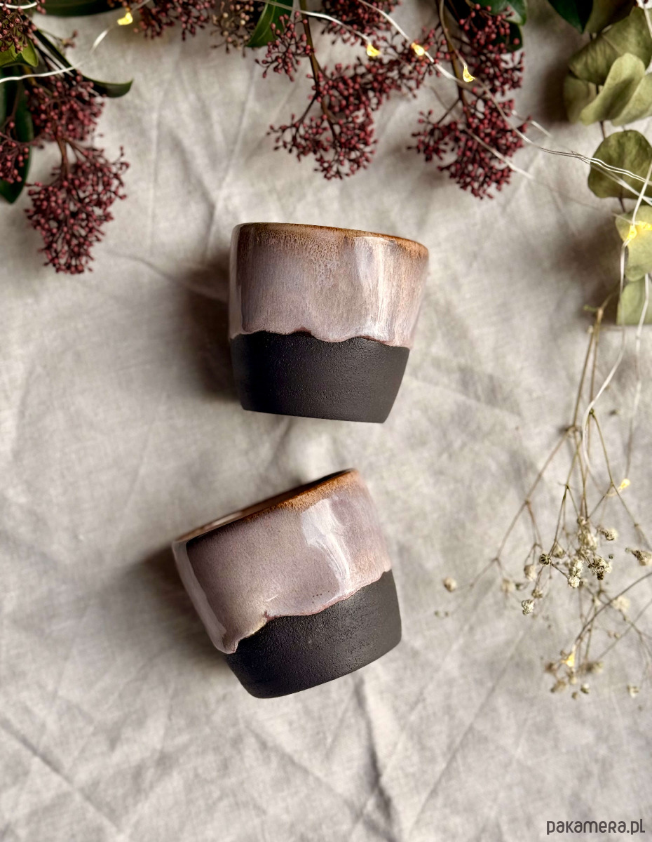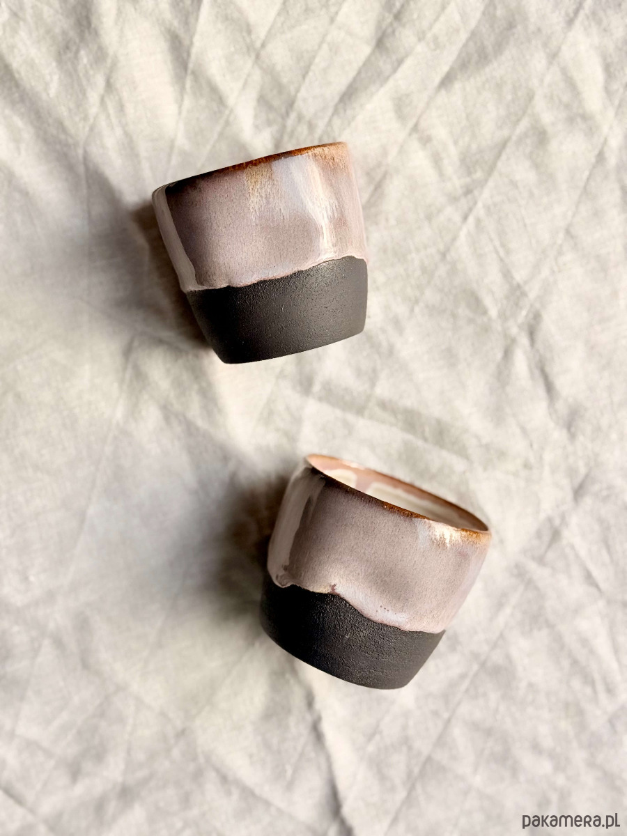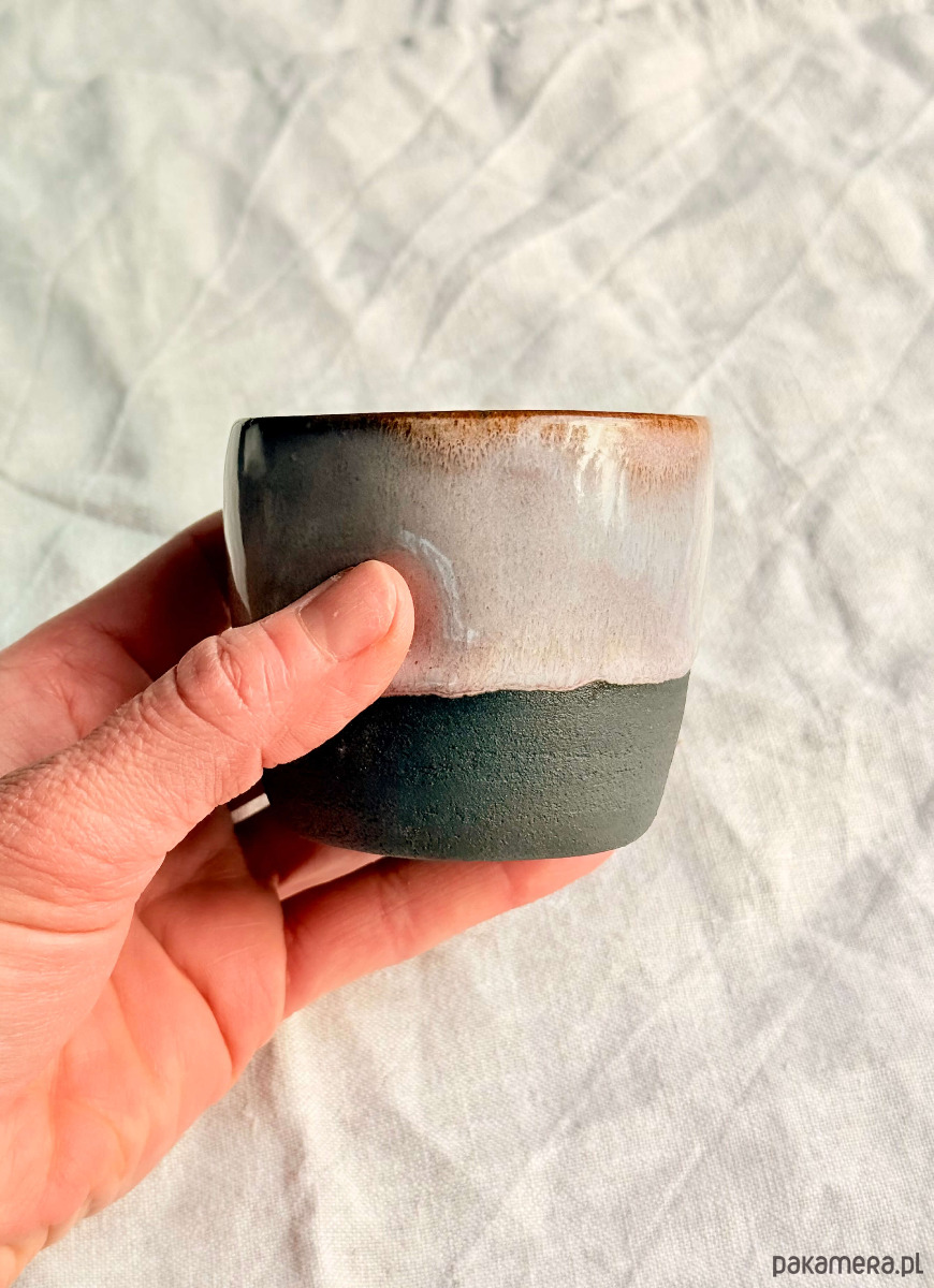 Ta czarka to mały rytuał w minimalistycznym wydaniu. Ręcznie formowana na kole garncarskim. Fioletewe szliwo na powierzchni czarki w połączeniu z surową ciemną gliną w dolnej części, nadaje naczyniu charakteru i uroku. Wnętrze pozostaje białe – by kawa zawsze wyglądała tak dobrze, jak smakuje.