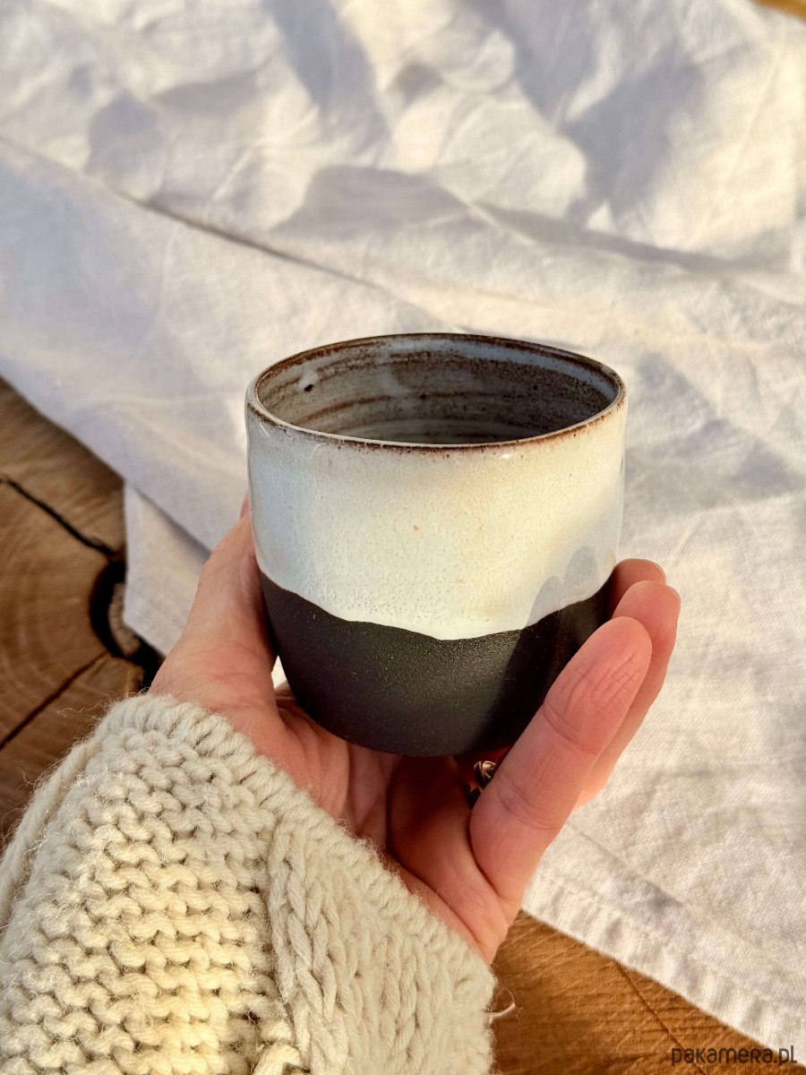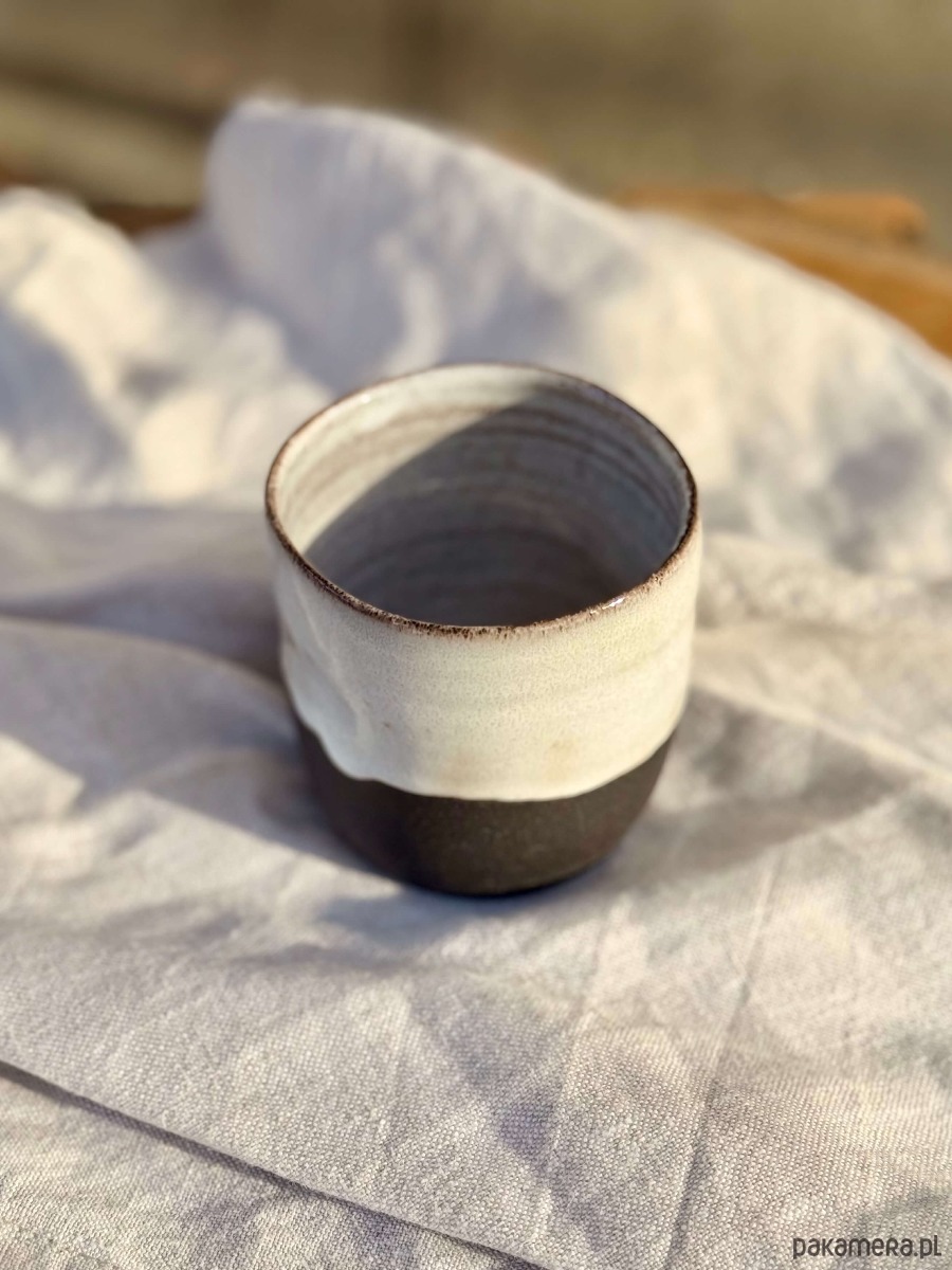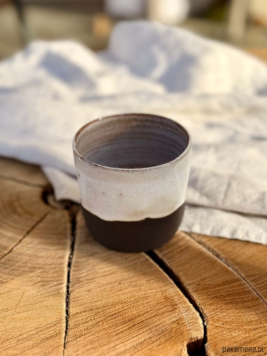 Ta czarka to mały rytuał w minimalistycznym wydaniu. Ręcznie formowana na kole garncarskim. Białe szliwo na powierzchni czarki w połączeniu z surową gliną w dolnej części, nadaje naczyniu charakteru i uroku. Wnętrze pozostaje białe – by kawa zawsze wyglądała tak dobrze, jak smakuje.