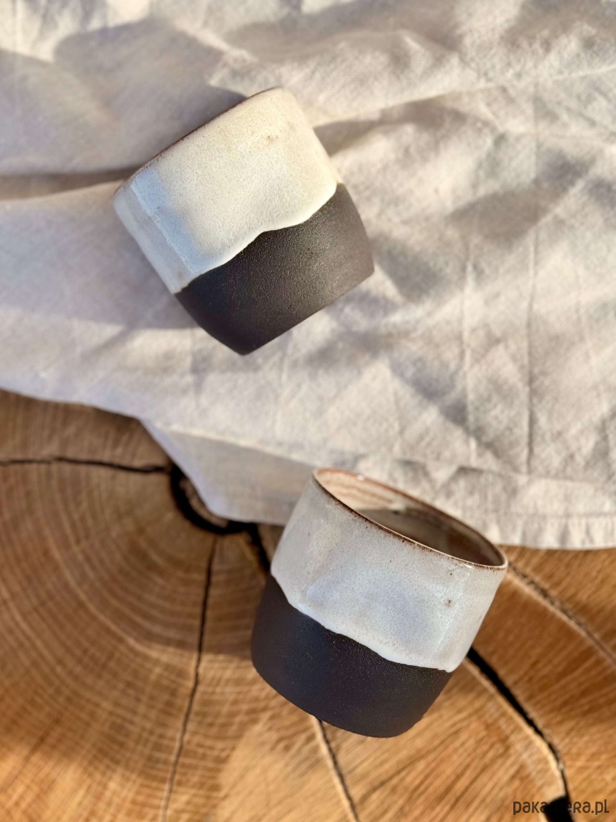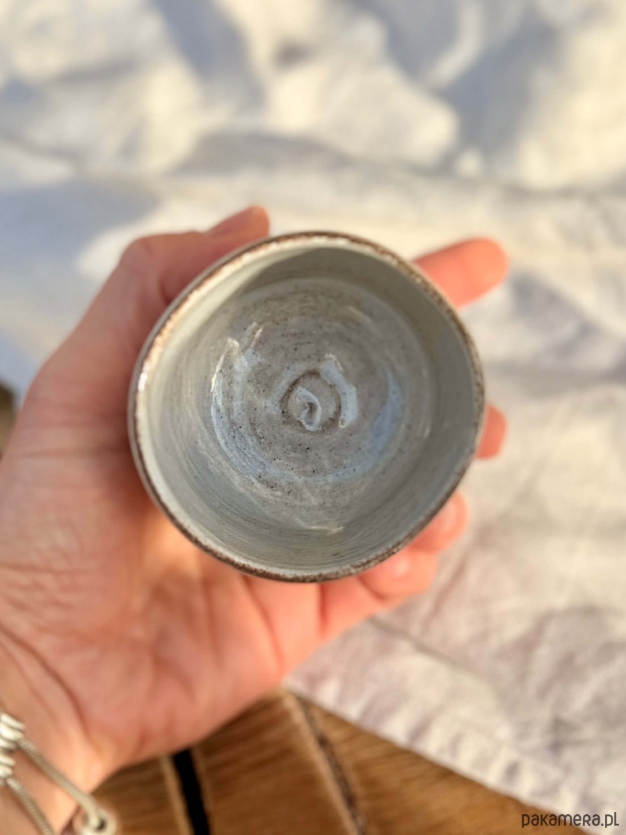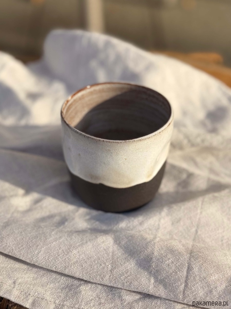 Ta czarka to mały rytuał w minimalistycznym wydaniu. Ręcznie formowana na kole garncarskim. Białe szliwo na powierzchni czarki w połączeniu z surową gliną w dolnej części, nadaje naczyniu charakteru i uroku. Wnętrze pozostaje białe – by kawa zawsze wyglądała tak dobrze, jak smakuje.