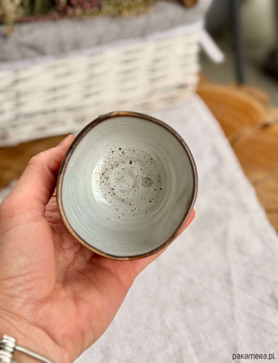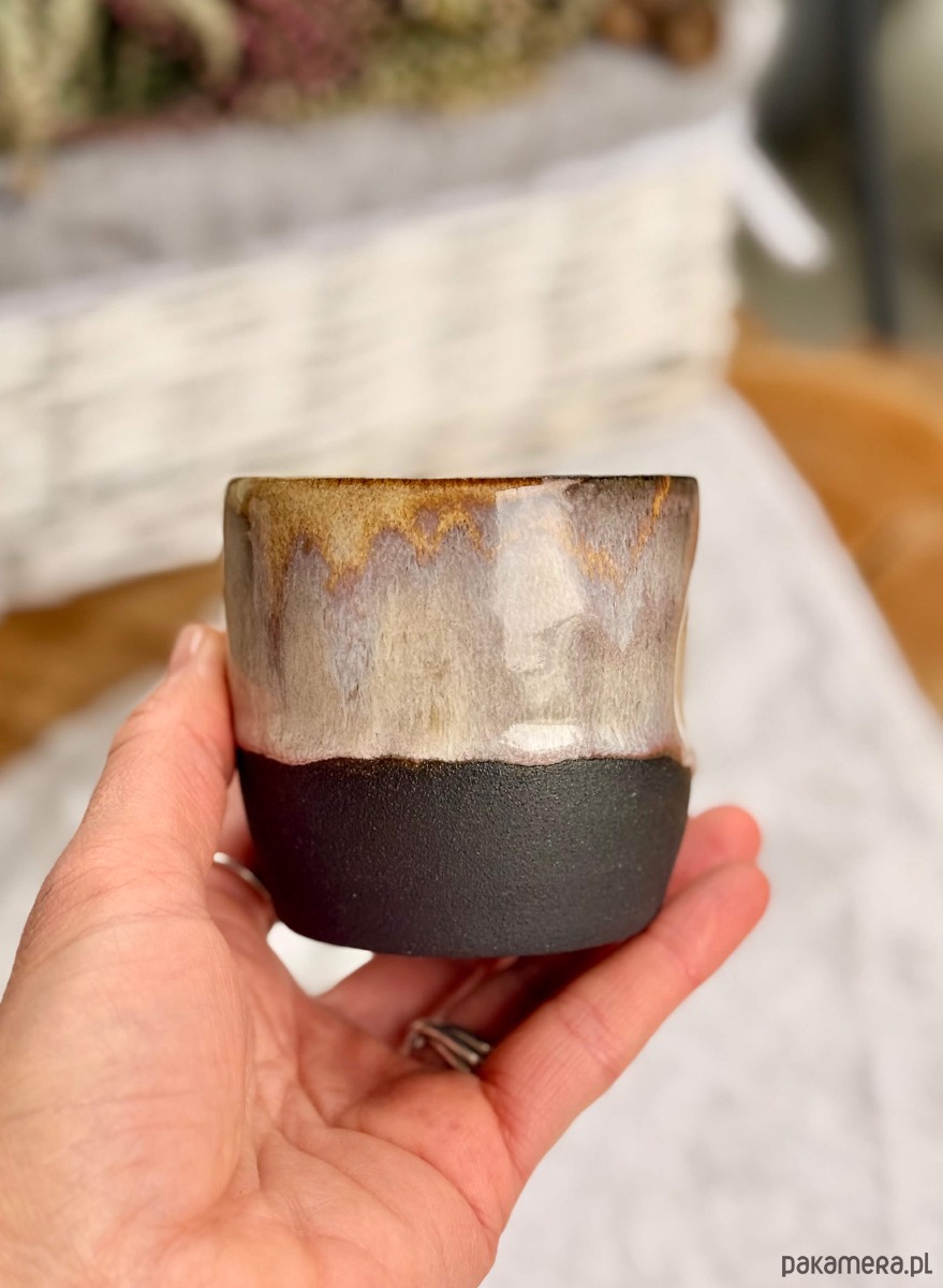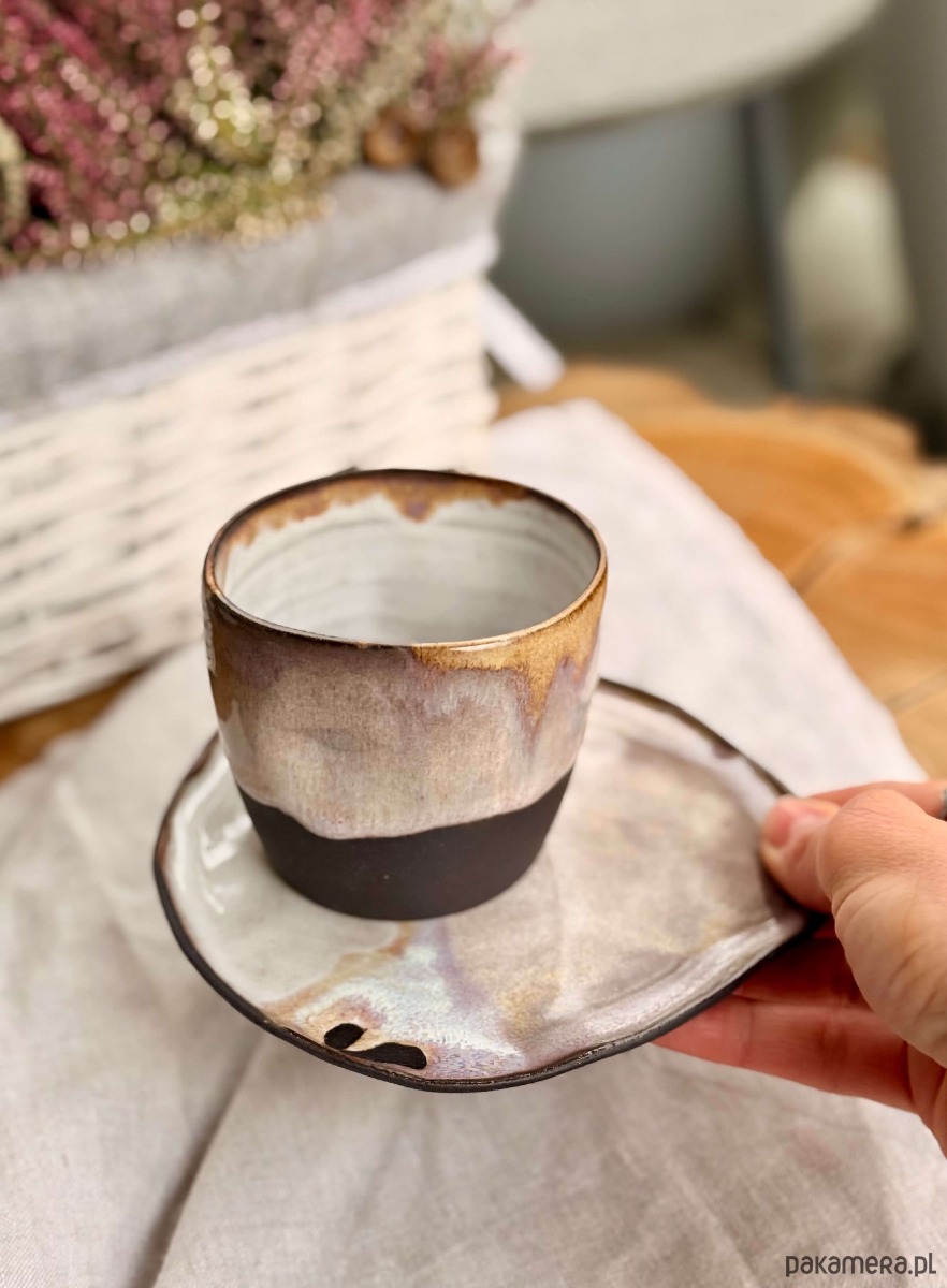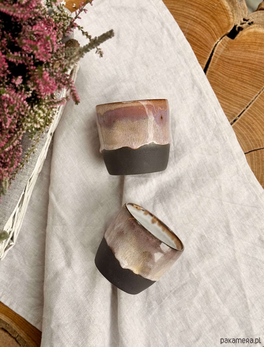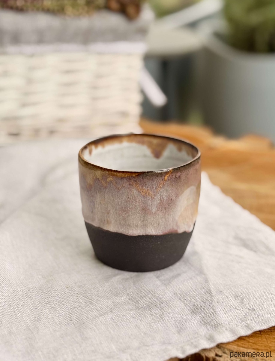 Ta czarka to mały rytuał w minimalistycznym wydaniu. Ręcznie formowana na kole garncarskim. Fioletewe szliwo na powierzchni czarki w połączeniu z surową ciemną gliną w dolnej części, nadaje naczyniu charakteru i uroku. Wnętrze pozostaje białe – by kawa zawsze wyglądała tak dobrze, jak smakuje.