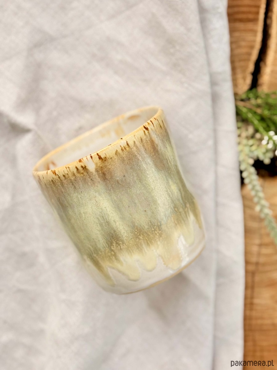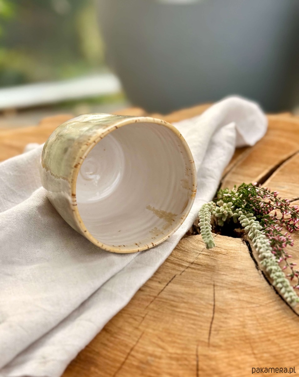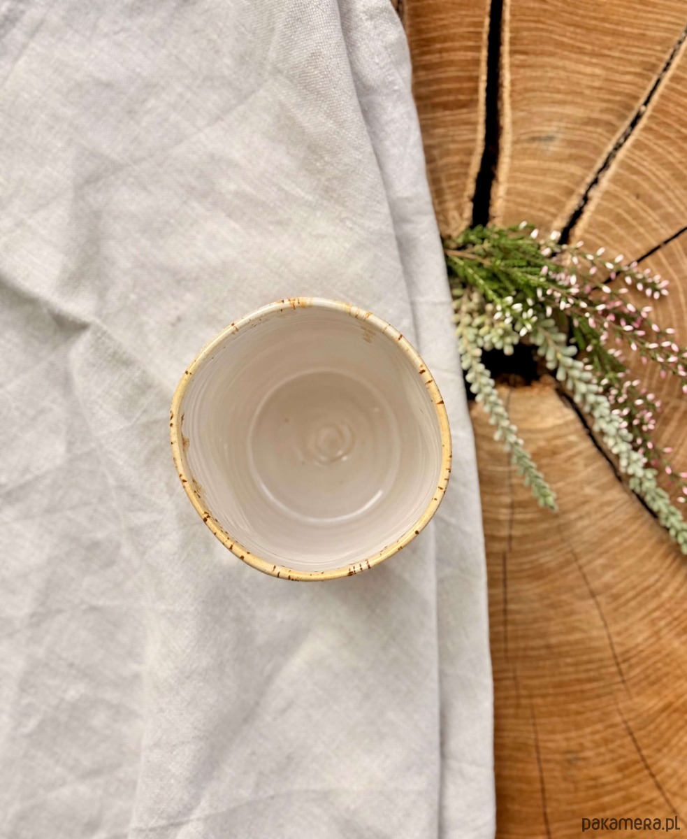 Ta czarka to mały rytuał w minimalistycznym wydaniu. Ręcznie formowana na kole garncarskim. Beżowe szliwo na powierzchni czarki nadaje naczyniu charakteru i uroku. Wnętrze pozostaje białe – by kawa zawsze wyglądała tak dobrze, jak smakuje.