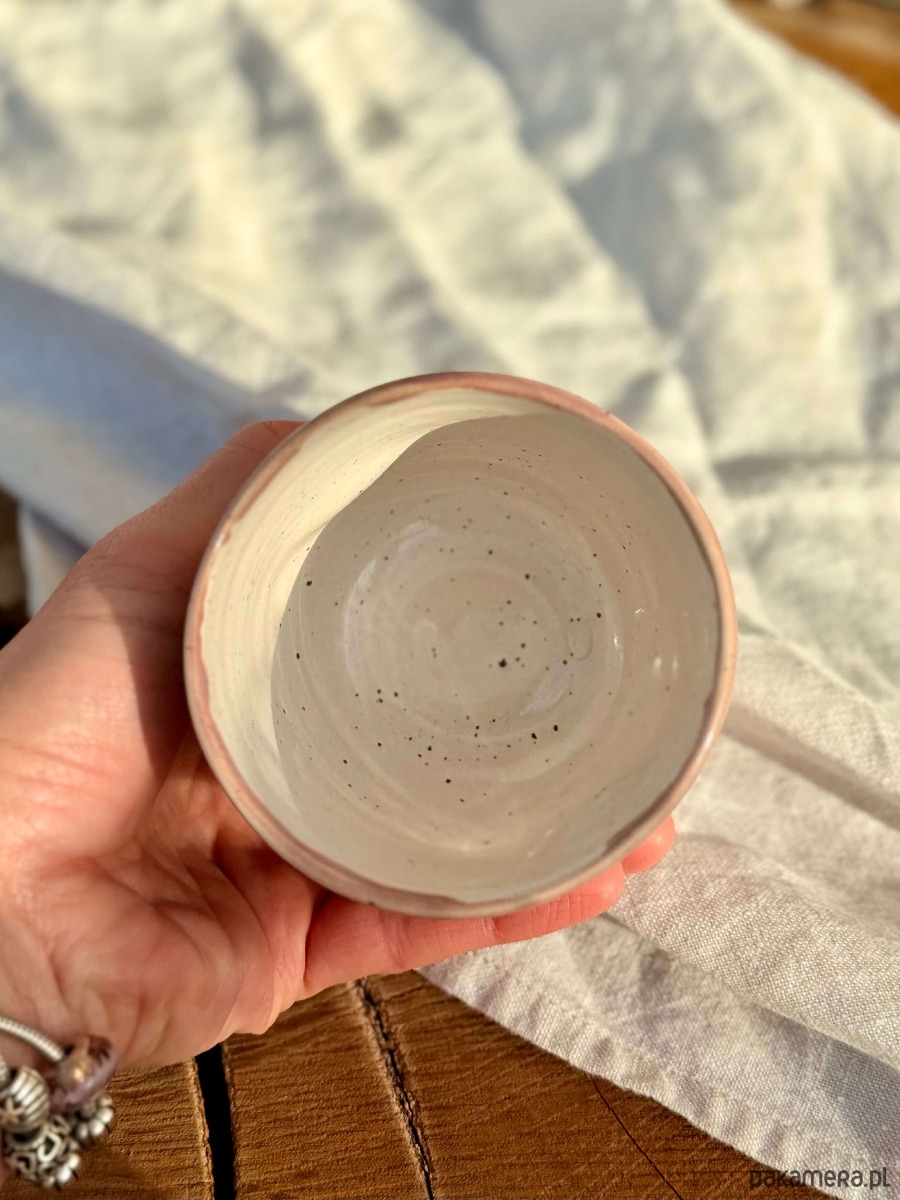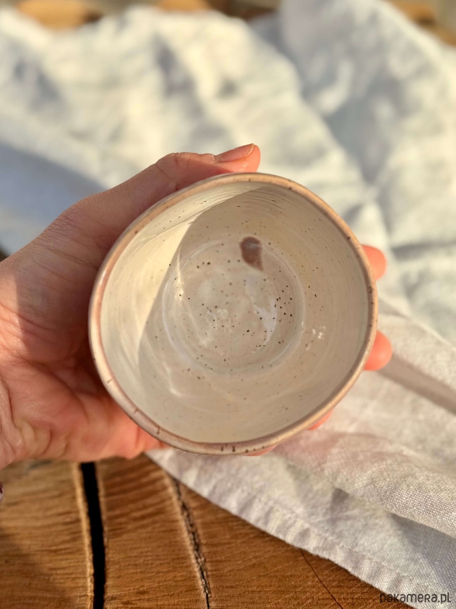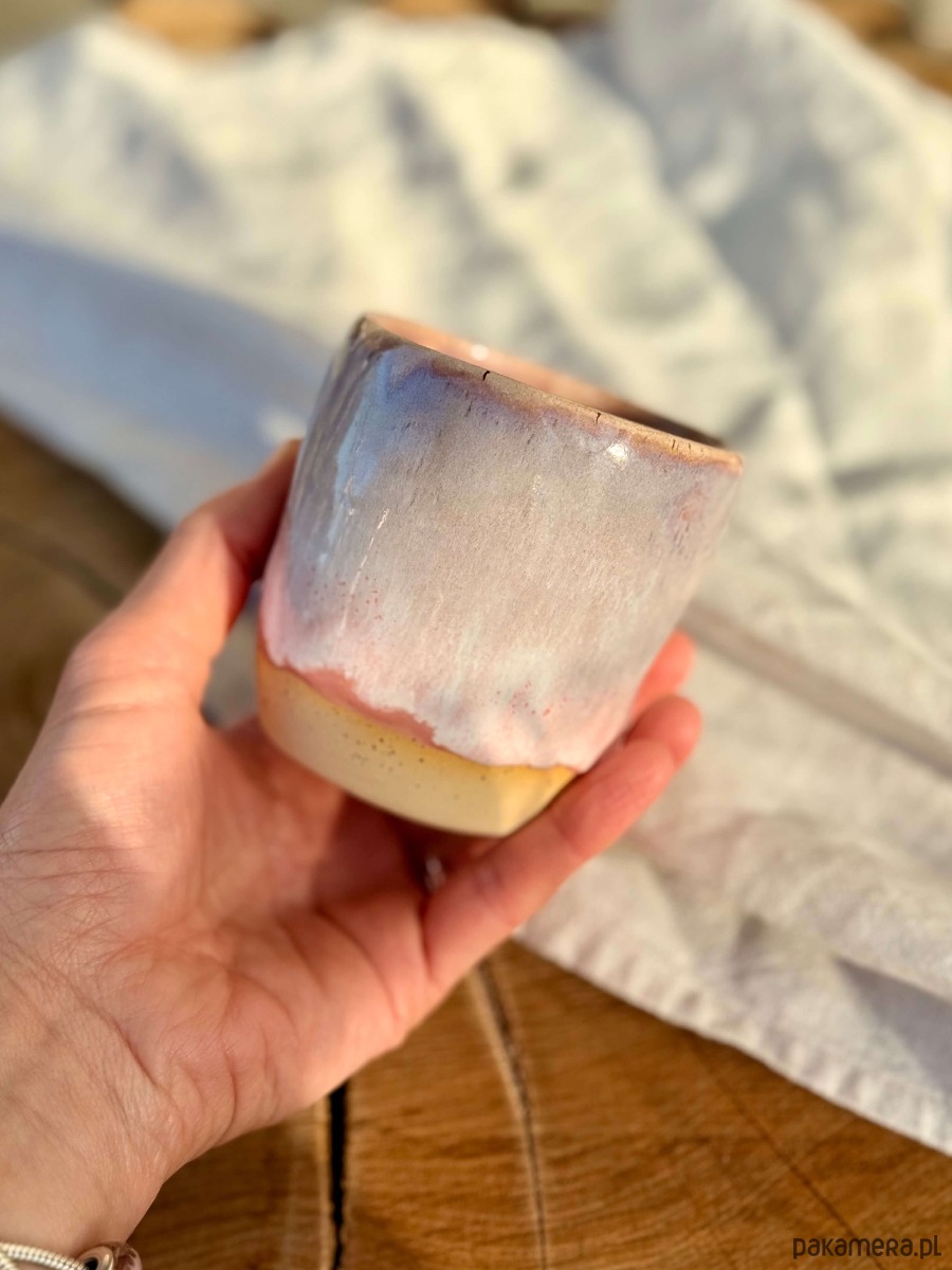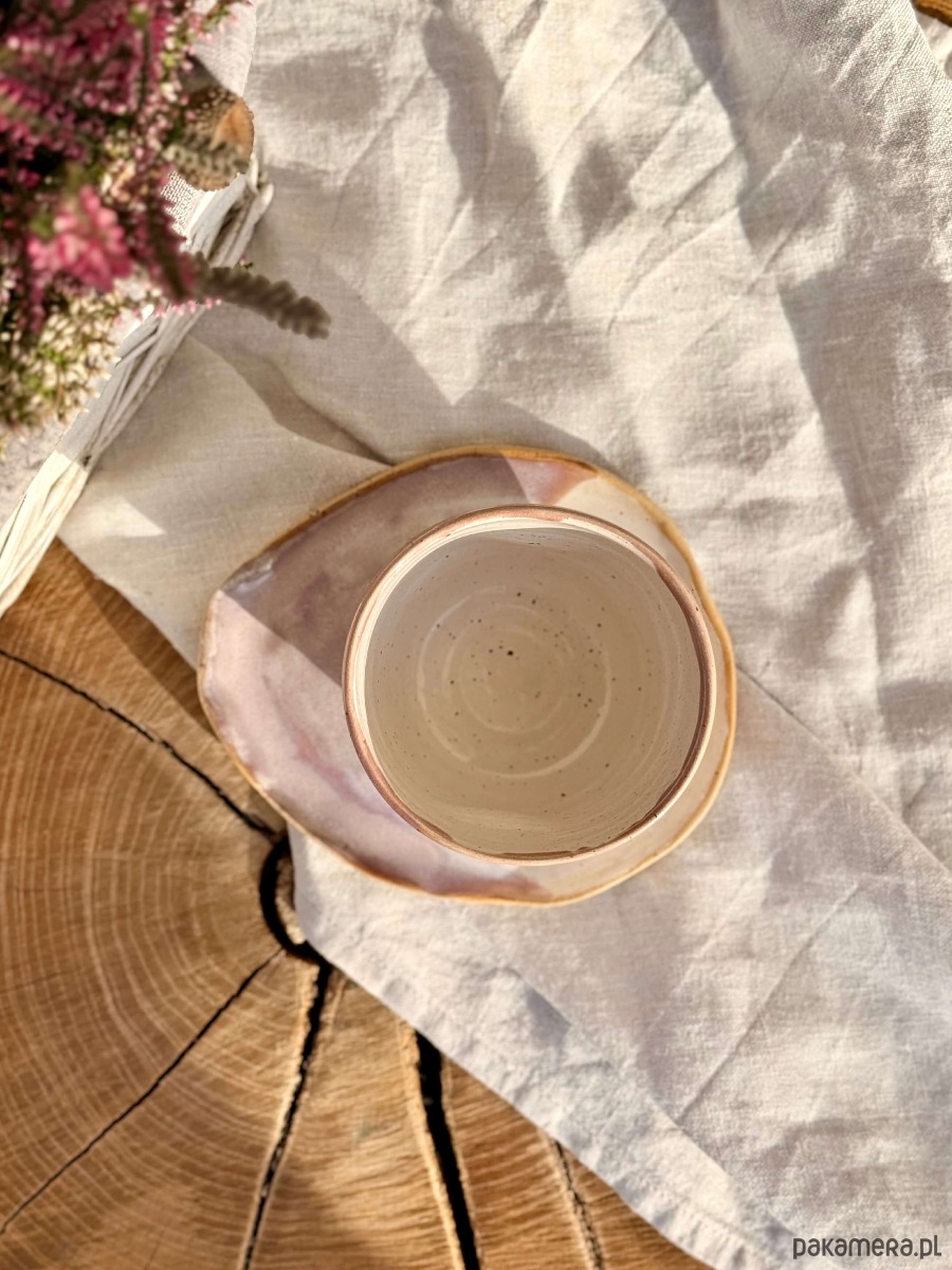 Ta czarka to mały rytuał w minimalistycznym wydaniu. Ręcznie formowana na kole garncarskim. Fioletewe szliwo na powierzchni czarki w połączeniu z surową gliną w dolnej części, nadaje naczyniu charakteru i uroku. Wnętrze pozostaje białe – by kawa zawsze wyglądała tak dobrze, jak smakuje.