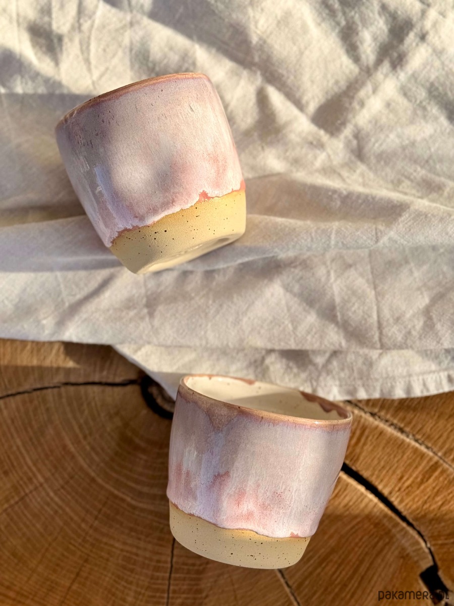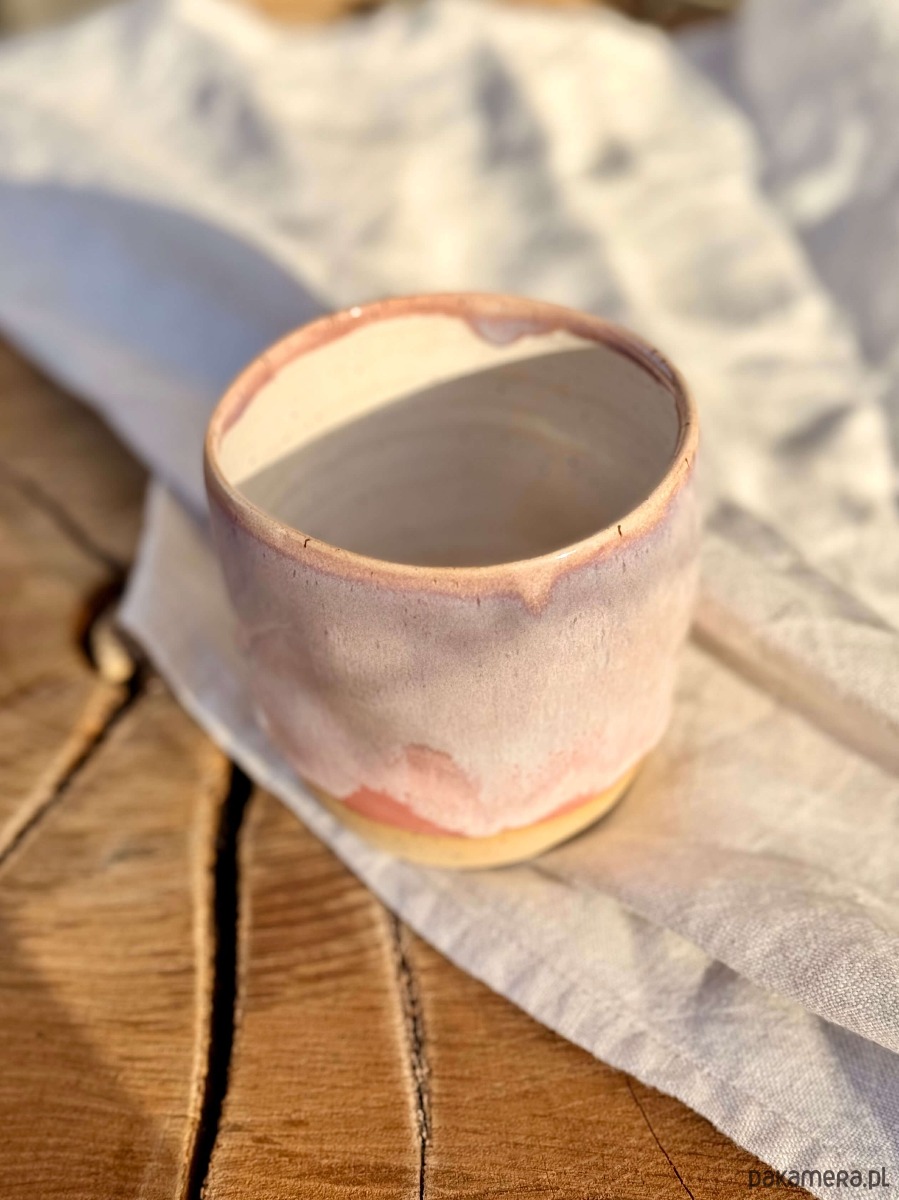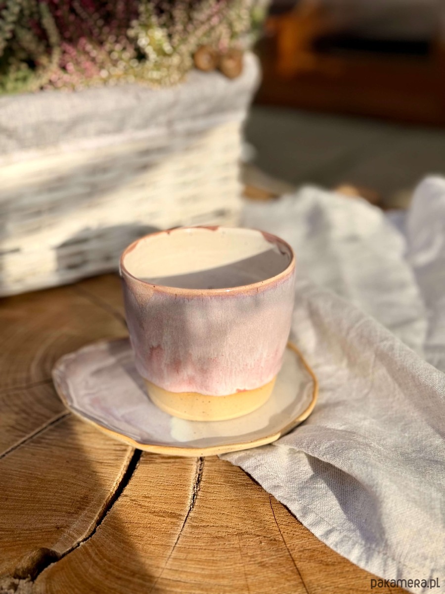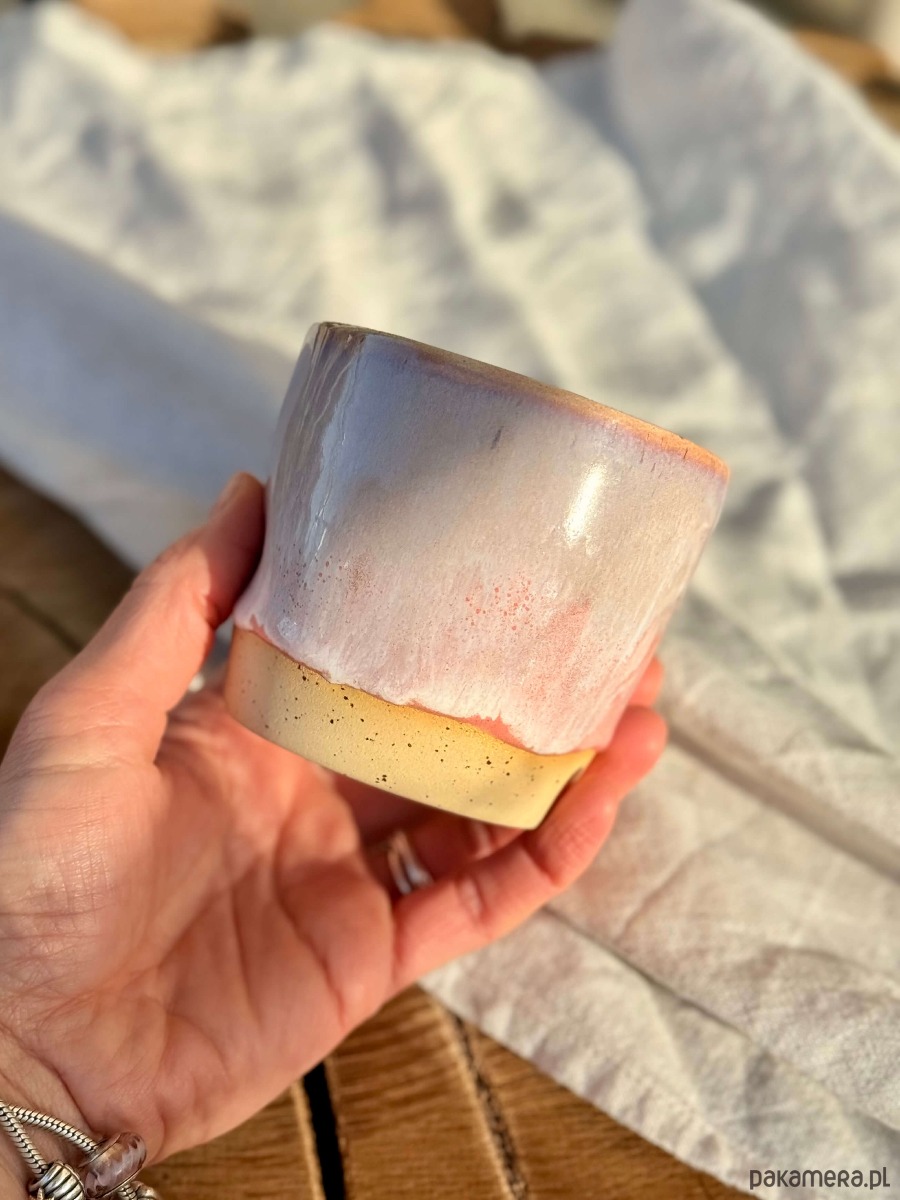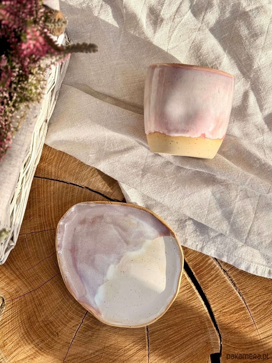 Ta czarka to mały rytuał w minimalistycznym wydaniu. Ręcznie formowana na kole garncarskim. Fioletewe szliwo na powierzchni czarki w połączeniu z surową gliną w dolnej części, nadaje naczyniu charakteru i uroku. Wnętrze pozostaje białe – by kawa zawsze wyglądała tak dobrze, jak smakuje.