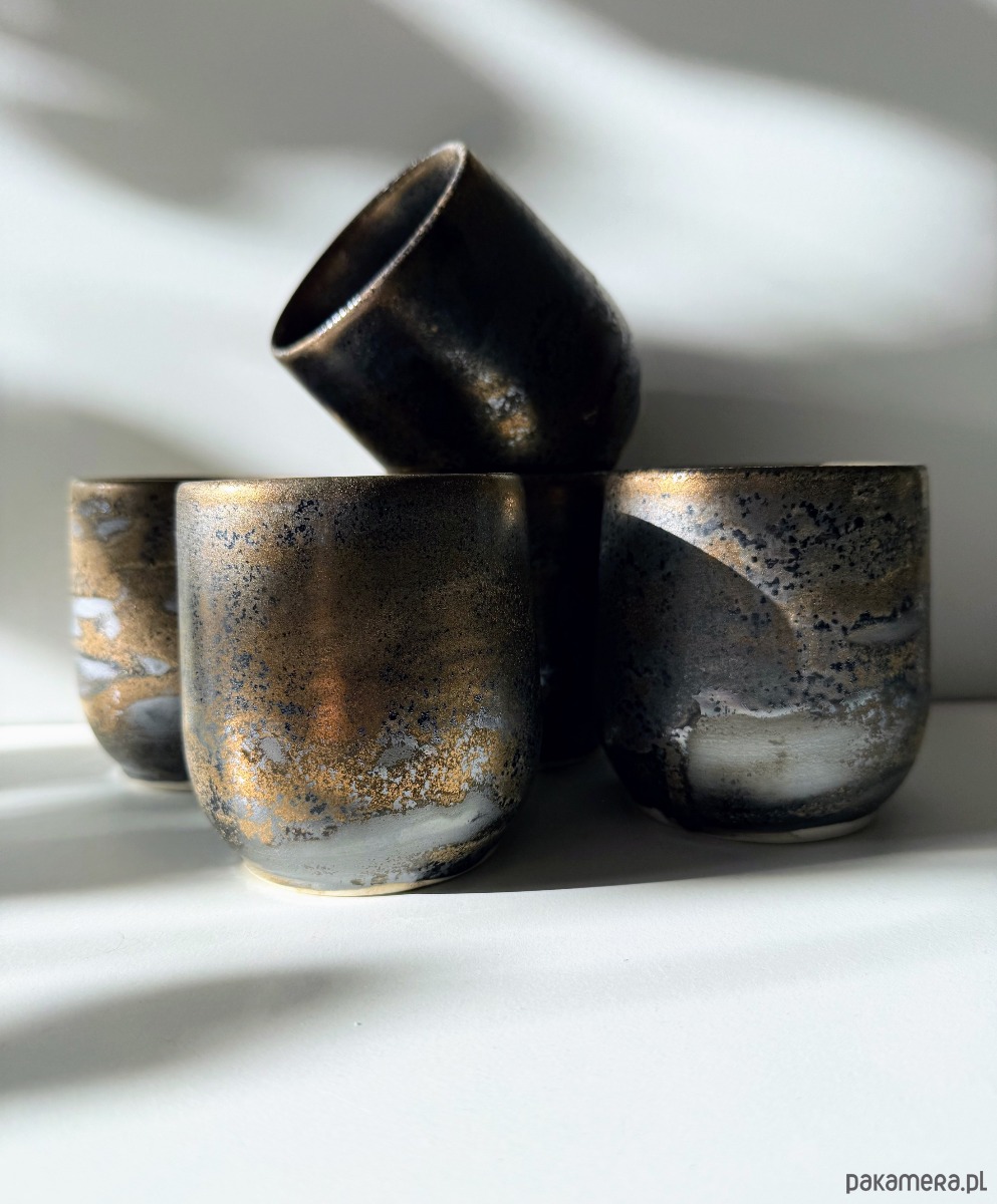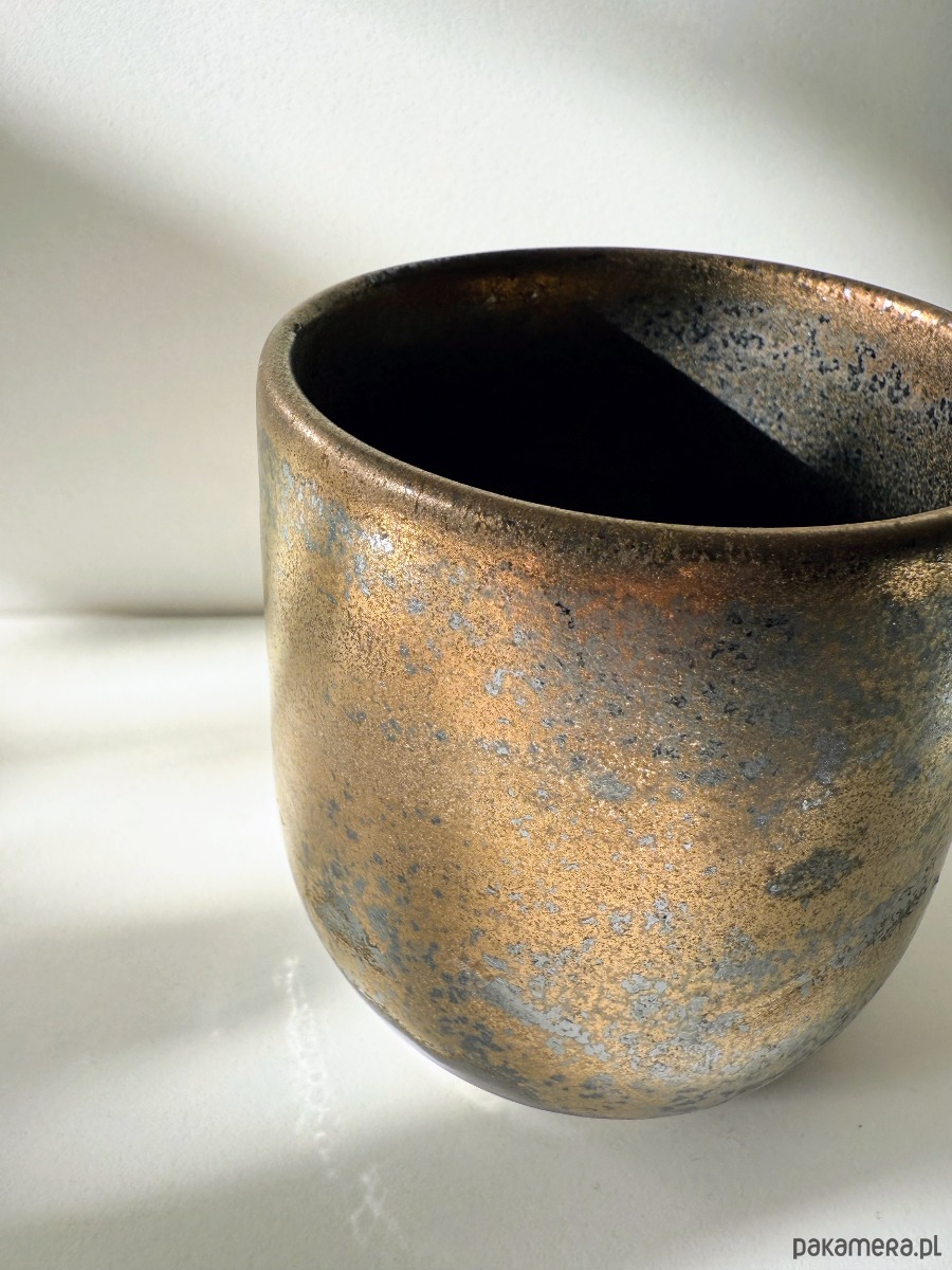 Minimalistyczna czarka - baryłka, wykonana z jasnej gliny w podpoznańskiej pracowni. Pokryta szkliwem w kolorze gorzkiej czekolady ze złotom poświatom.
