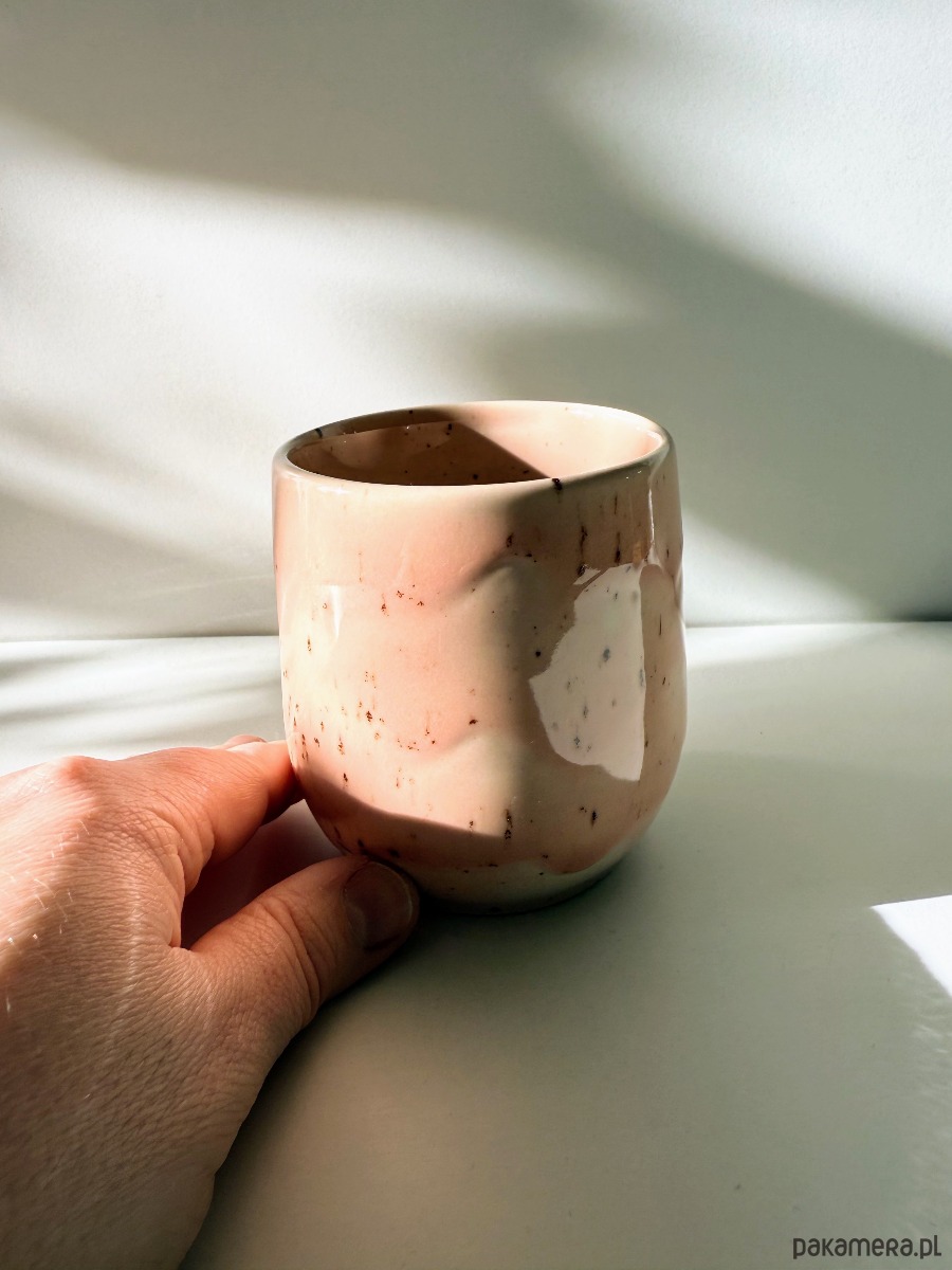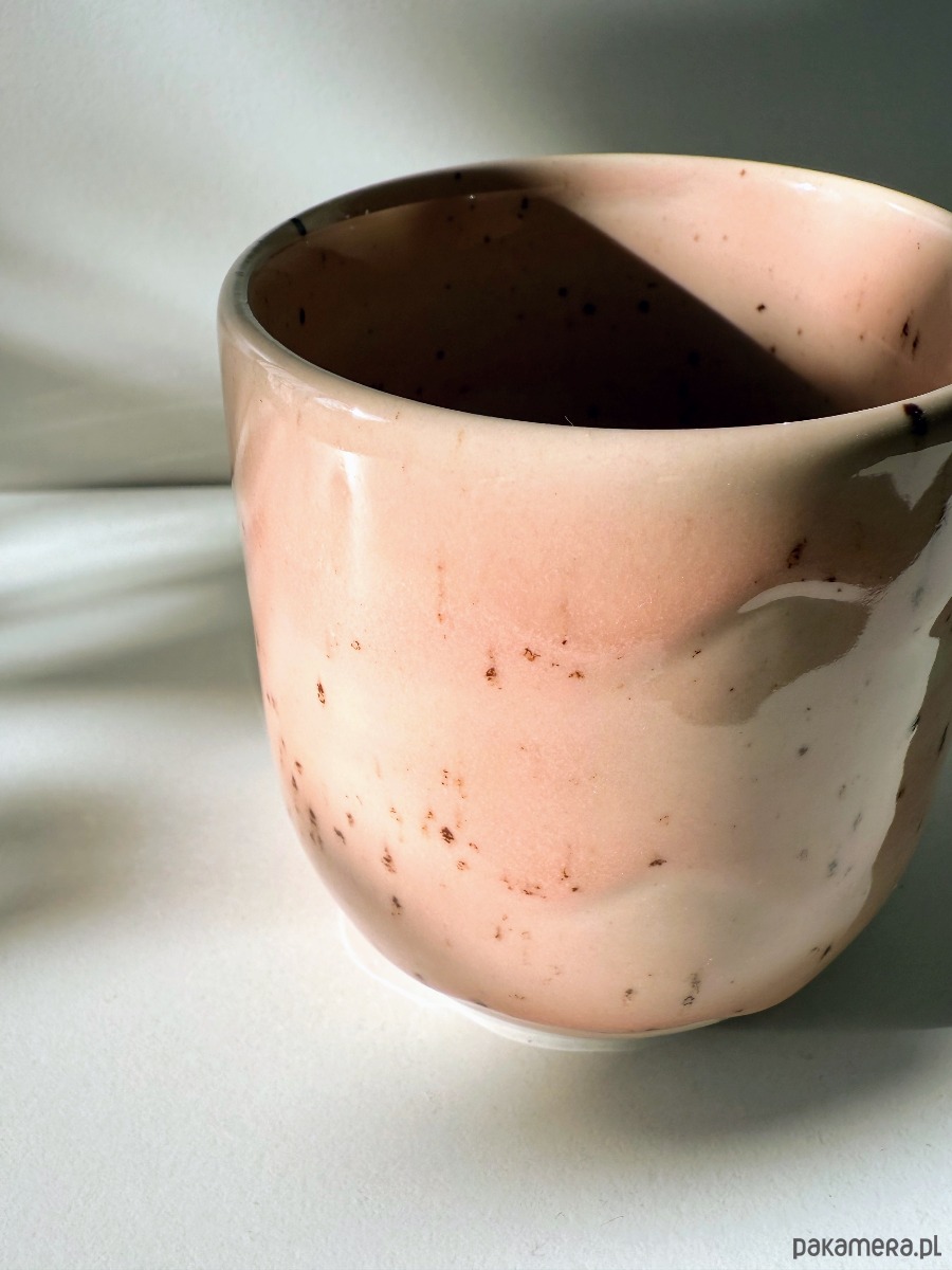 Minimalistyczna czarka - baryłka, wykonana z jasnej gliny w podpoznańskiej pracowni. Pokryta różowo- łososiowym szkliwem z brązowymi piegami.