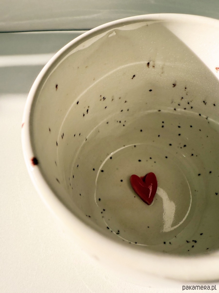 Minimalistyczna czarka - baryłka, wykonana z jasnej gliny w podpoznańskiej pracowni. Pokryta białym szkliwem z brązowymi piegami kryje w środku niespodziankę - czerwone serduszko.