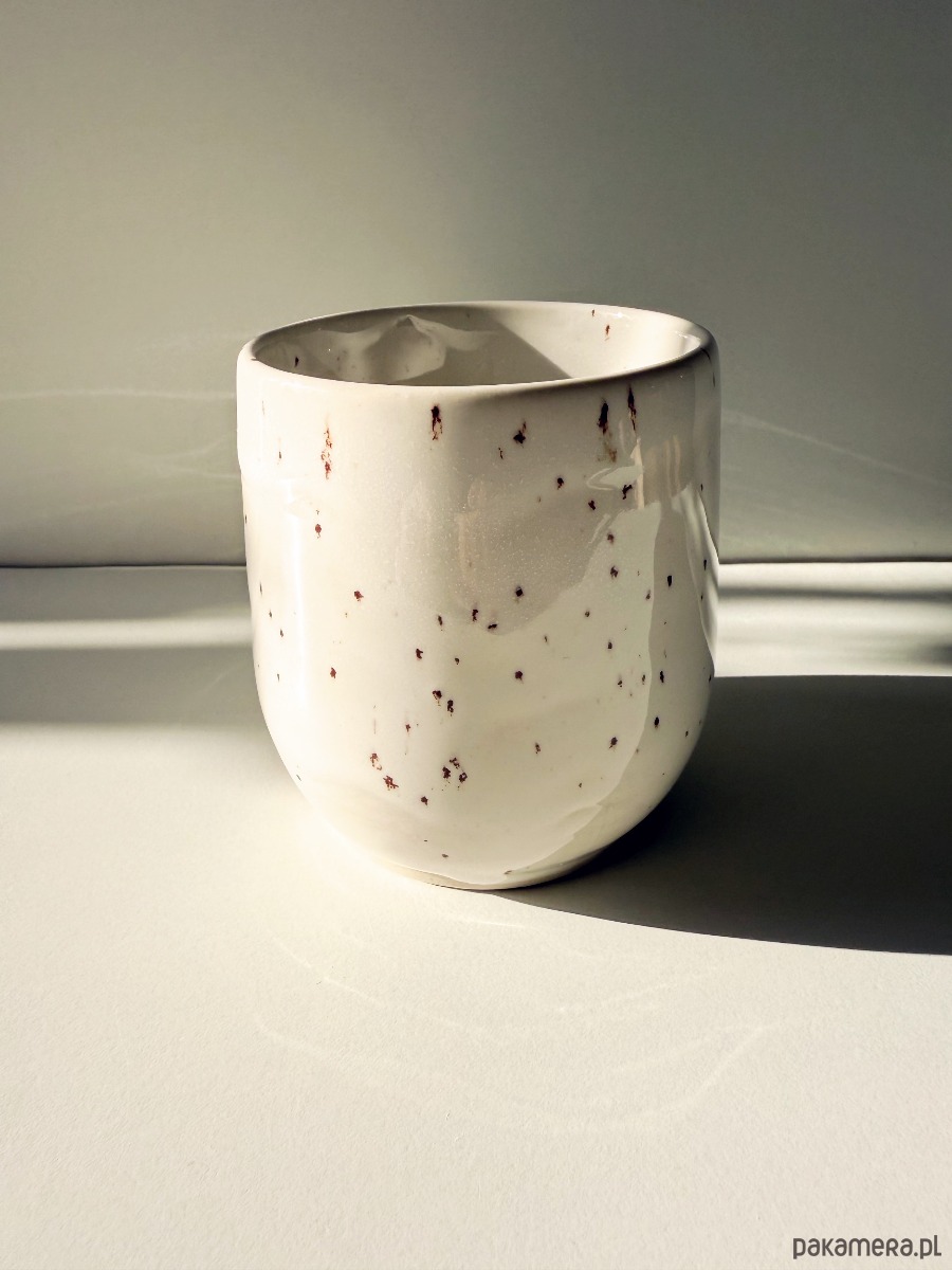 Minimalistyczna czarka - baryłka, wykonana z jasnej gliny w podpoznańskiej pracowni. Pokryta białym szkliwem z brązowymi piegami kryje w środku niespodziankę - czerwone serduszko.