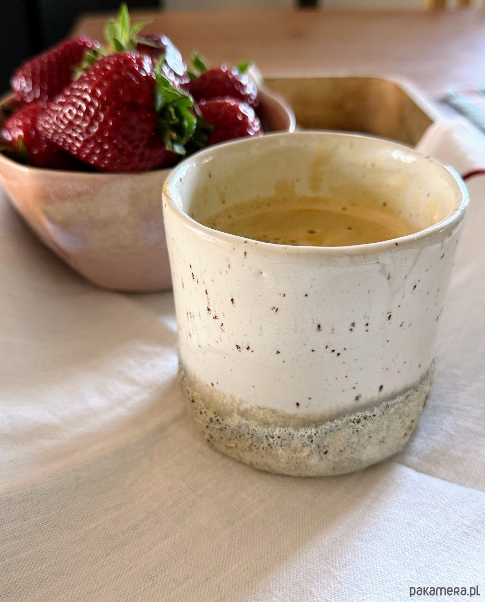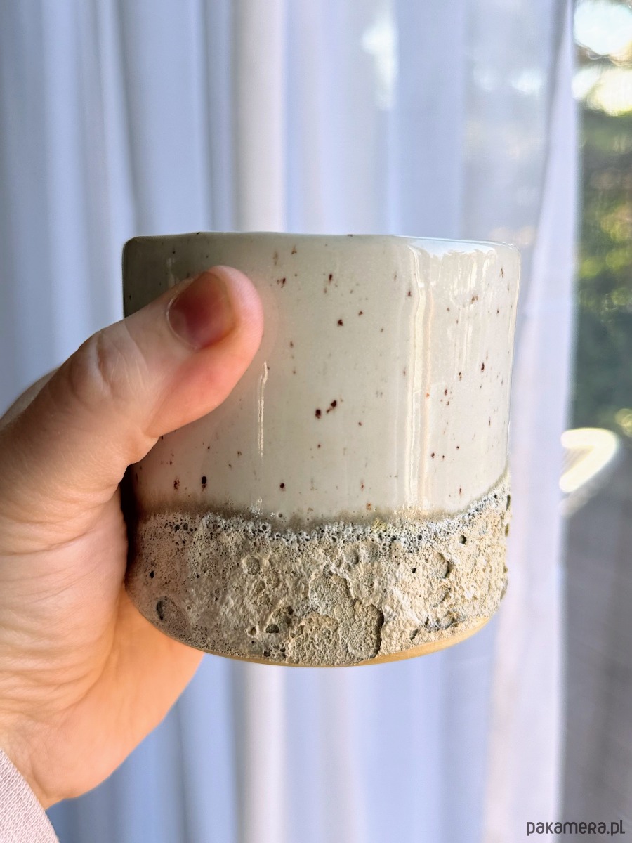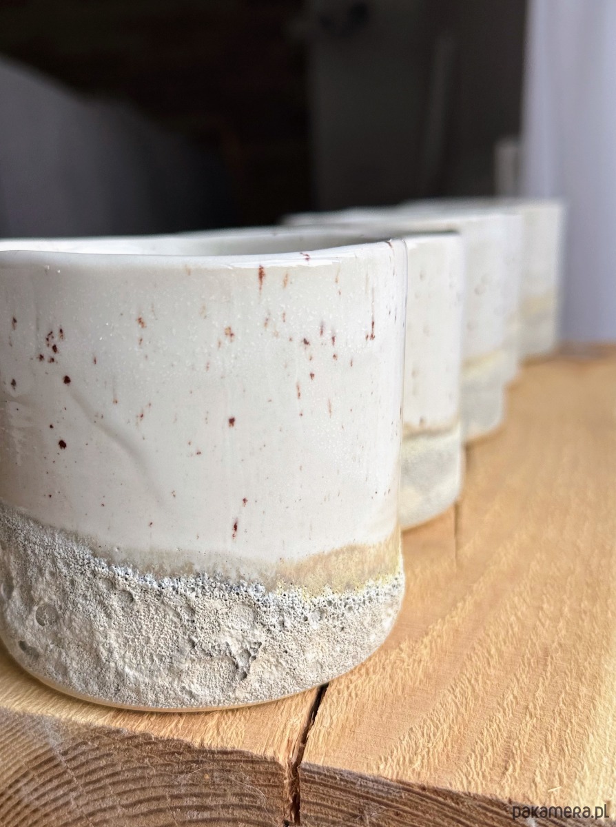 Czarka ceramiczna pokryta białym szkliwem nakrapianym, od dołu pokrytą szkliwem przypominającym księżyc, lawę bądź pumeks. Może Tobie skojarzy się jeszcze z czyś innym.