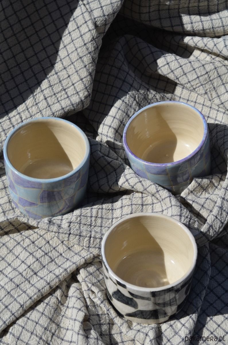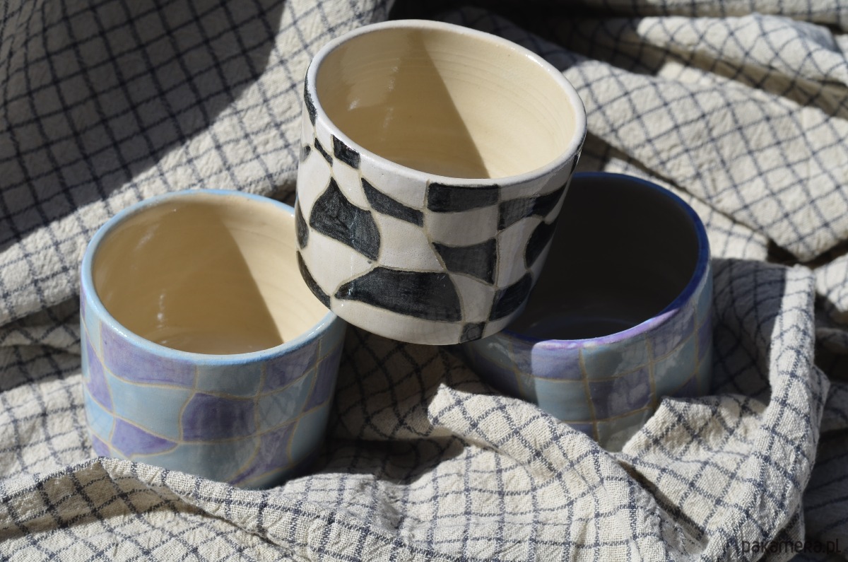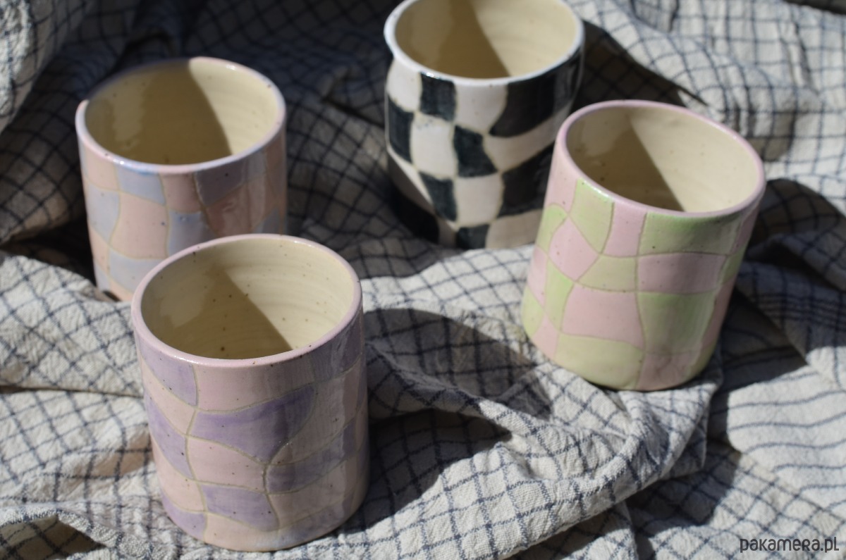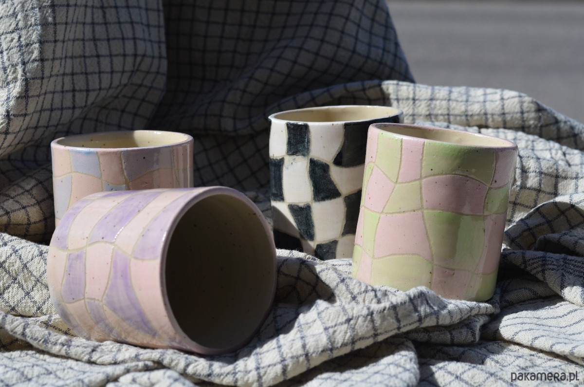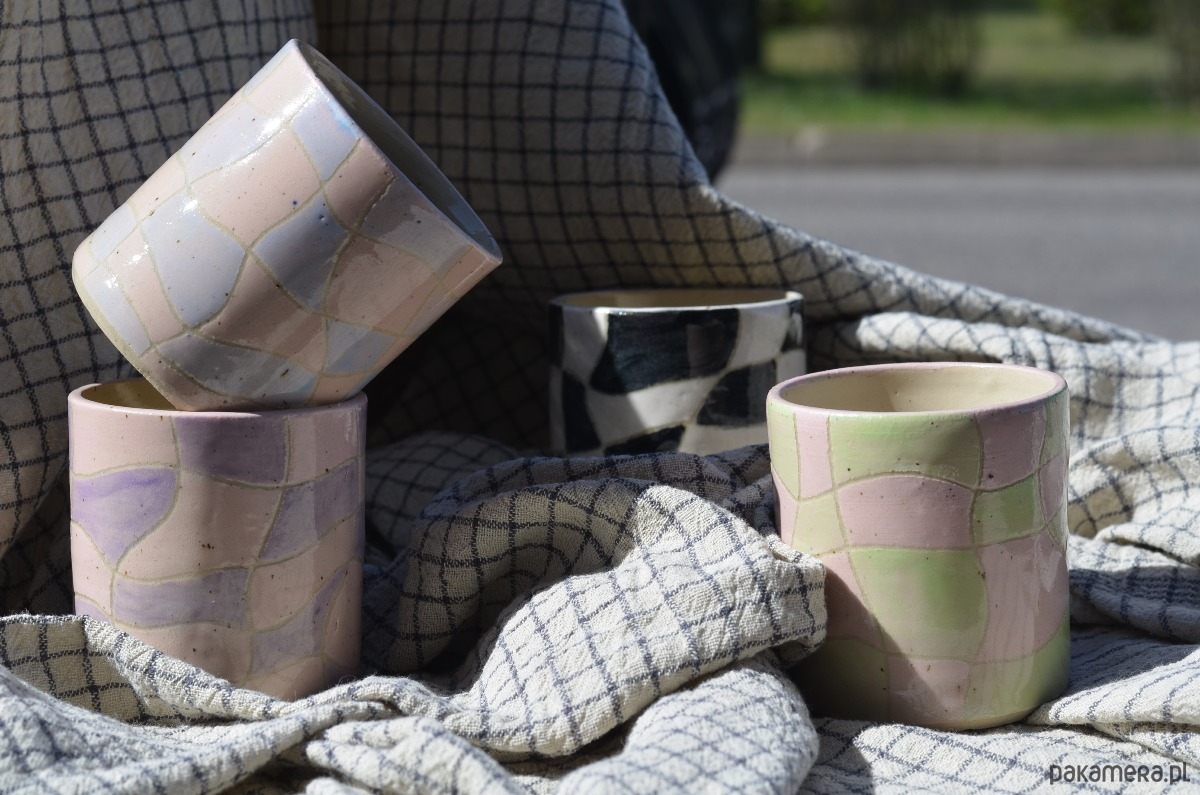 Toczone na kole i ręcznie szkliwione czarki inspirowane patchworkiem – łączeniem różnych fragmentów w jedną, spójną całość. Każda z nich to niepowtarzalna kompozycja kolorów i form, w której spotykają się delikatne pastele, czerń i biel.