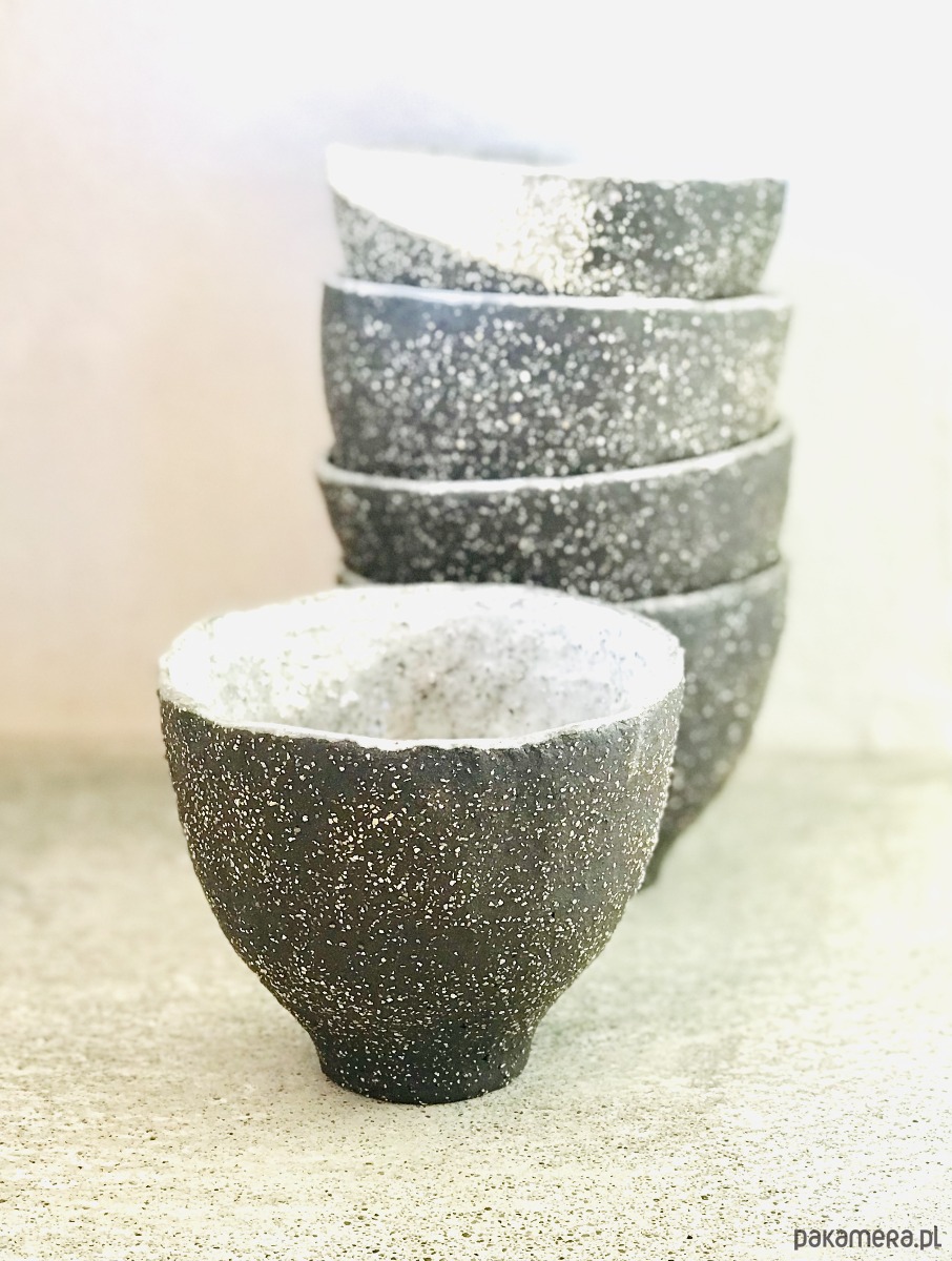 Czarka została wykonana ręcznie z czarnej, szamotowej gliny. Wnętrze naczynia zostało pokryte białym, nakrapianym szkliwem. Uwydatniona faktura gliny nadaje ceramice oryginalny, rustykalny charakter.