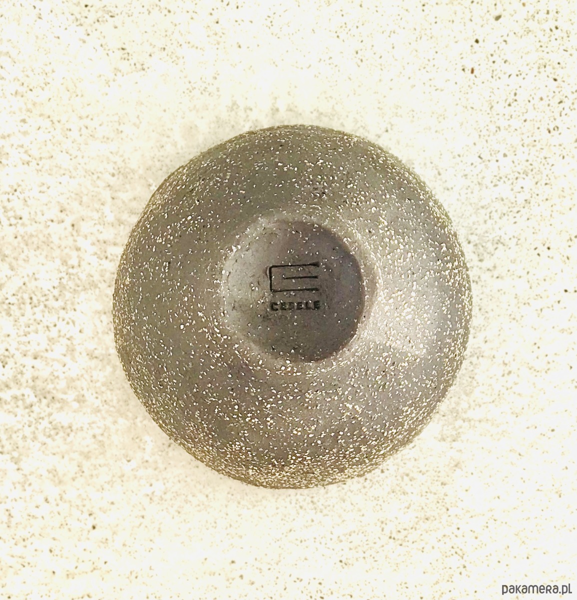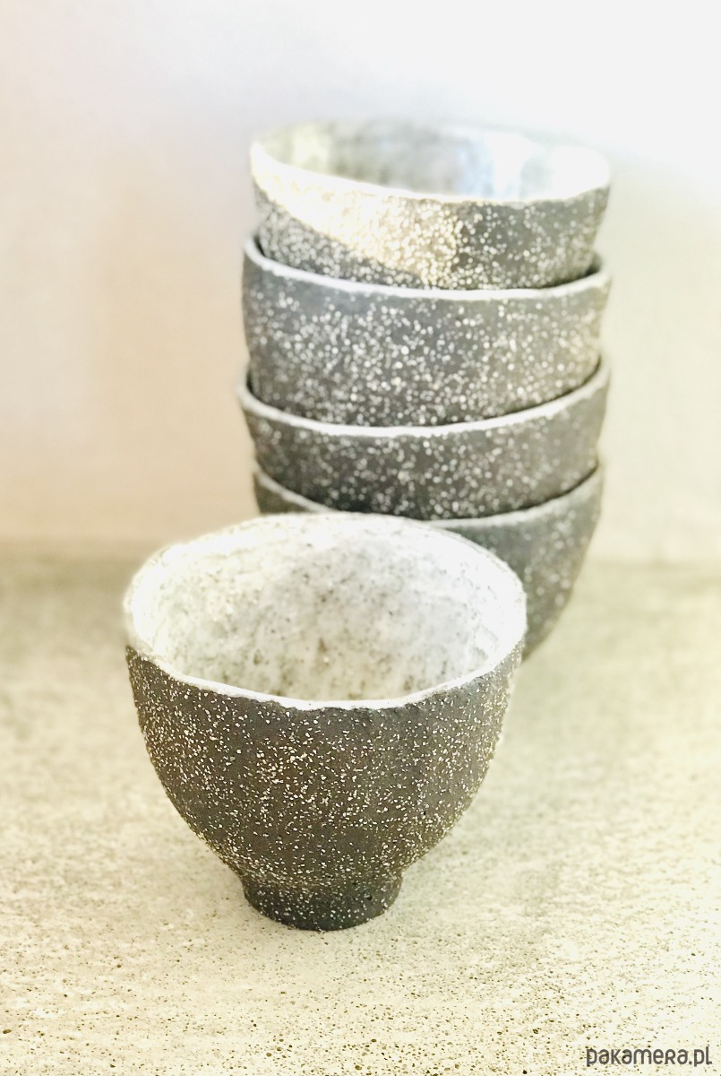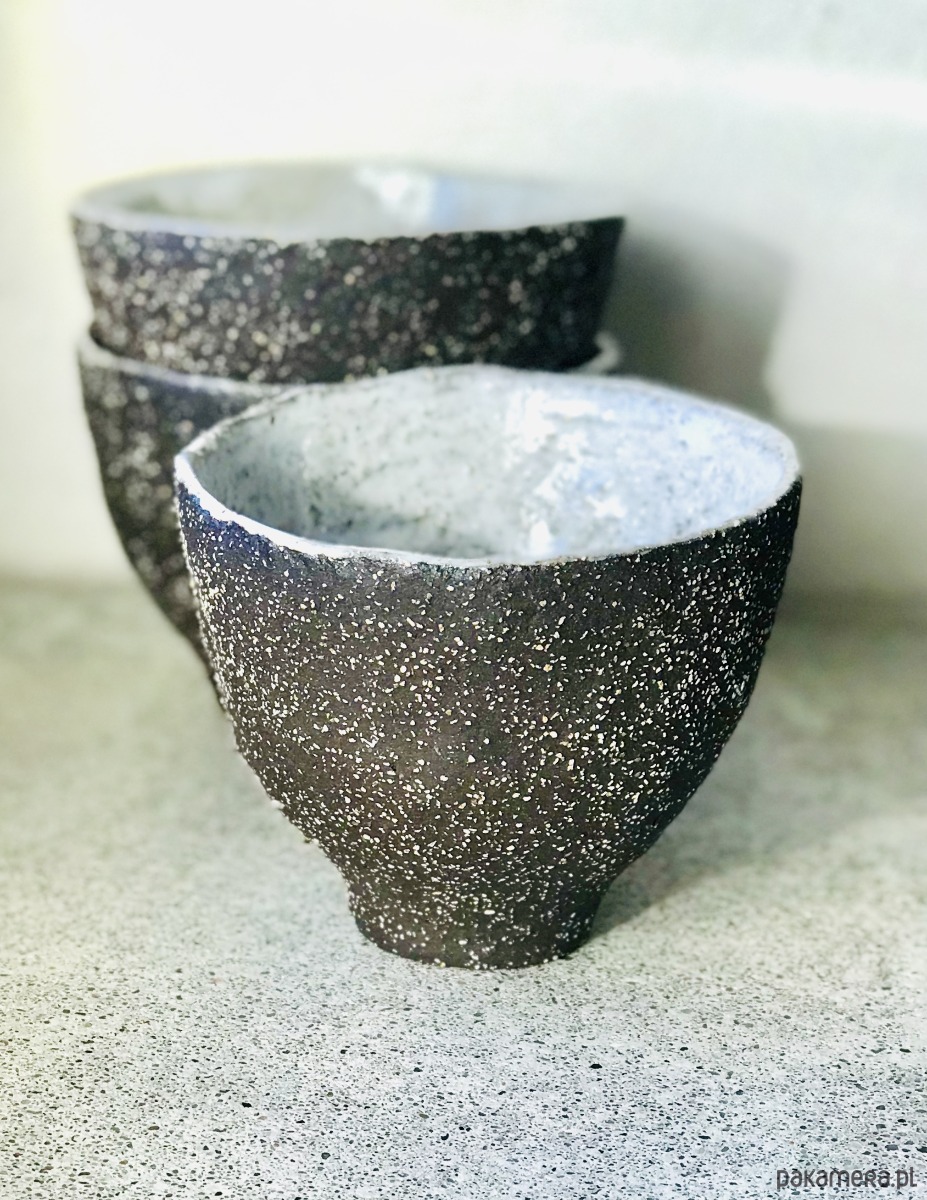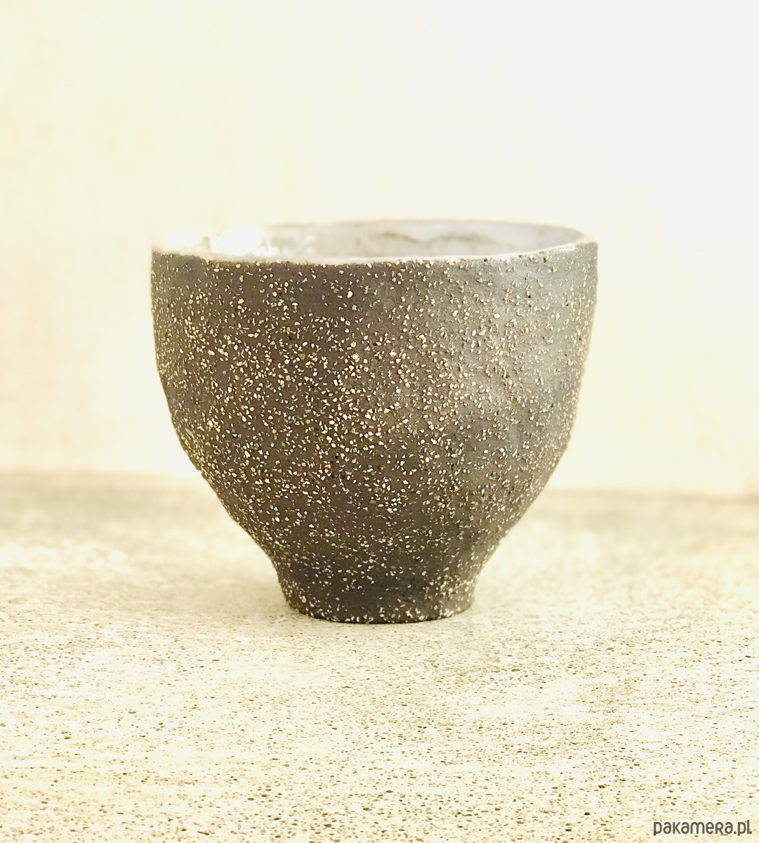 Czarka została wykonana ręcznie z czarnej, szamotowej gliny. Wnętrze naczynia zostało pokryte białym, nakrapianym szkliwem. Uwydatniona faktura gliny nadaje ceramice oryginalny, rustykalny charakter.