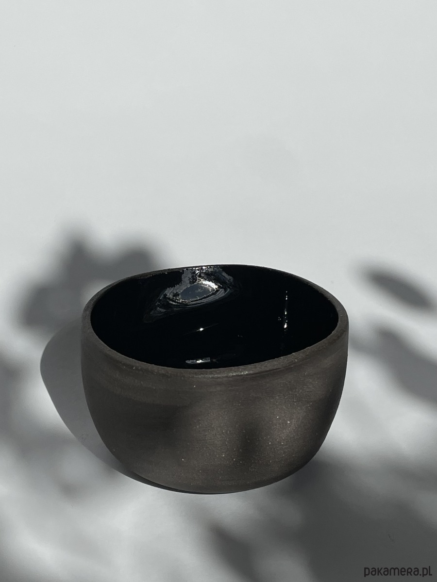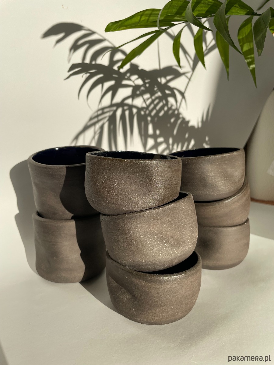 Czarka o kontrastowym wykończeniu: błyszczące kobaltowe wnętrze zestawione z matową, czarną gliną na zewnątrz. Ma nieregularne ścianki i posiada dwa wgłębienia na palce, dzięki czemu naturalnie dopasowuje się do dłoni.