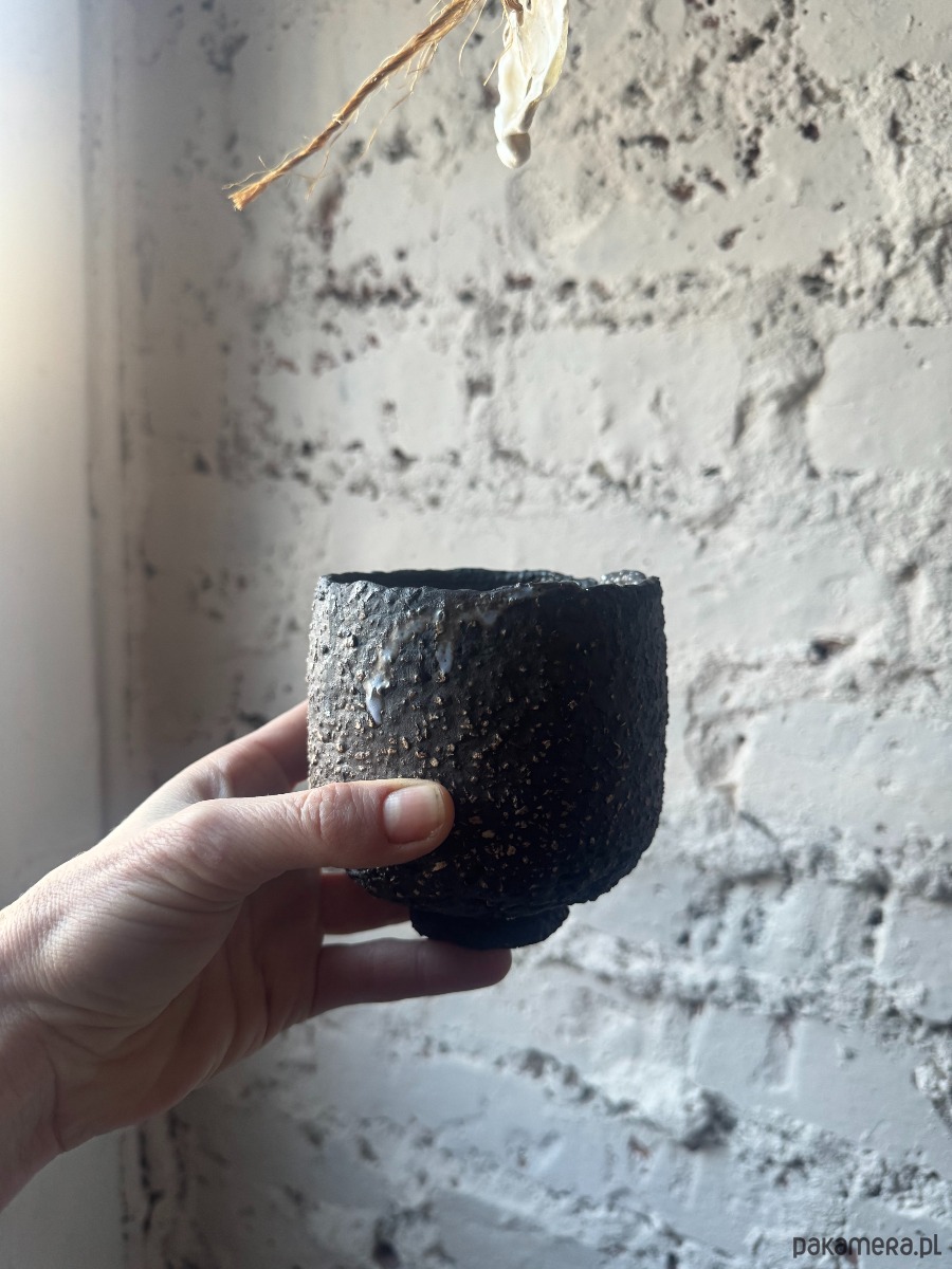 Ceramiczna czarka stworzona z hiszpańskiej masy o wyraźnej, chropowatej strukturze to mały rytuał uważności zamknięty w formie naczynia. Jej nierówna, organiczna powierzchnia sprawia, że każde dotknięcie staje się doświadczeniem – intensywnym, prawdziwym i głęboko uziemiającym.