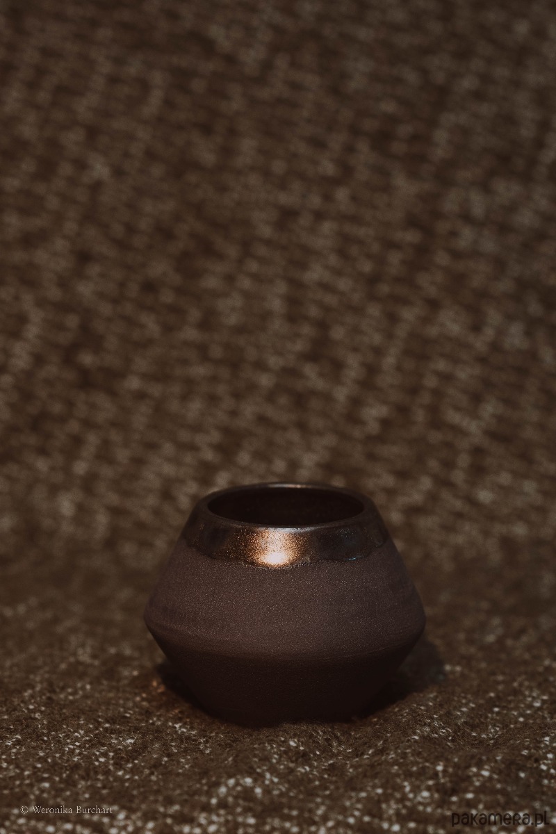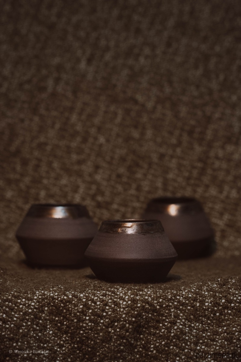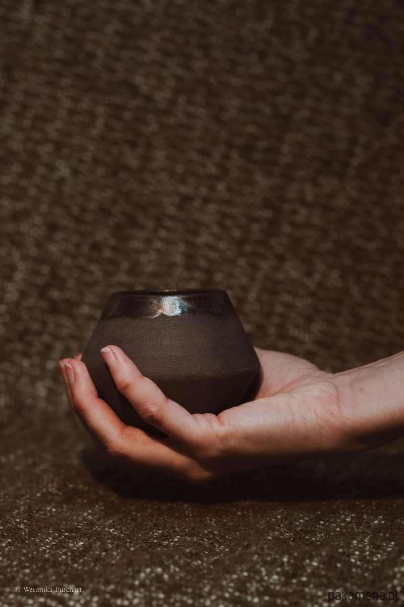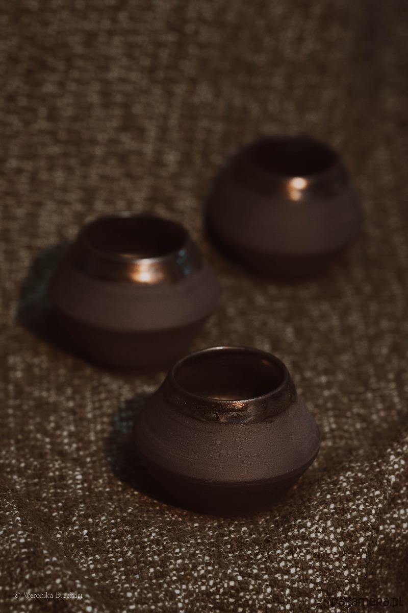 Wykonana ze szlachetnej, czarnej gliny i wypalana w temperaturze 1220°C, co gwarantuje wyjątkową trwałość (odporna także na gorące napoje). Zewnętrzna, nieszkliwiona powierzchnia jest celowo surowa i chropowata. Jej naturalna faktura dostarcza przyjemnych, ugruntowujących doznań sensorycznych w dłoni. Wnętrze czarki oraz delikatny rant w okolicach ust zostały pokryte eleganckim, miedziano-metalicznym szkliwem. Ten lśniący, głęboki blask tworzy luksusowy kontrast z matową czernią na zewnątrz.