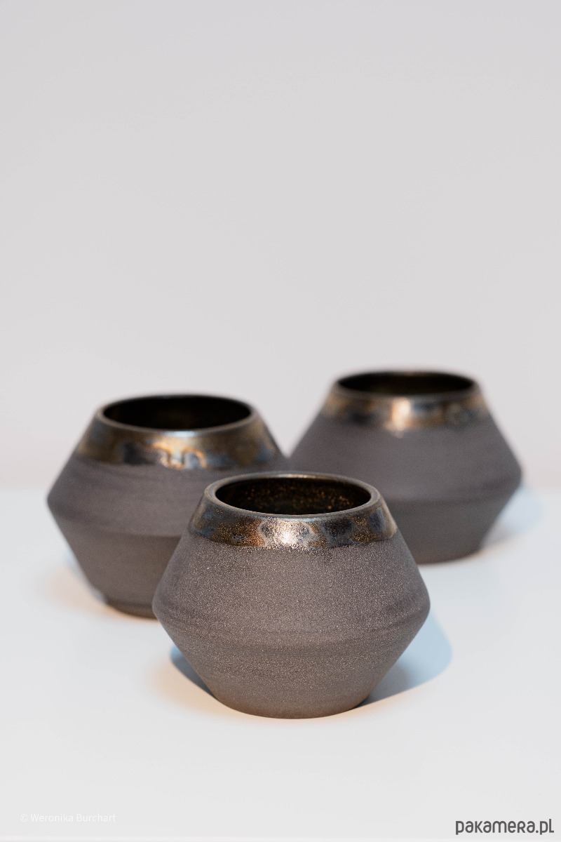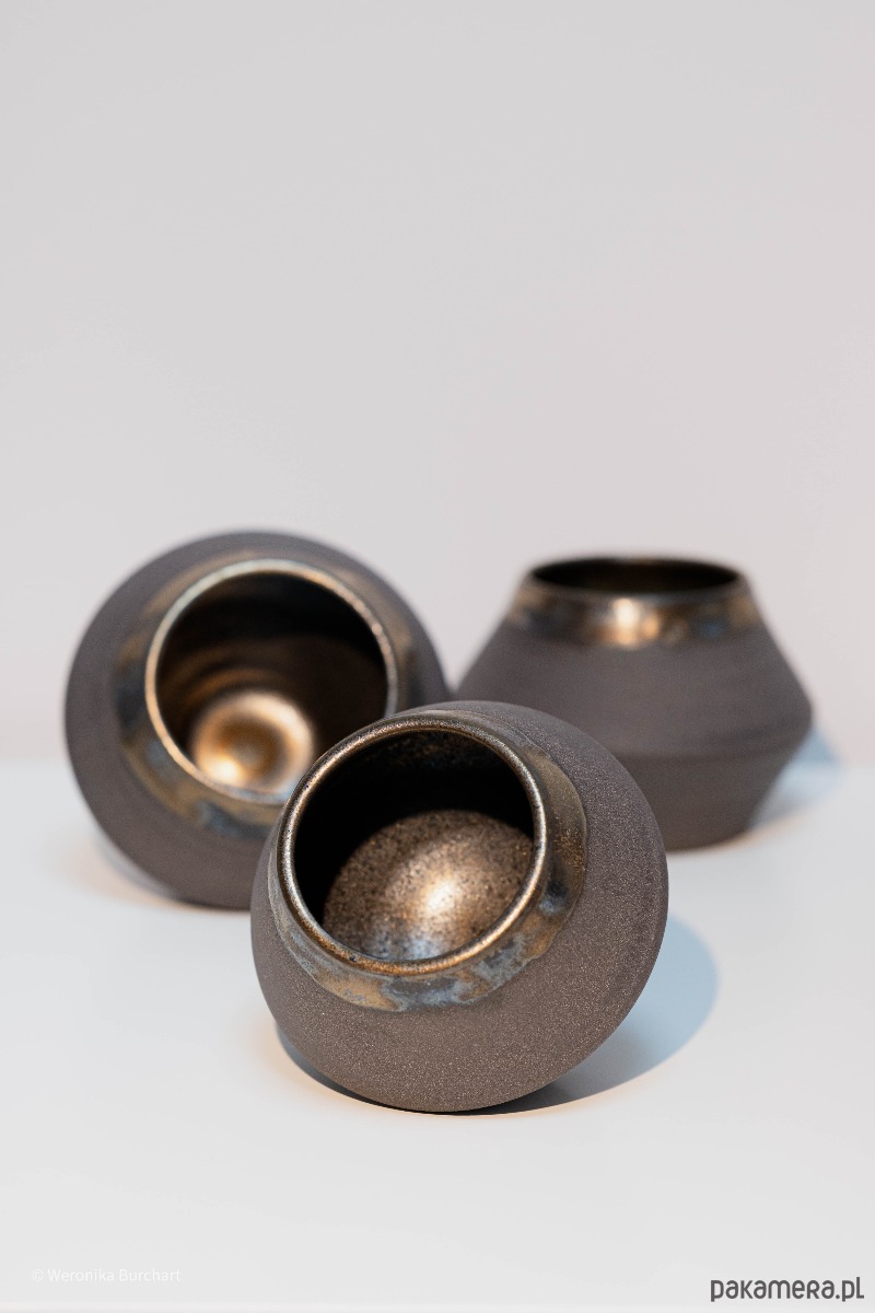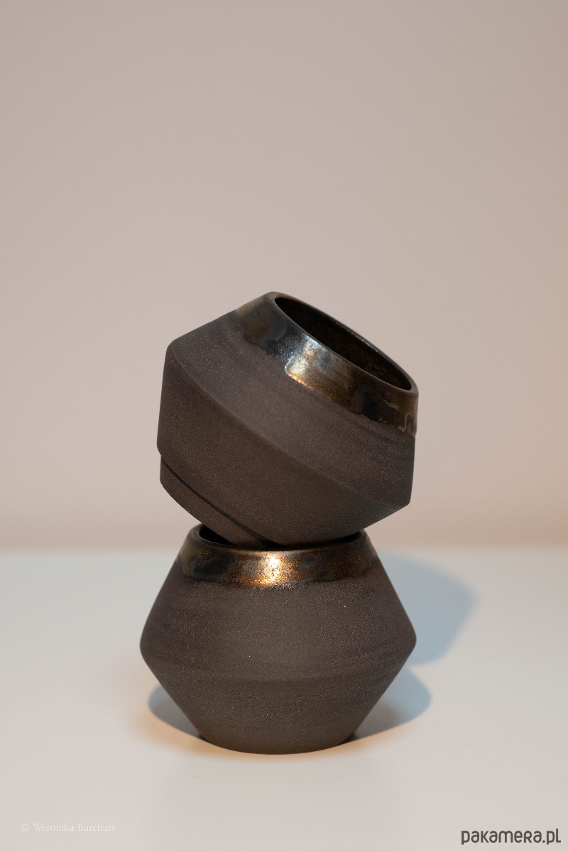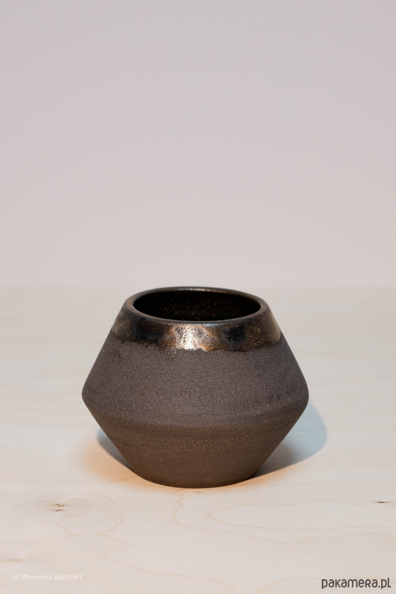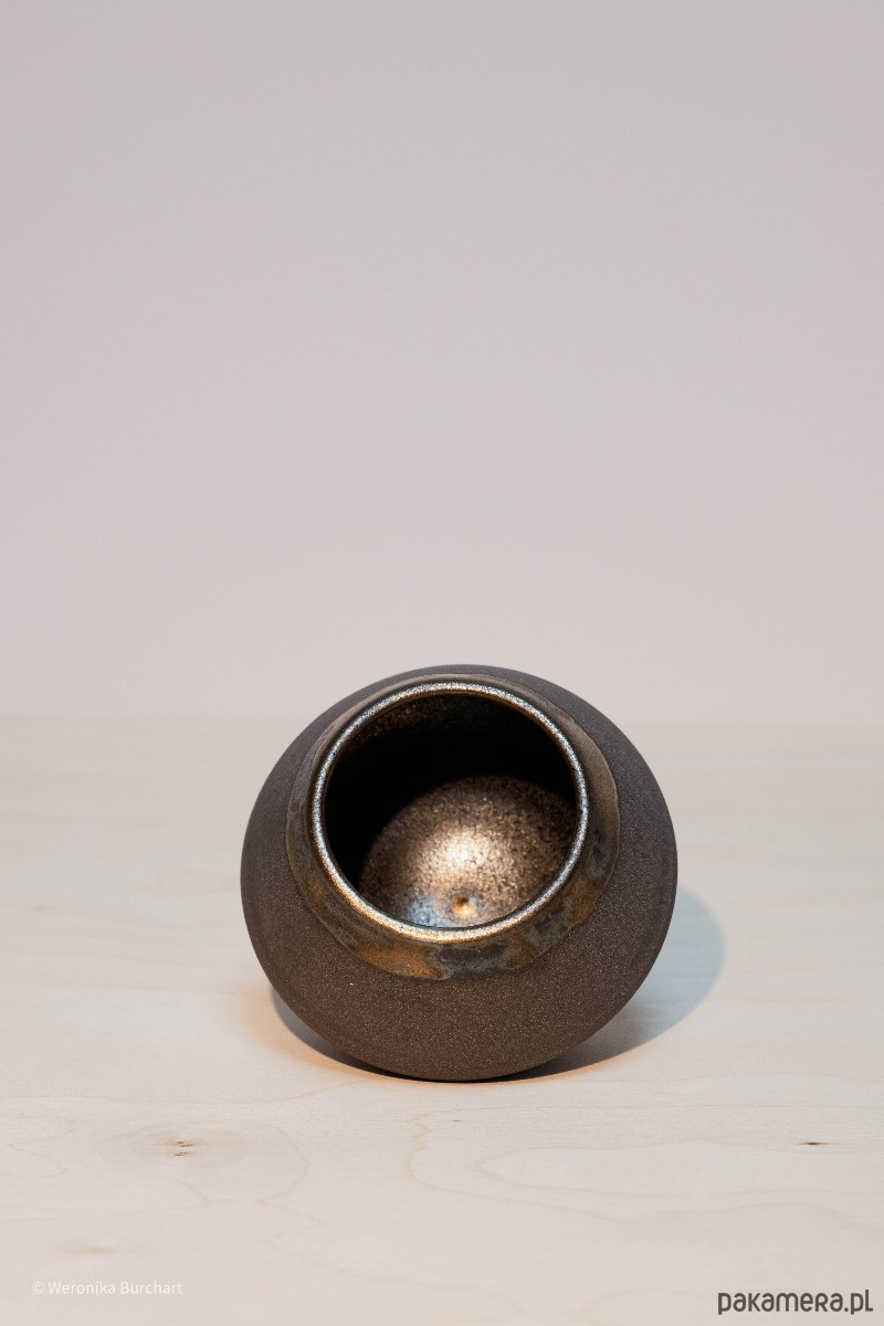 Wykonana ze szlachetnej, czarnej gliny i wypalana w temperaturze 1220°C, co gwarantuje wyjątkową trwałość (odporna także na gorące napoje). Zewnętrzna, nieszkliwiona powierzchnia jest celowo surowa i chropowata. Jej naturalna faktura dostarcza przyjemnych, ugruntowujących doznań sensorycznych w dłoni. Wnętrze czarki oraz delikatny rant w okolicach ust zostały pokryte eleganckim, miedziano-metalicznym szkliwem. Ten lśniący, głęboki blask tworzy luksusowy kontrast z matową czernią na zewnątrz.