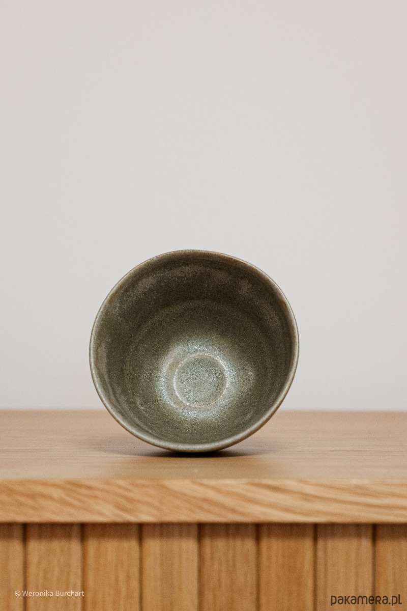 Czarka została pokryta matowym szkliwem w głębokim kolorze szałwii. Ta uspokajająca barwa nawiązuje do natury i medytacji, wprowadzając w stan uważności i wyciszenia. Jej bazą jest czarna glina, której struktura jest widoczna pod szkliwem, dodając naczyniu ziemistego, rzemieślniczego charakteru. Czarka ma foremny, minimalistyczny kształt, delikatnie rozszerzający się ku górze. Taka forma jest idealna do wygodnego i swobodnego ubijania Matchy bambusową miotełką lub do nalania ubitej już z Chawana.