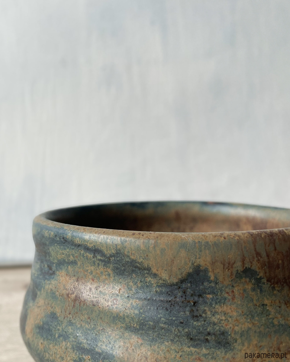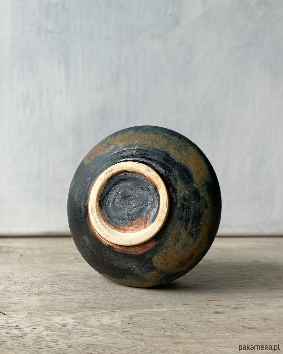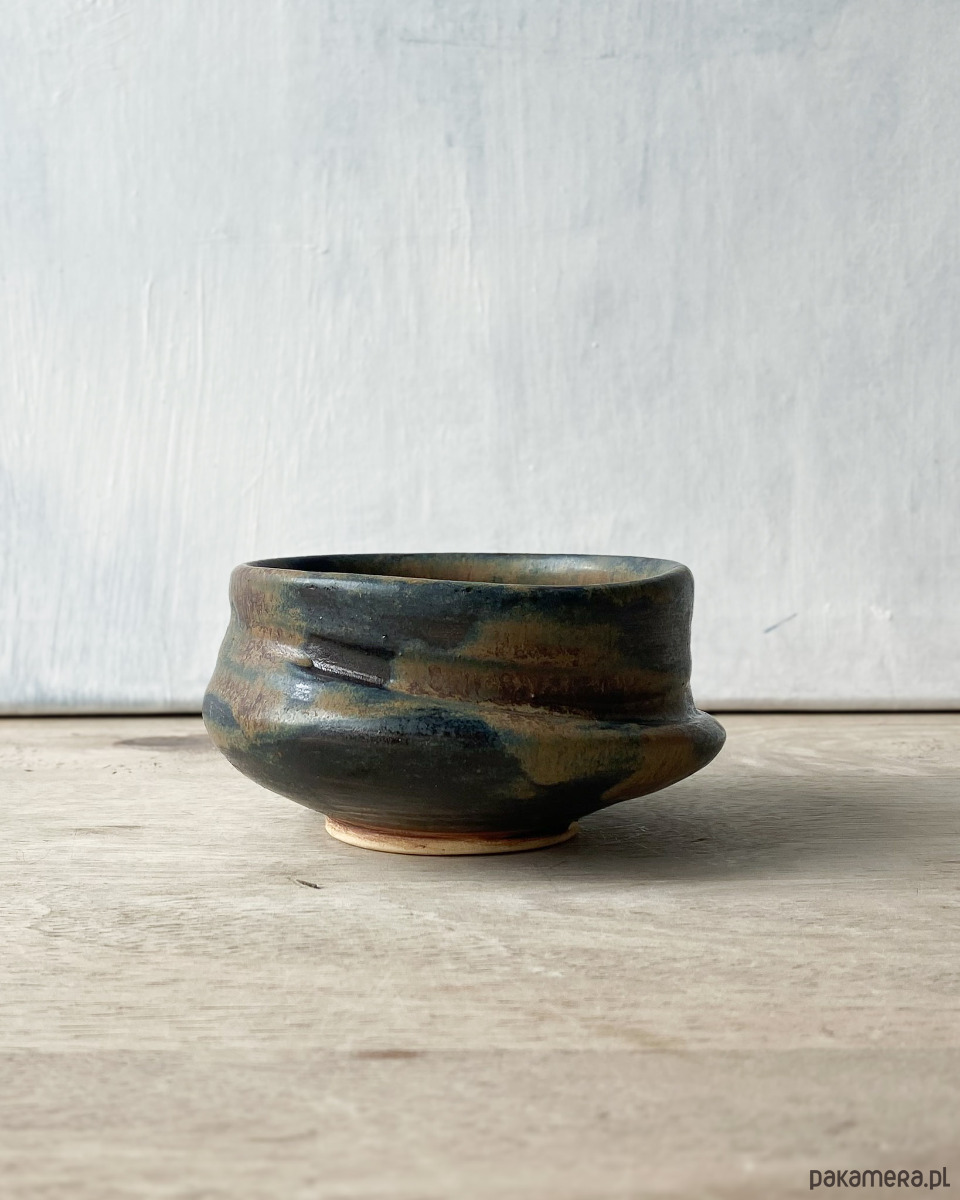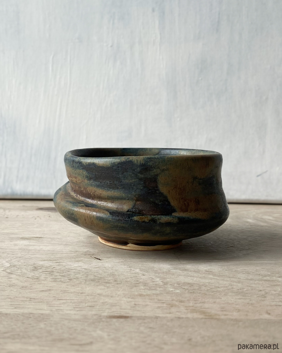 Unikatowa czarka ceramiczna o nieregularnym kształcie w duchu wabi-sabi. Toczona na kole. Kolor czerni i brązów. Czarka wykończona jest matowym szkliwem. Wypalana w temperaturze 1220°C.