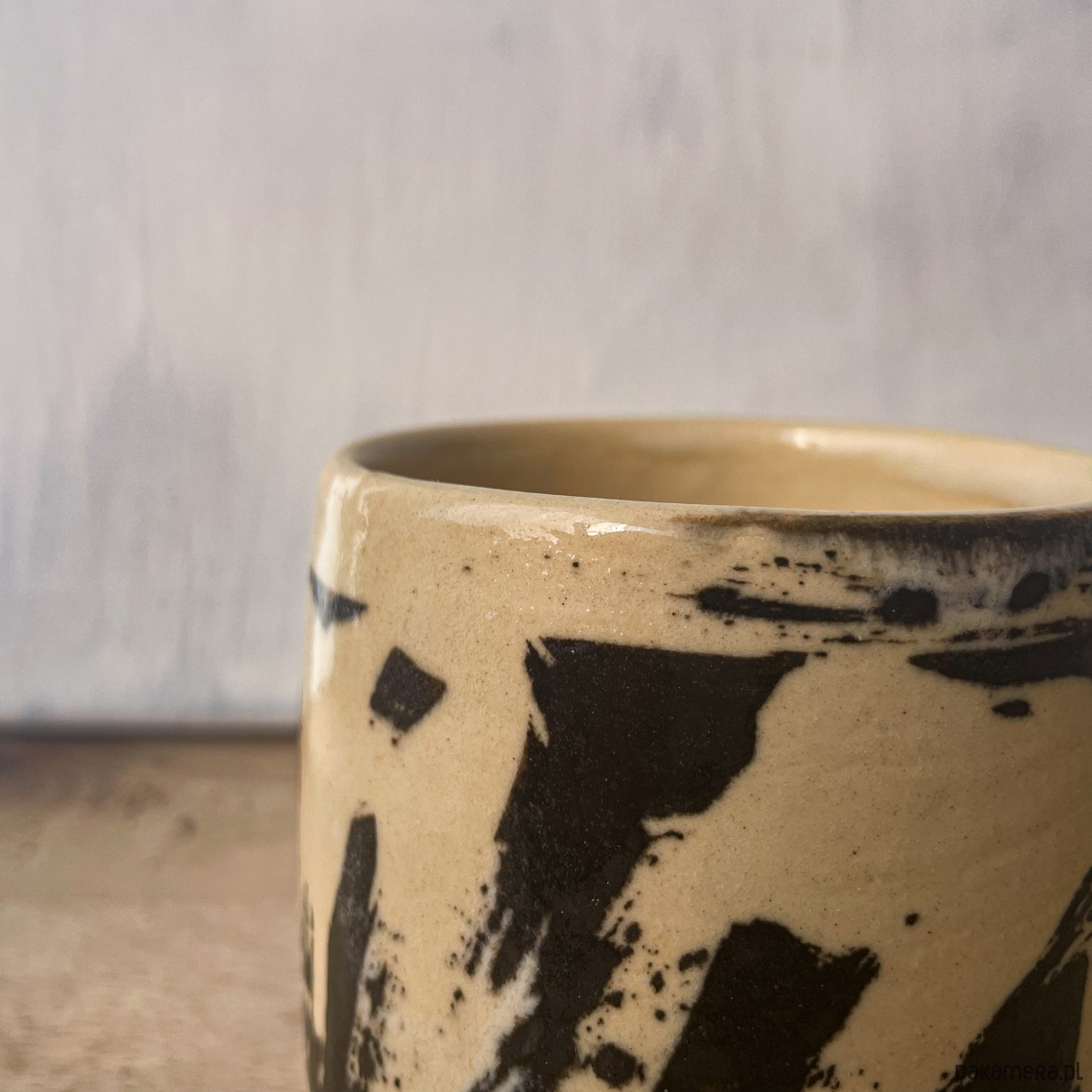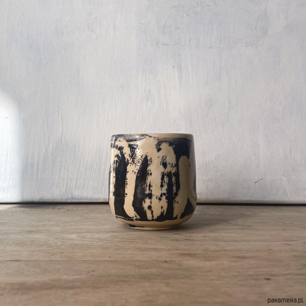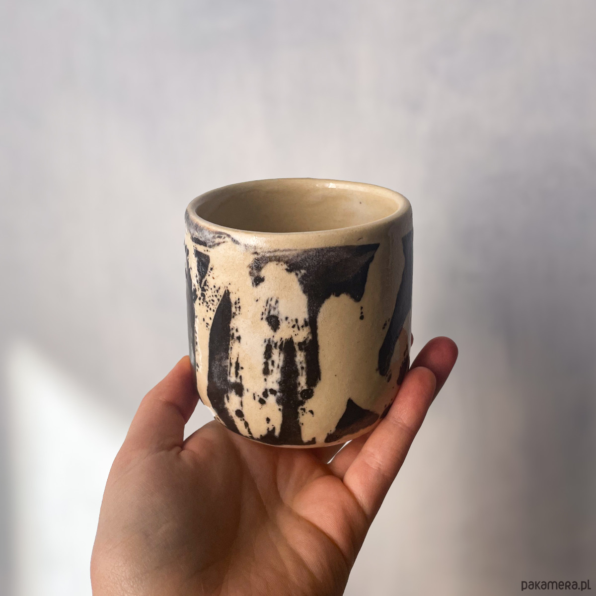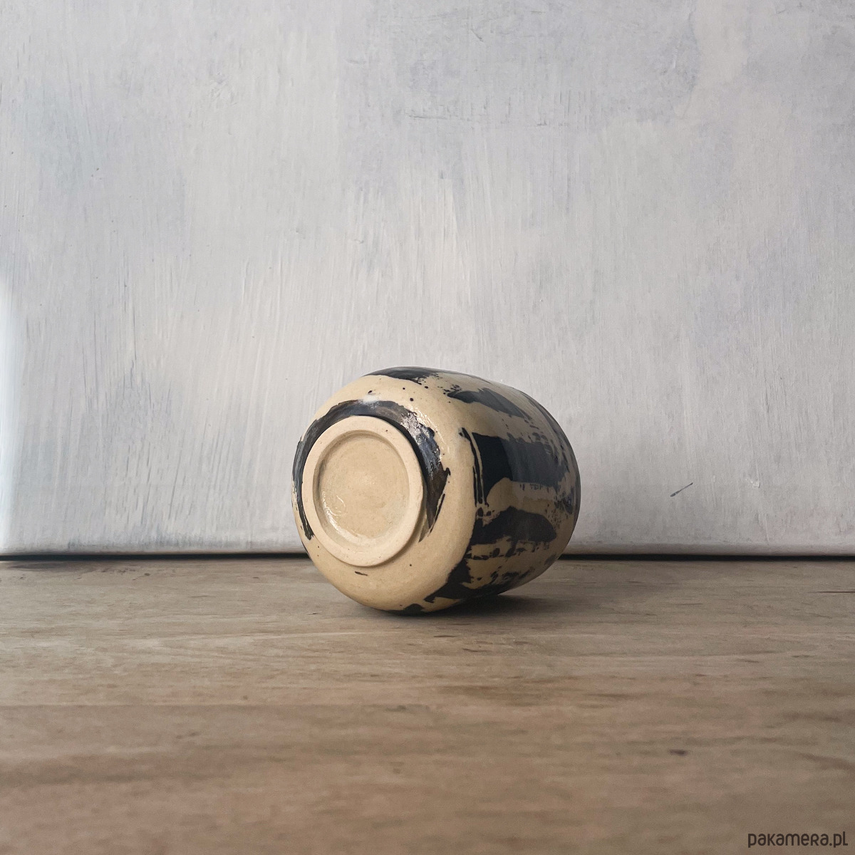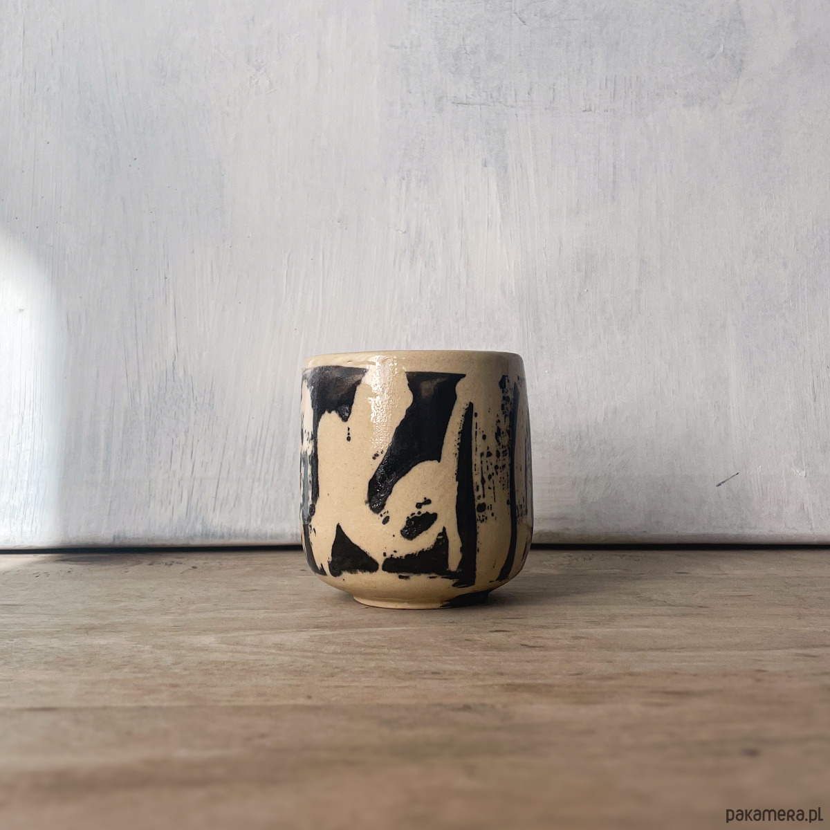 Unikatowa czarka ceramiczna o nieregularnym kształcie w duchu wabi-sabi. Inspirowana japońską kaligrafią i malarstwem tuszowym. Toczona na kole. Kolor czerni z beżem. Czarka wykończona jest matowym szkliwem. Wypalana w temperaturze 1220°C.