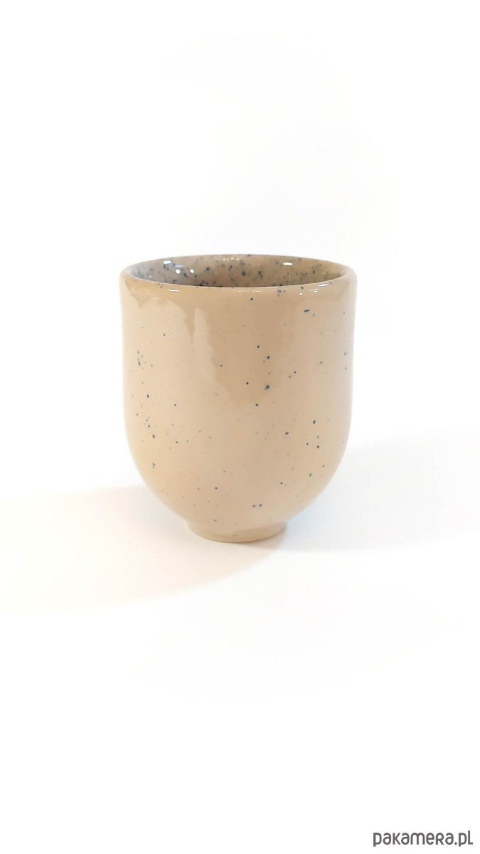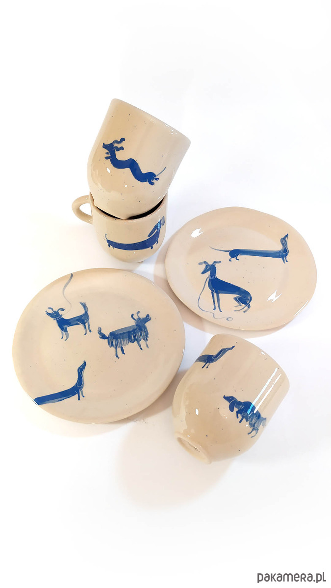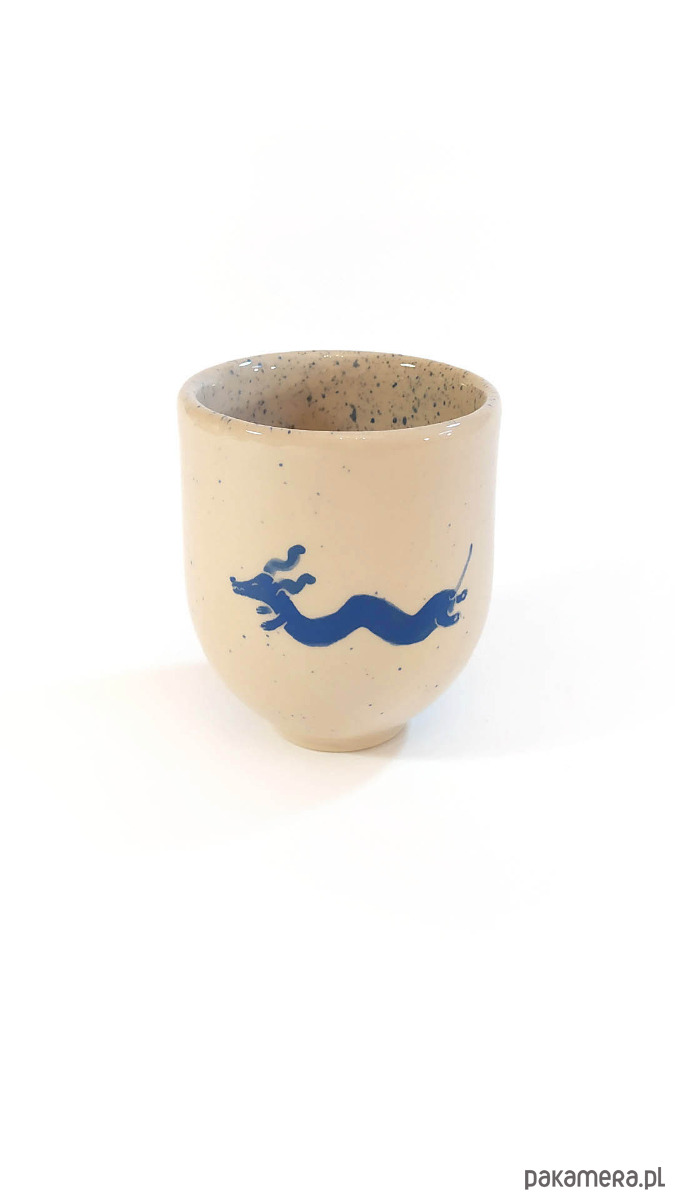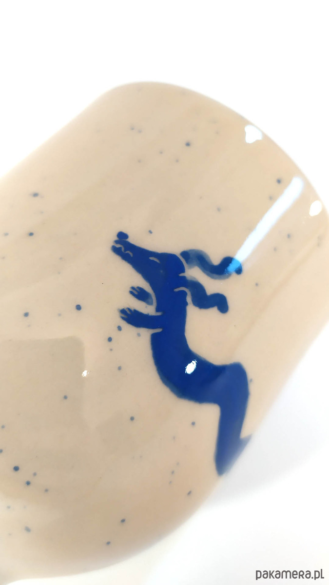 Kubeczek z biegnącym jamniczkiem, motyw malowany ręcznie niebieskimi farbami podszkliwnymi, wnętrze kubka nakrapiane w niebieskim kolorze, wykonany z wysokiej jakości kremowej gliny, 100% handmade. Szkliwiony transparentnym szkliwem. Sygnowany. Kubeczek można myć w zmywarce.
