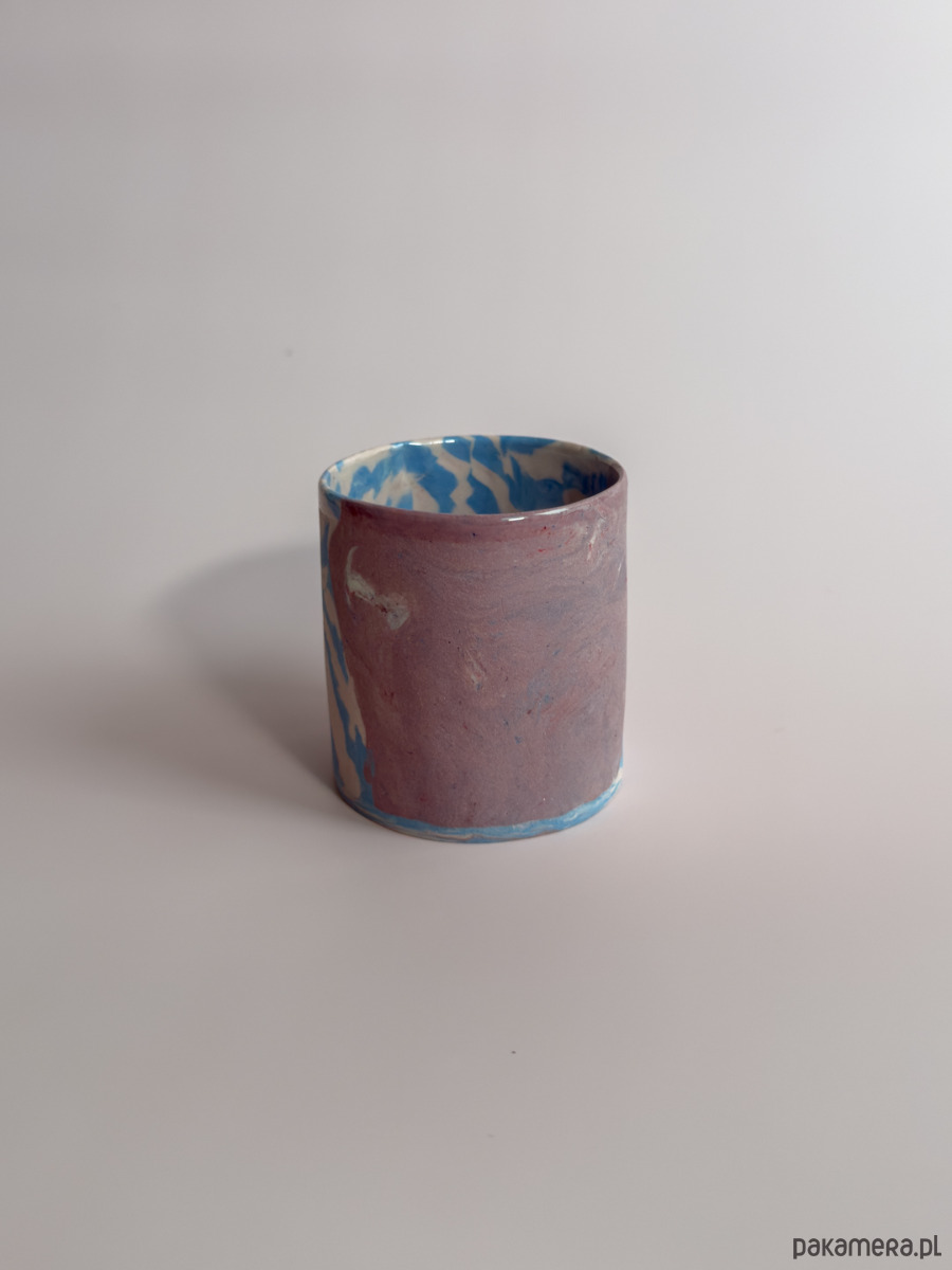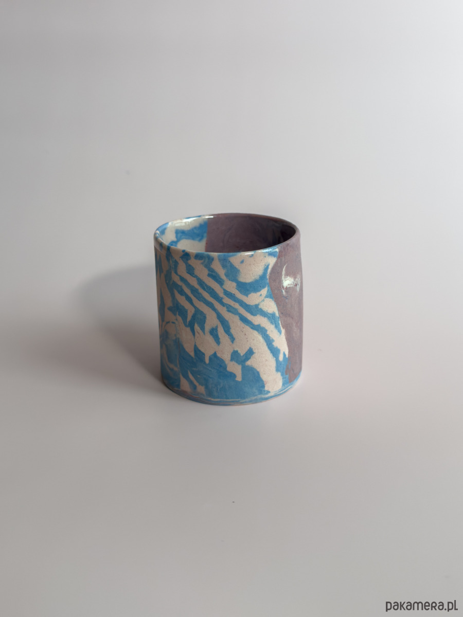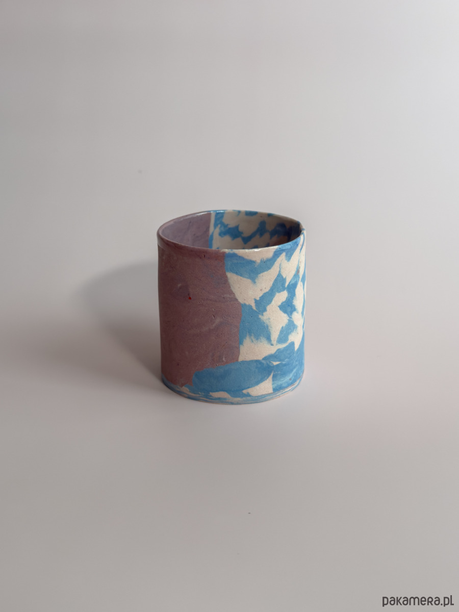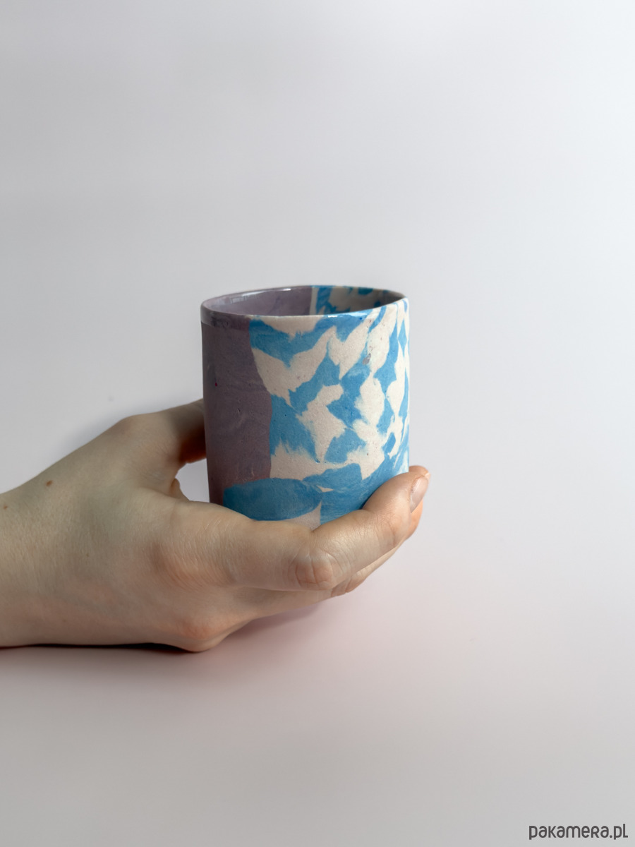 Kubek bez ucha, wykonany ręcznie w technice nerikomi, w której wzór powstaje z połączenia barwionych mas gliny i jest częścią samego materiału.