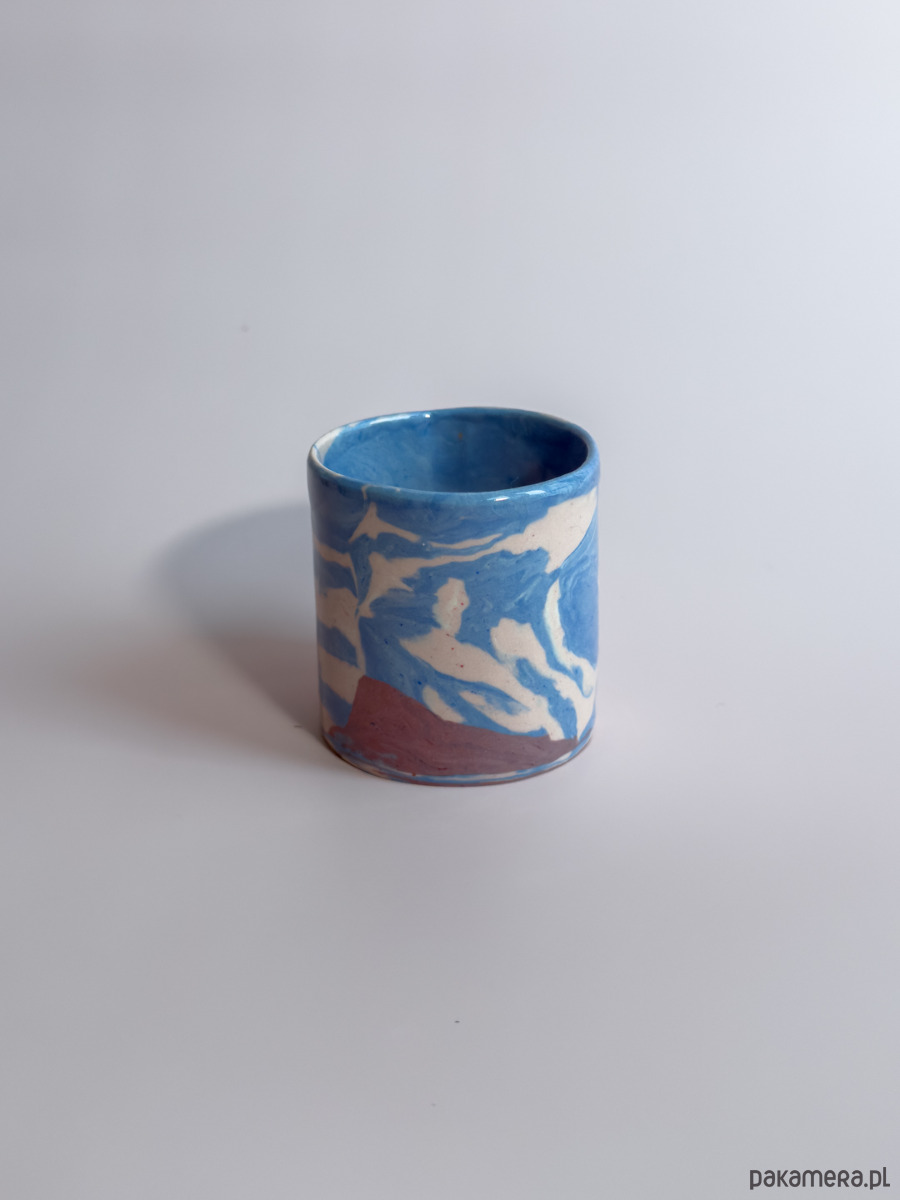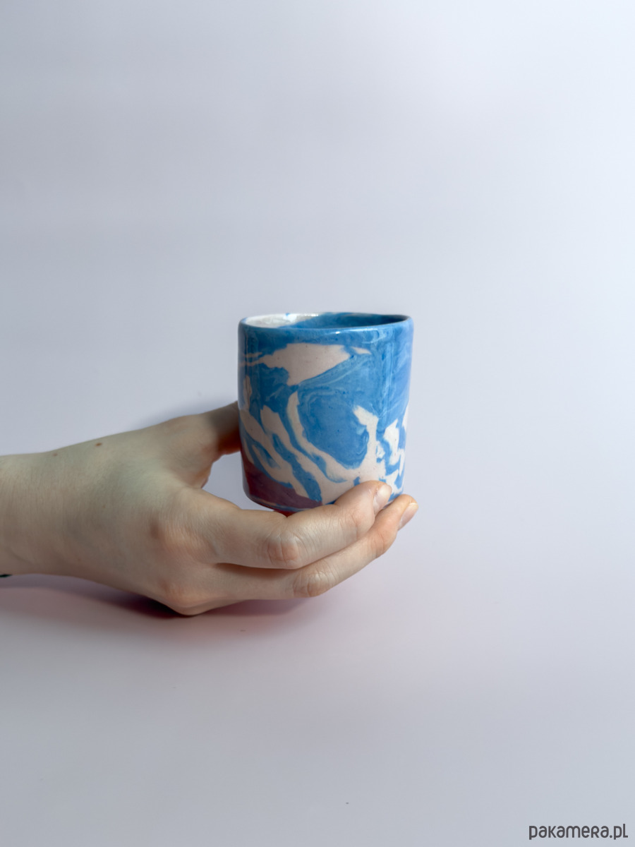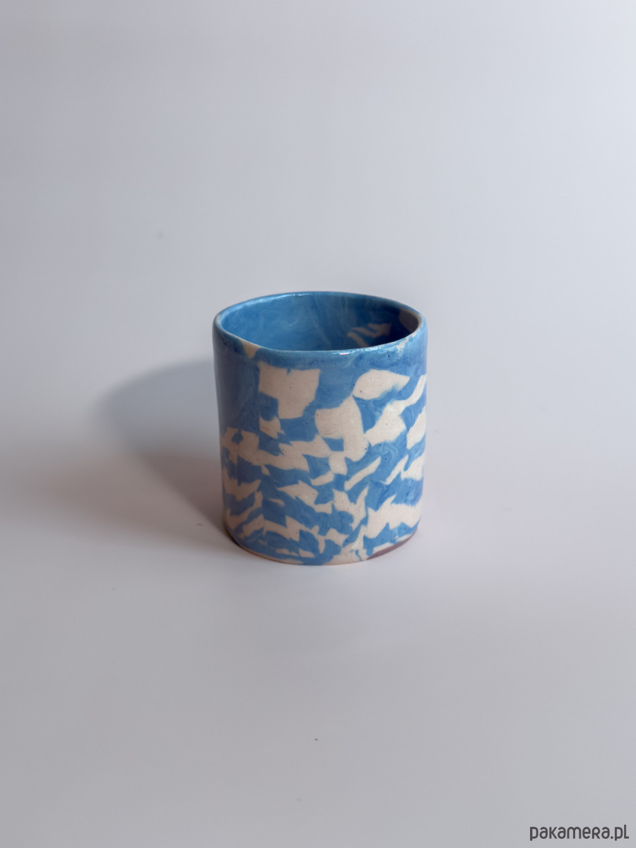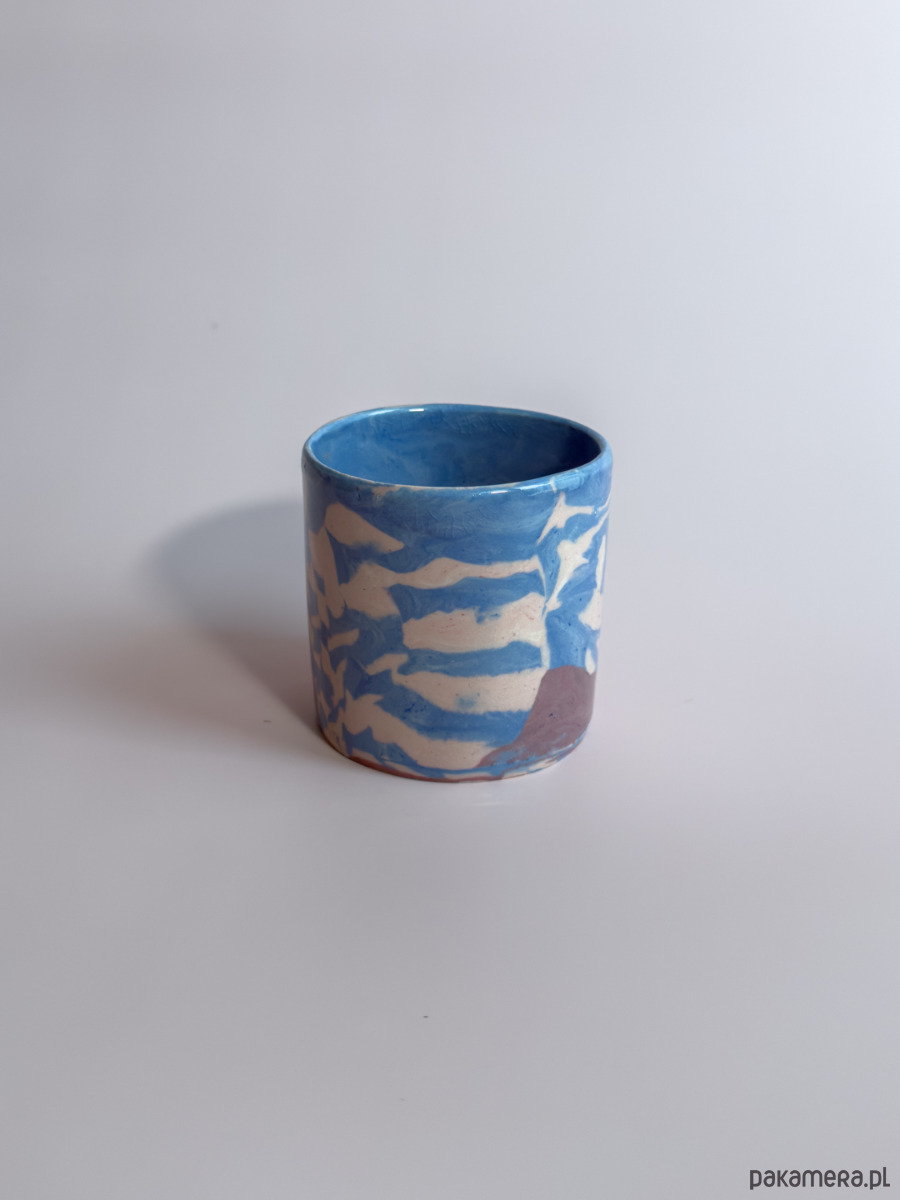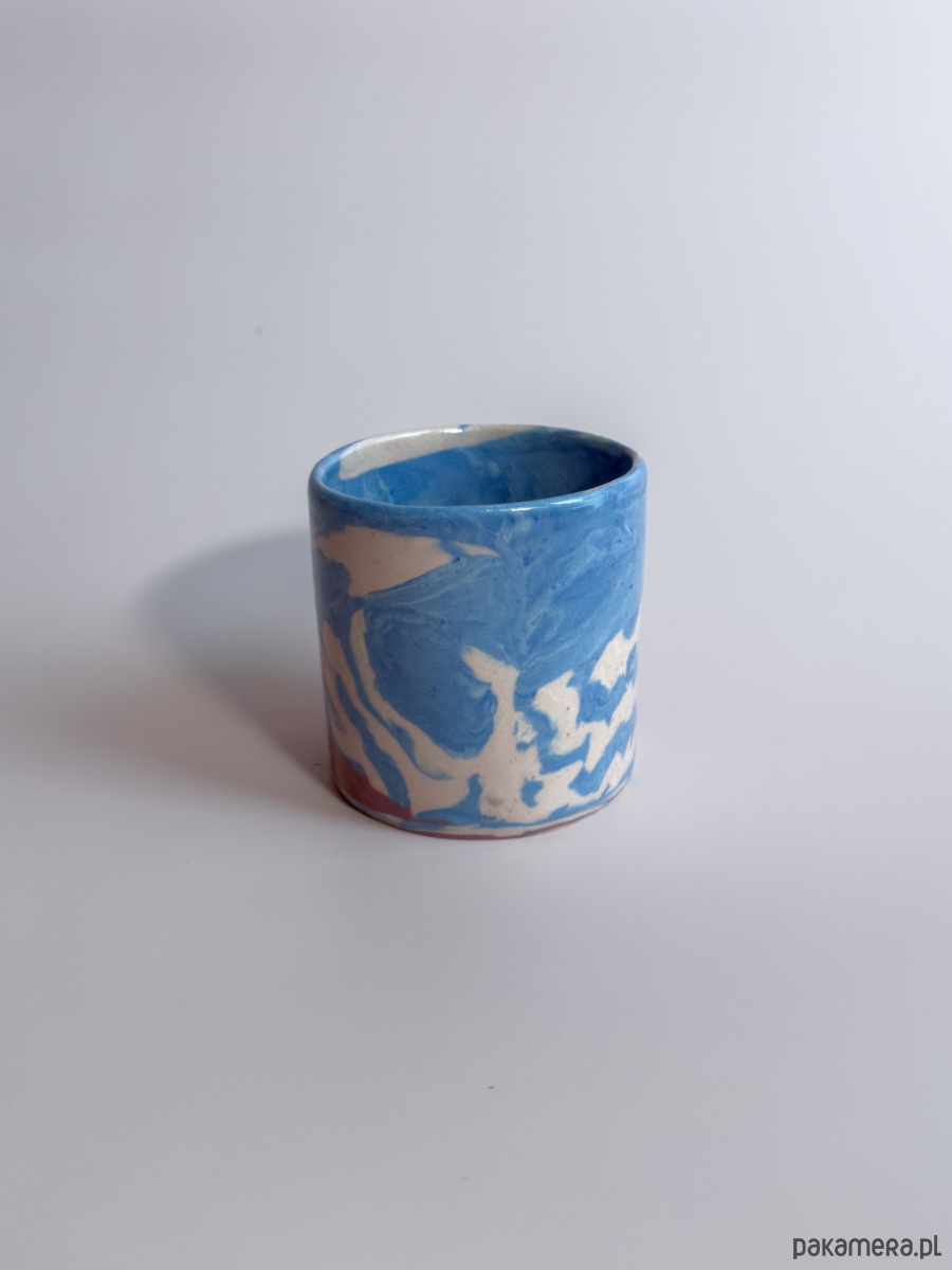 Kubek bez ucha, wykonany ręcznie w technice nerikomi, w której wzór powstaje z połączenia barwionych mas gliny i jest częścią samego materiału.