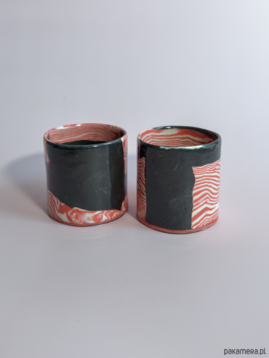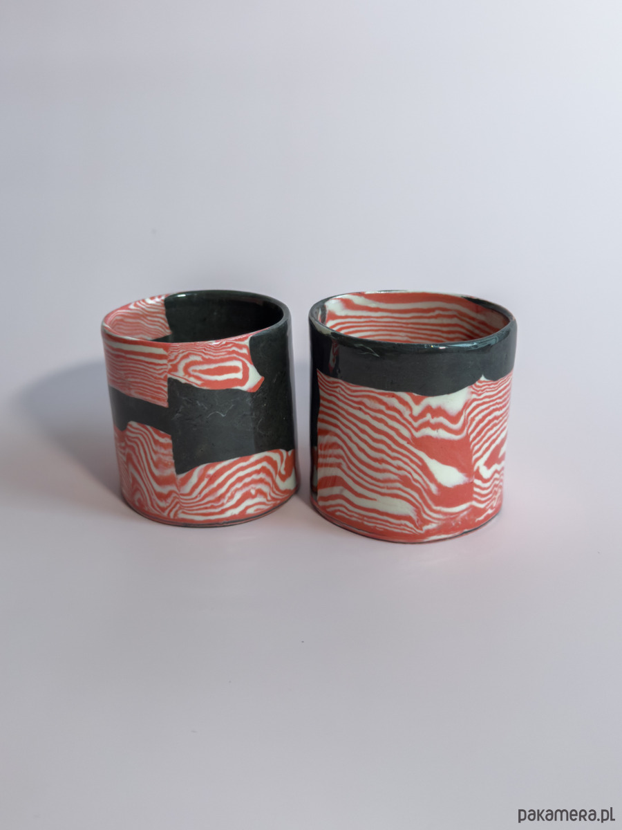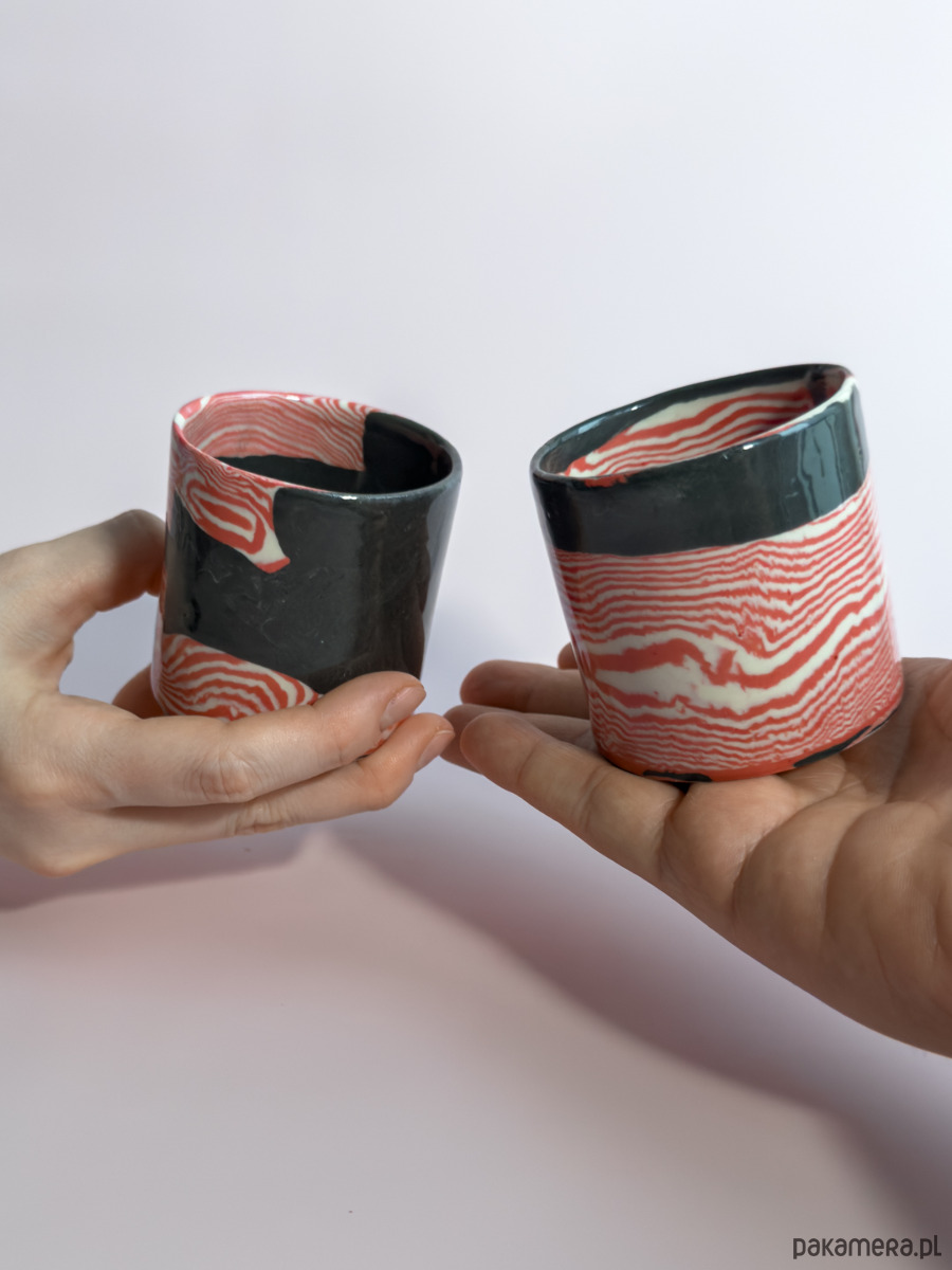 Kubeczki bez ucha, wykonane ręcznie w technice nerikomi, w której wzór powstaje z połączenia barwionych mas gliny i jest częścią samego materiału.