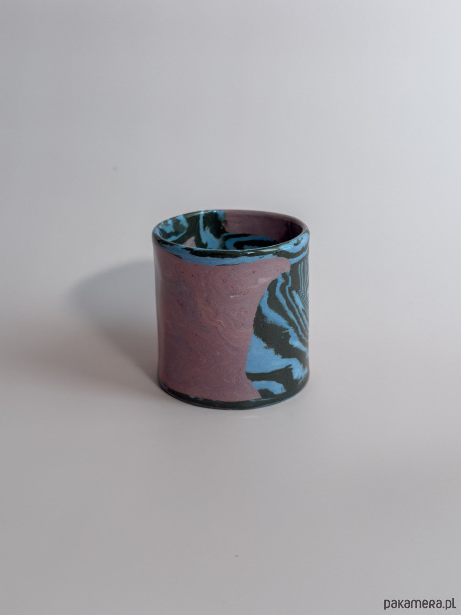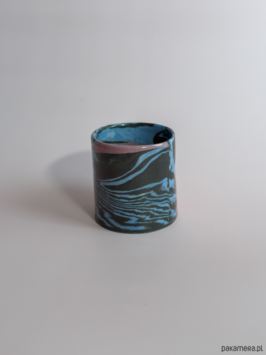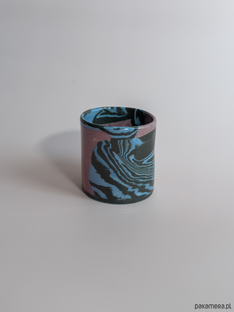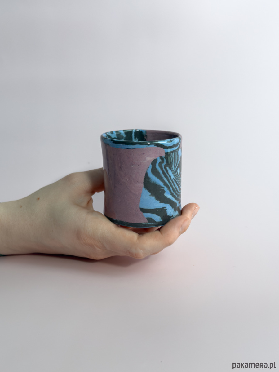 Kubek bez ucha, wykonany ręcznie w technice nerikomi, w której wzór powstaje z połączenia barwionych mas gliny i jest częścią samego materiału.